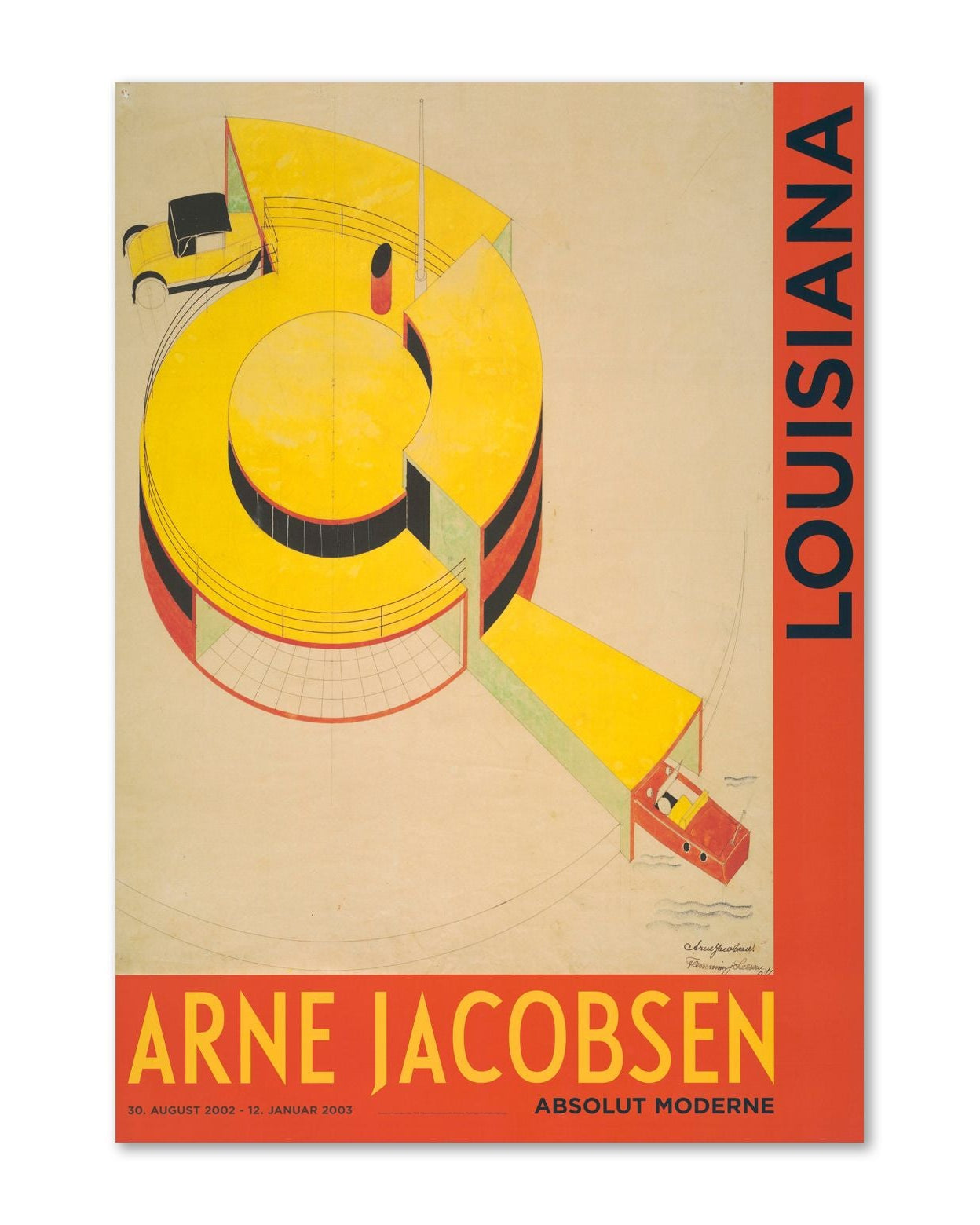 Exhibition poster with a drawing of Fremtidens Hus, (1929), published in connection with the Arne Jacobsen exhibition in Louisiana in 2002 on the occasion of the world-famous architect's 100th birthday. The exhibition was a retrospective tribute to the architect and his modernist design and furniture art, and Fremtiden Hus was Jacobsen's breakthrough as an architect.
