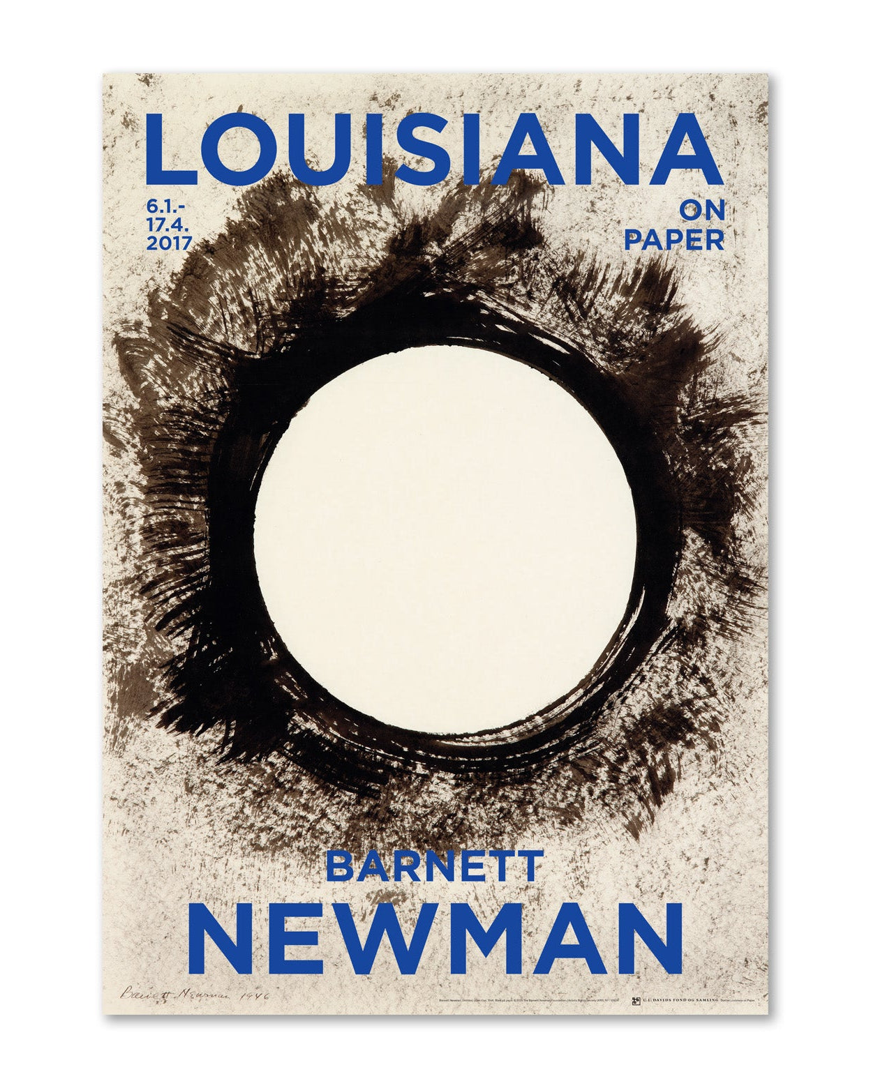 Louisiana poster with the work Untitled. 1946 , in connection with the exhibition series Louisiana on Paper in 2017 with the American artist Barnett Newman (1905-1970). Barnett Newman was one of the prominent figures on the 1950s art scene in New York. Here he worked in a radical and revolutionary way with painting, together with artists such as Willem de Kooning, Jackson Pollock and Mark Rothko. Together, they broke with the dominant European tradition and pioneered the so-called abstract expressionism and Color Field painting for entirely new directions in art. Artists of a new era, Newman believed, had to free themselves from all bonds, dive into chaos and wrest truth from emptiness to reach a “sublime now”.