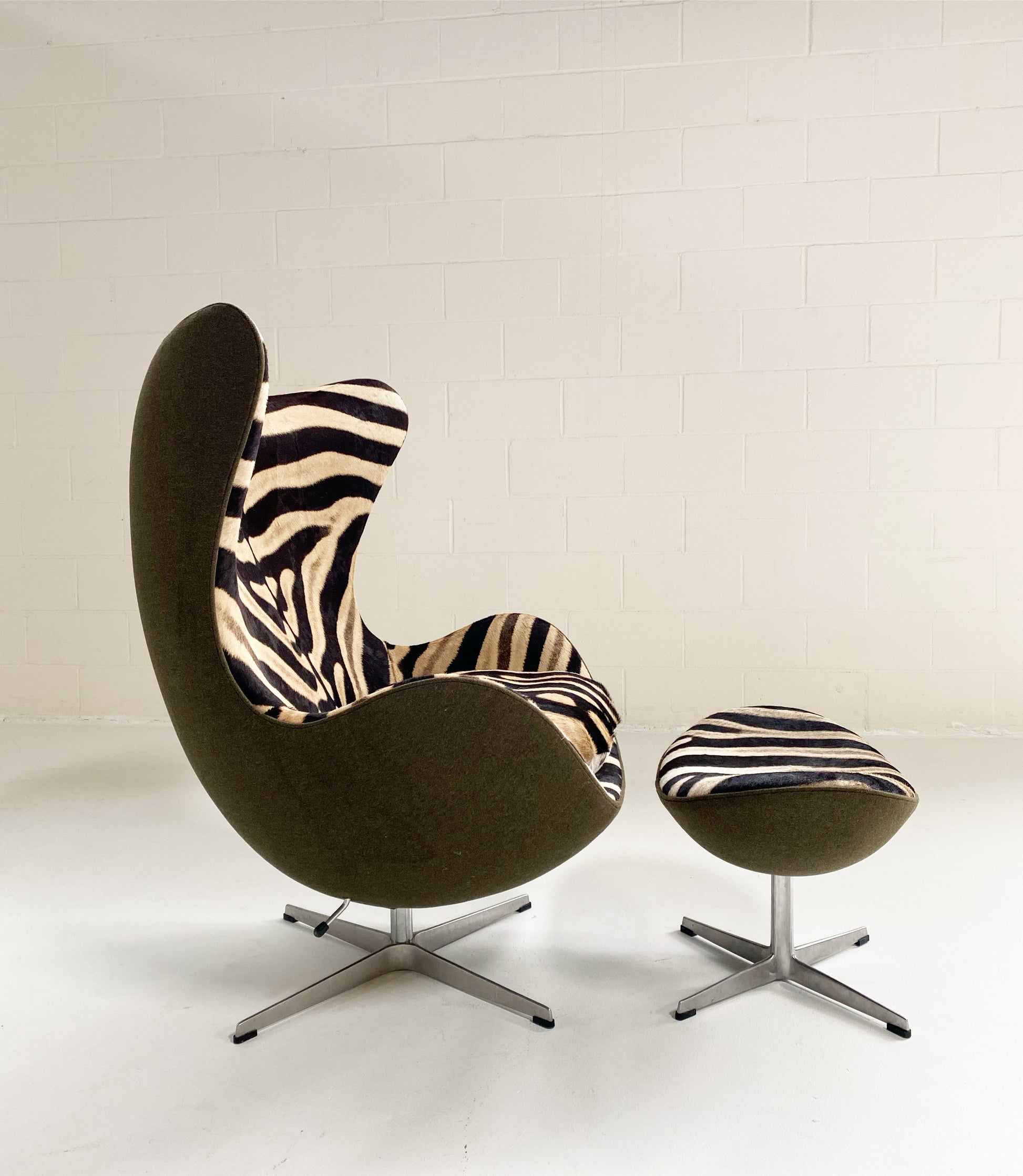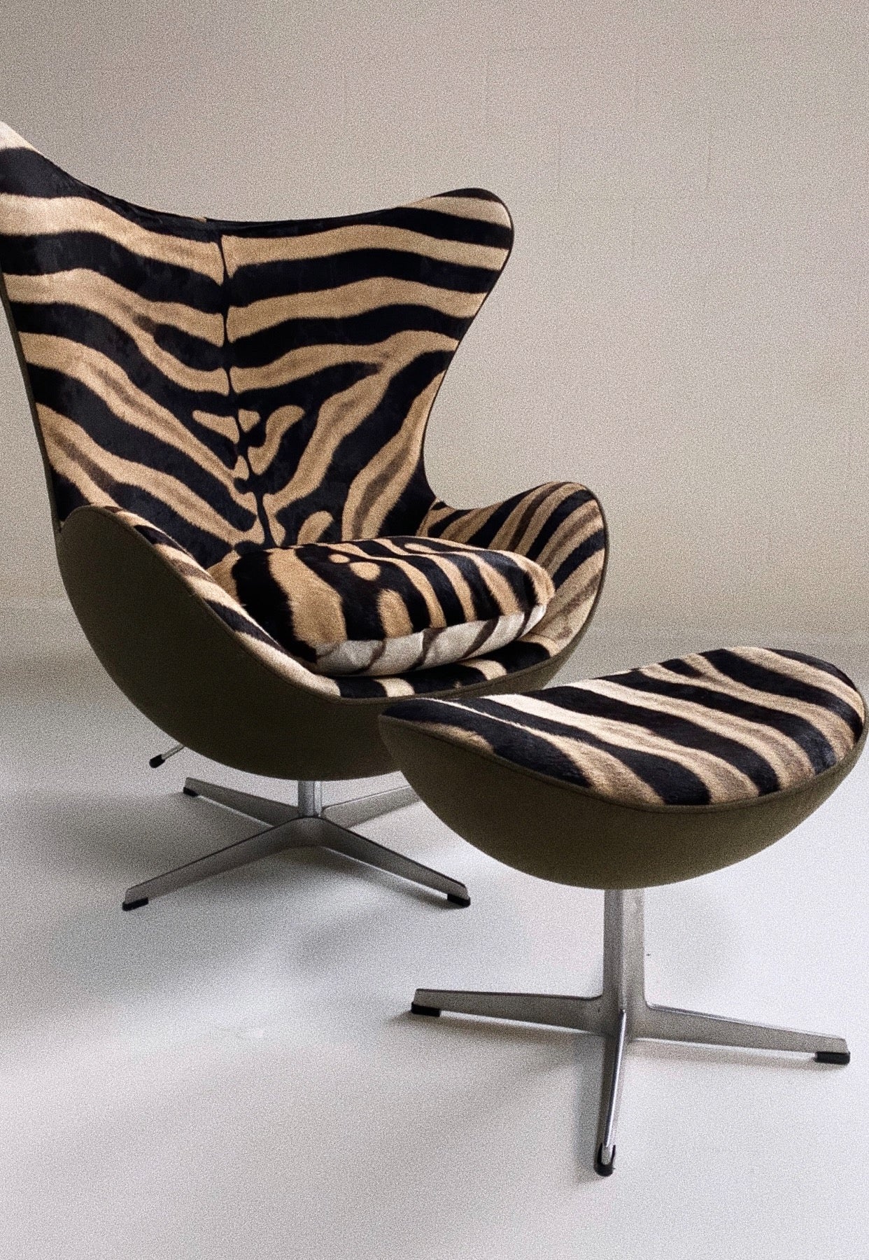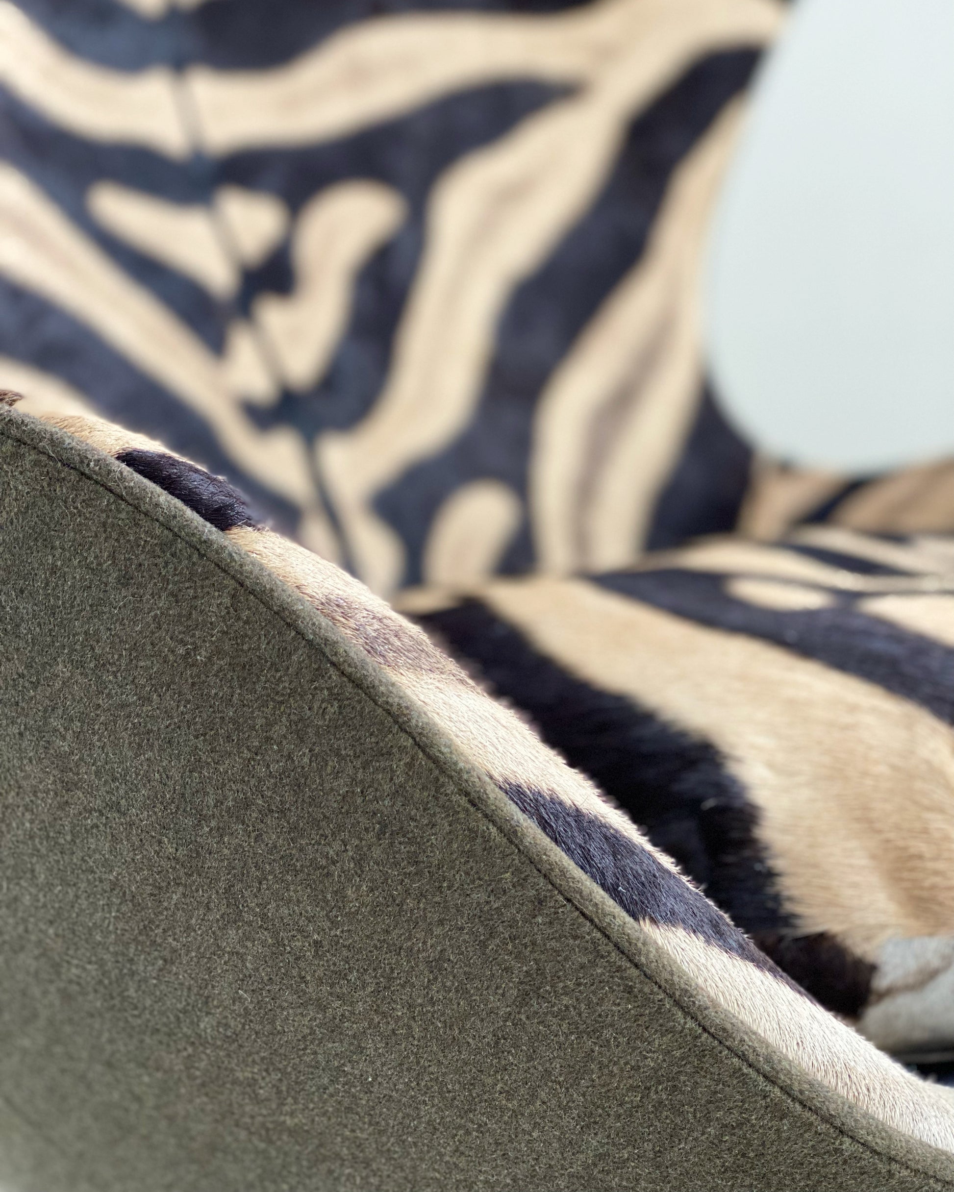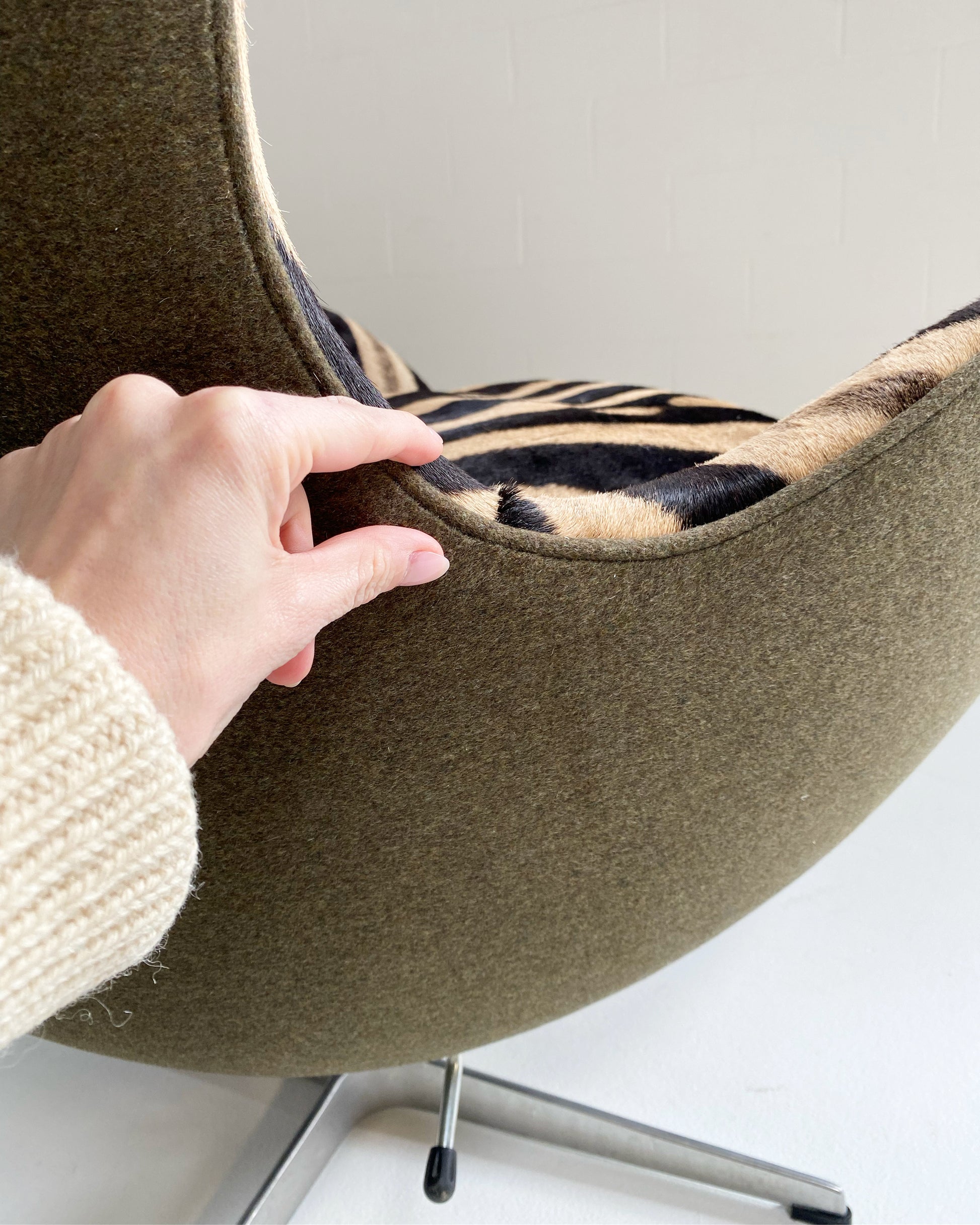 We have an incredible collection of vintage chairs and design icons waiting for a new life. Our upcycled Egg Chairs are some of our most popular designs. This Egg Chair and Ottoman will be restored in zebra hide and finished with your choice of fabric on the back. The example shown is a Loro Piana cashmere wool in olive. We have a collection of exceptional, luxurious fabrics.
