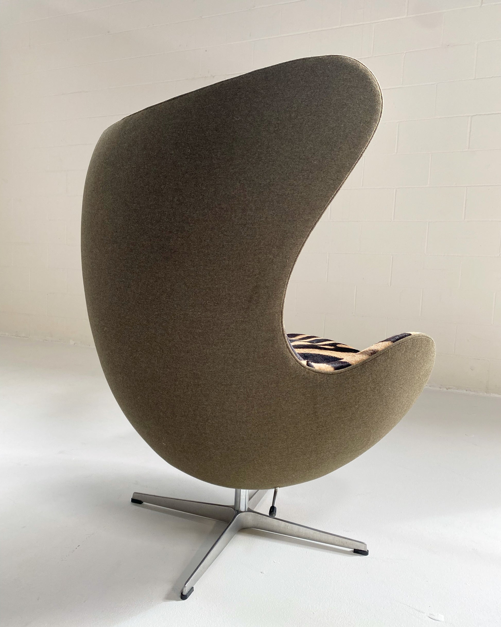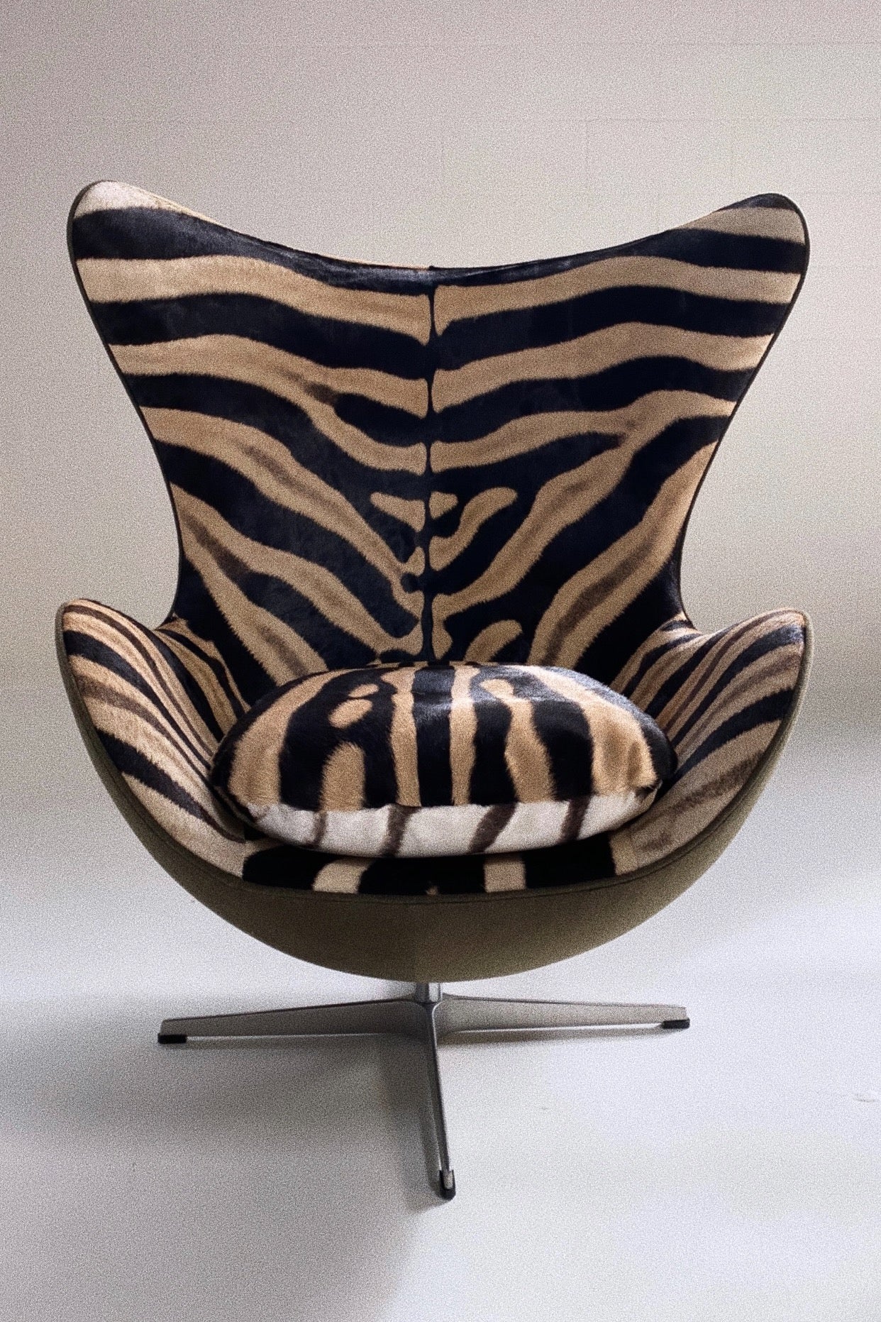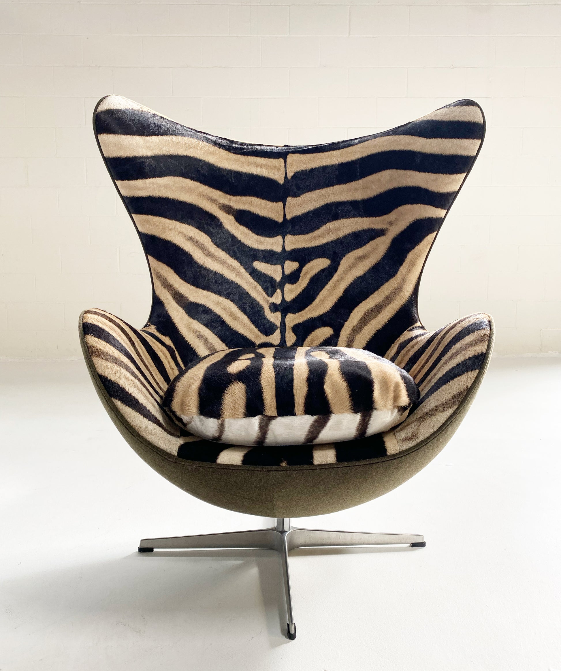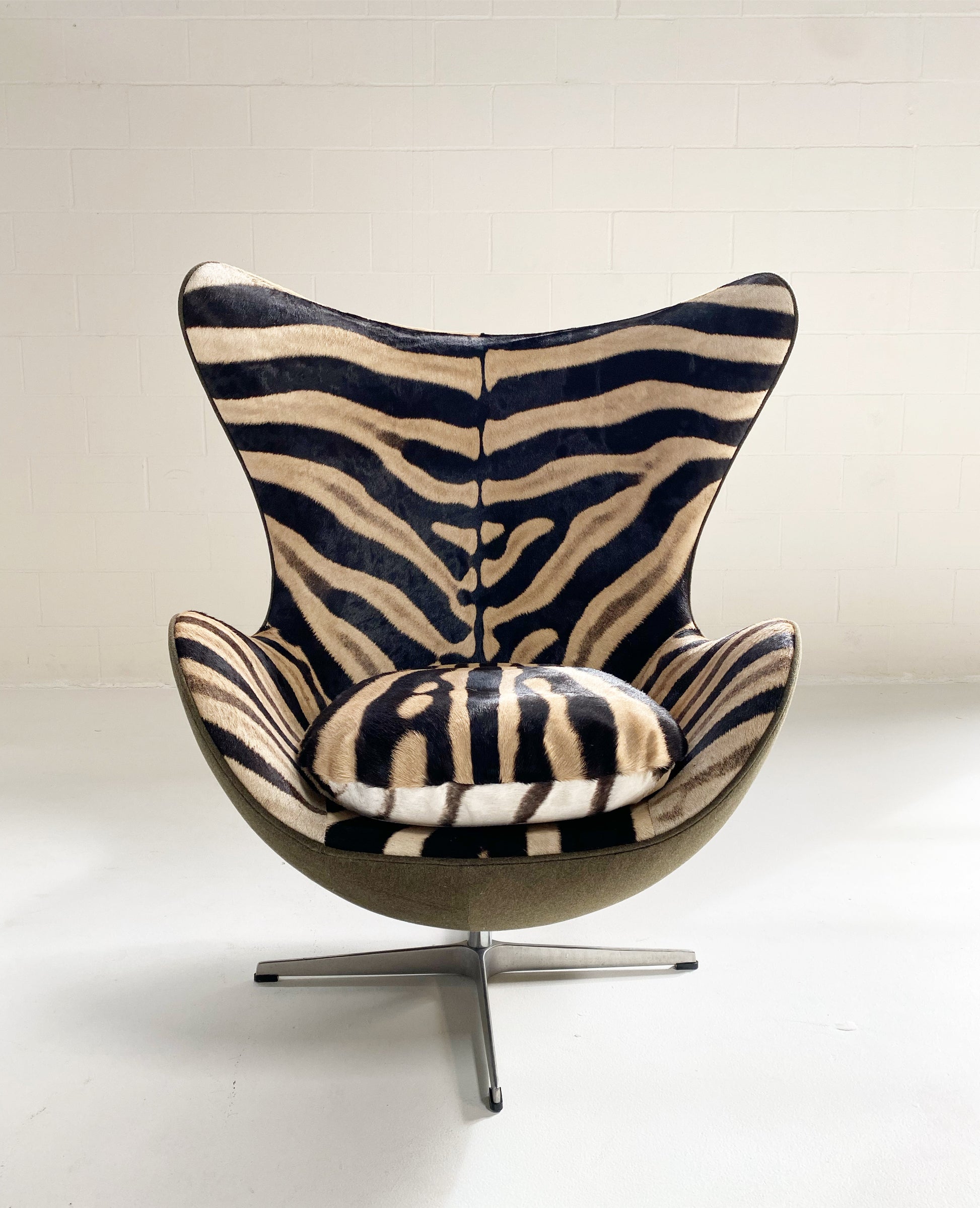 We have an incredible collection of vintage chairs and design icons waiting for a new life. Our upcycled Egg Chairs are some of our most popular designs. This Egg Chair and Ottoman will be restored in zebra hide and finished with your choice of fabric on the back. The example shown is a Loro Piana cashmere wool in olive. We have a collection of exceptional, luxurious fabrics.