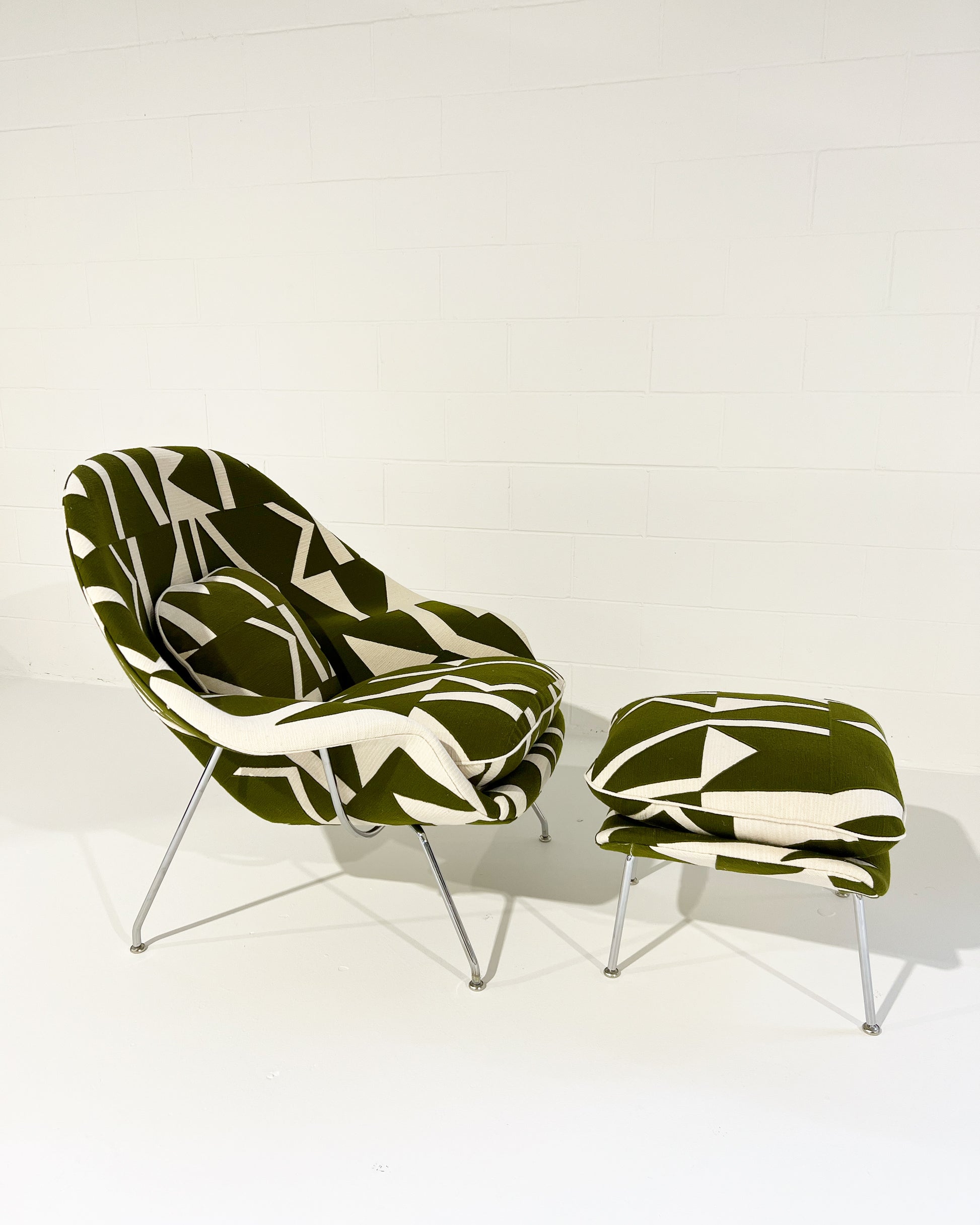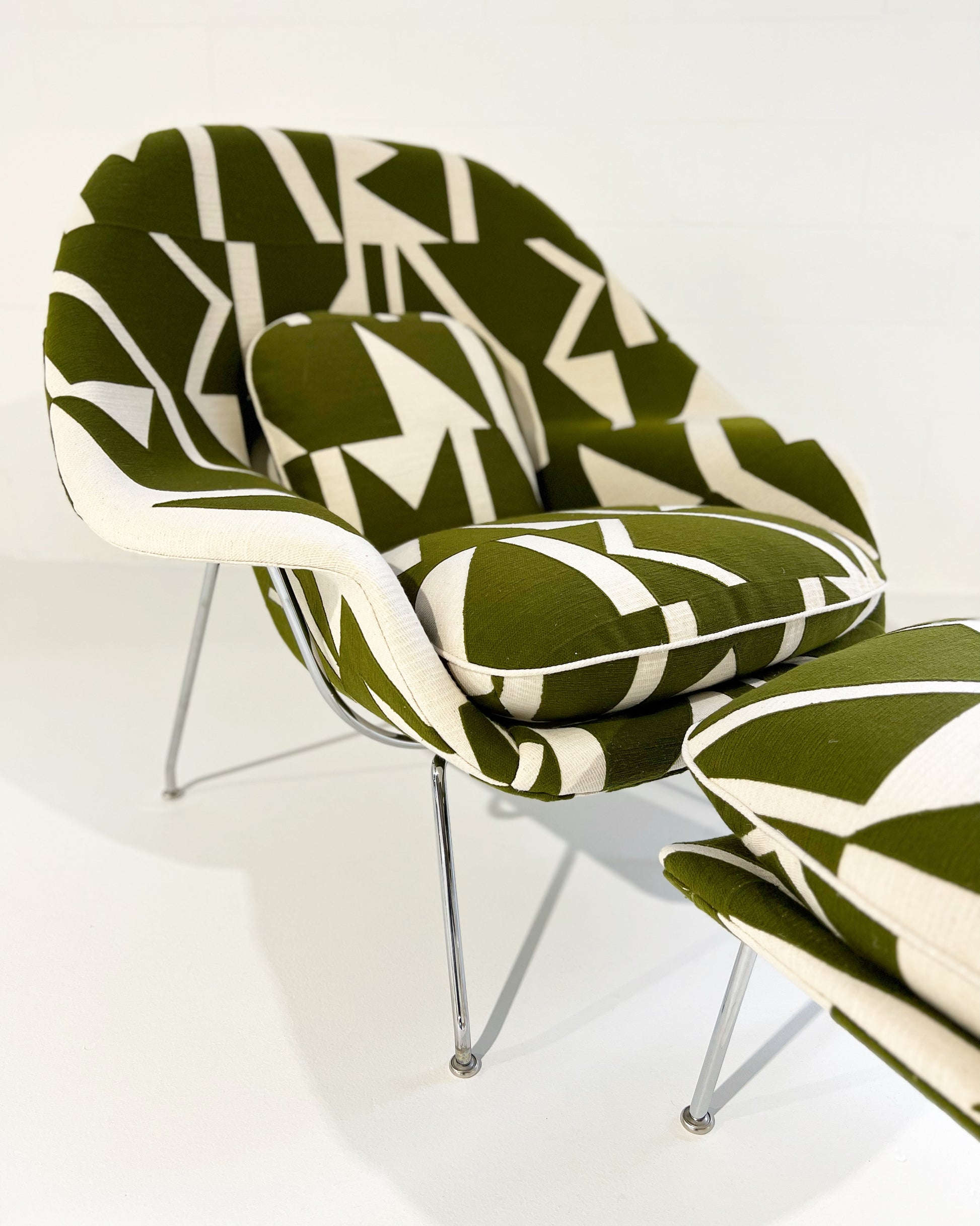 We have an incredible collection of vintage and new Womb chairs waiting for a new life. Our upcycled Womb Chairs are some of our most popular designs. This Womb Chair and Ottoman will be made to order with a favorite Pierre Frey fabric, Wokabi. Please Images are of a Womb Chair and Ottoman we recently finished.