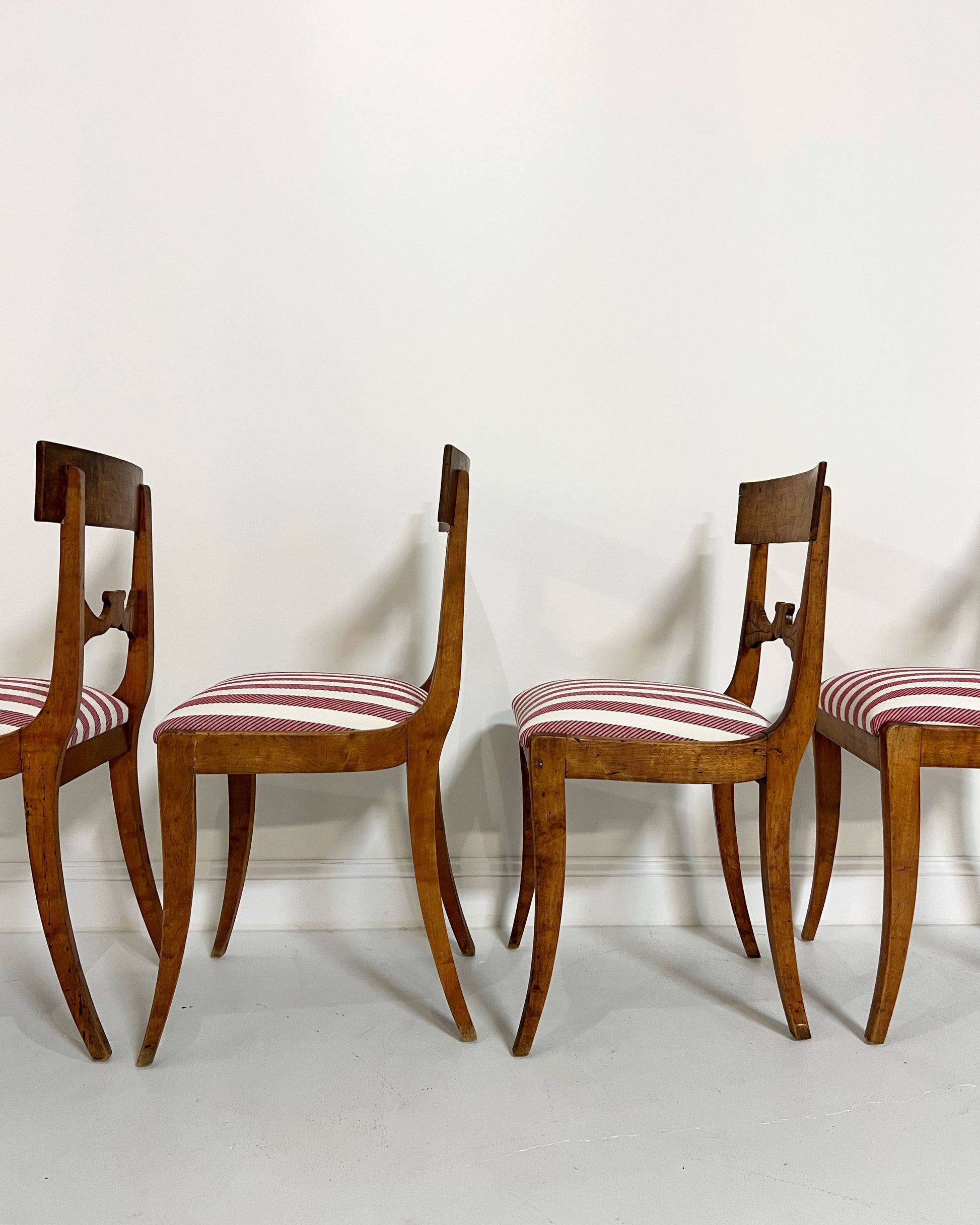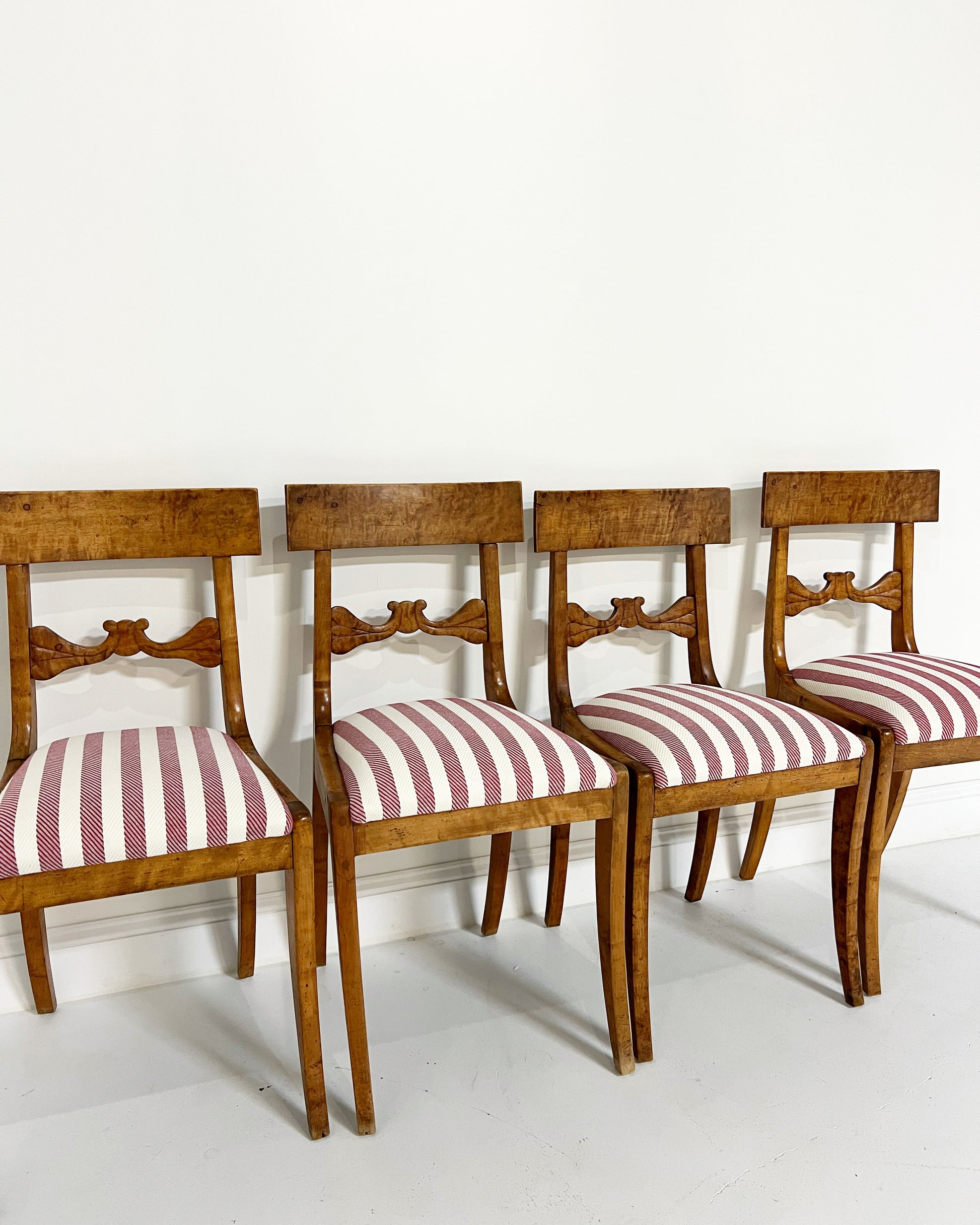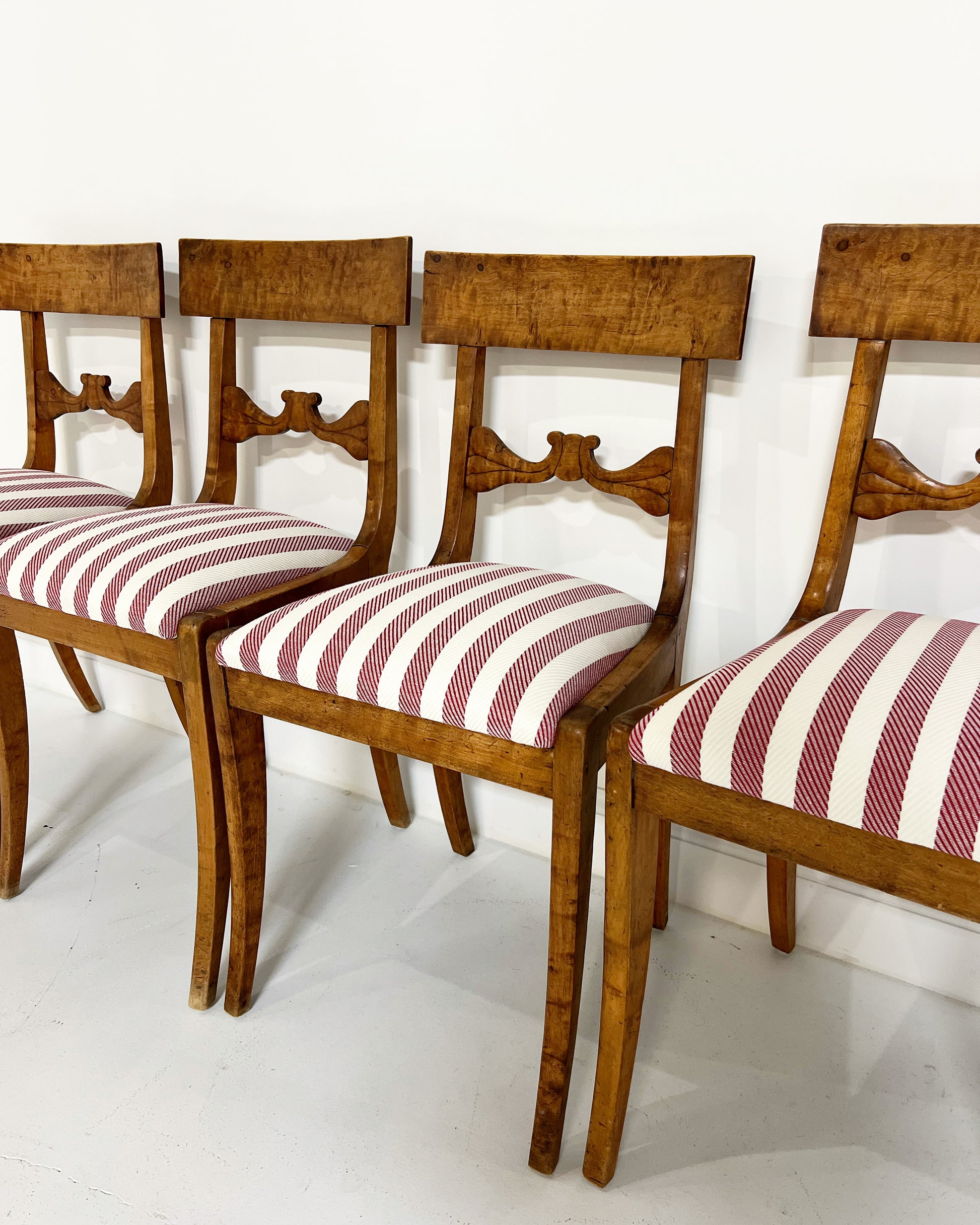 A beautiful set of 4 antique Biedermeier side chairs. We upholstered each chair in a cotton and linen red stripe from the Summer '22 collection of our favorite, Attersee.