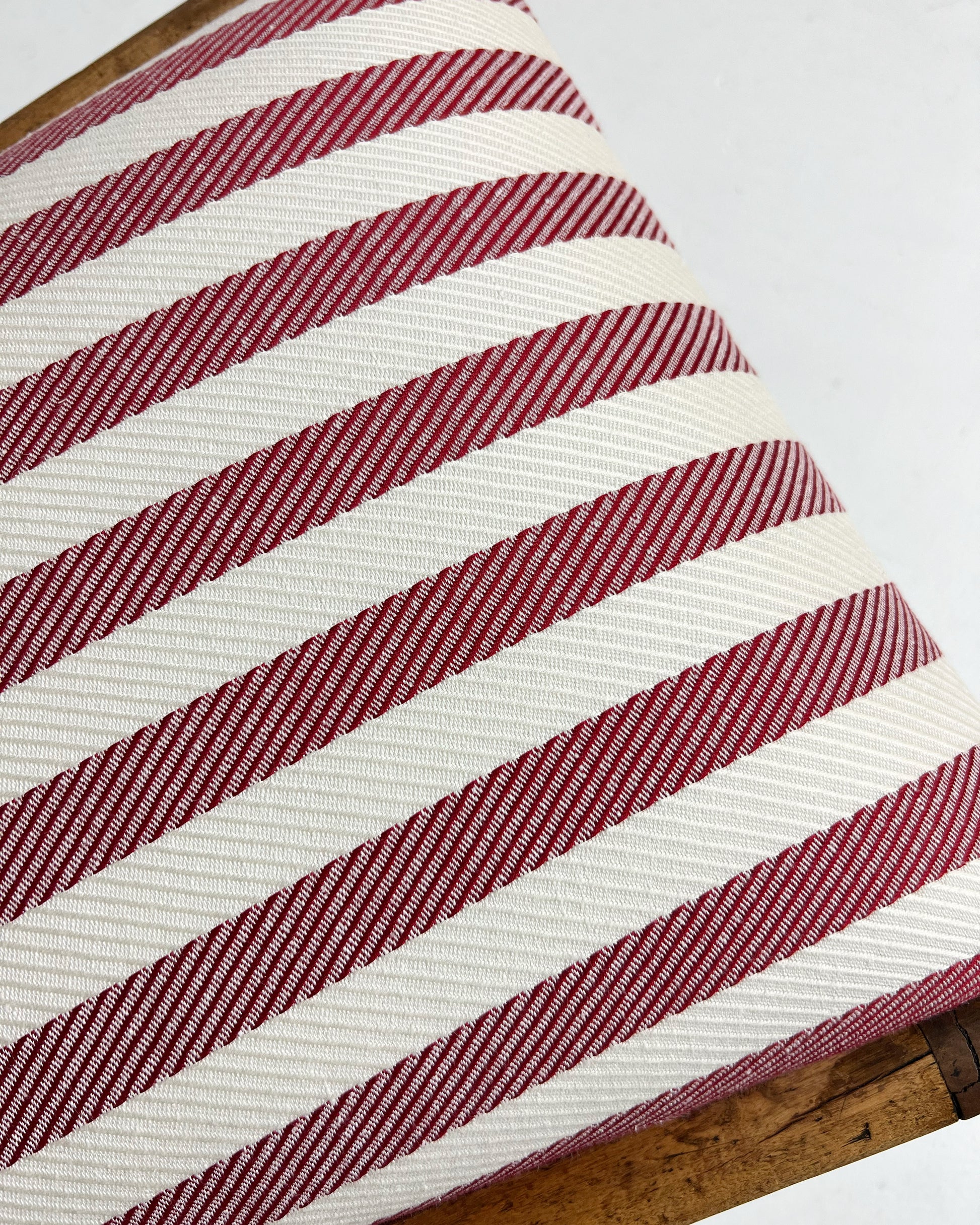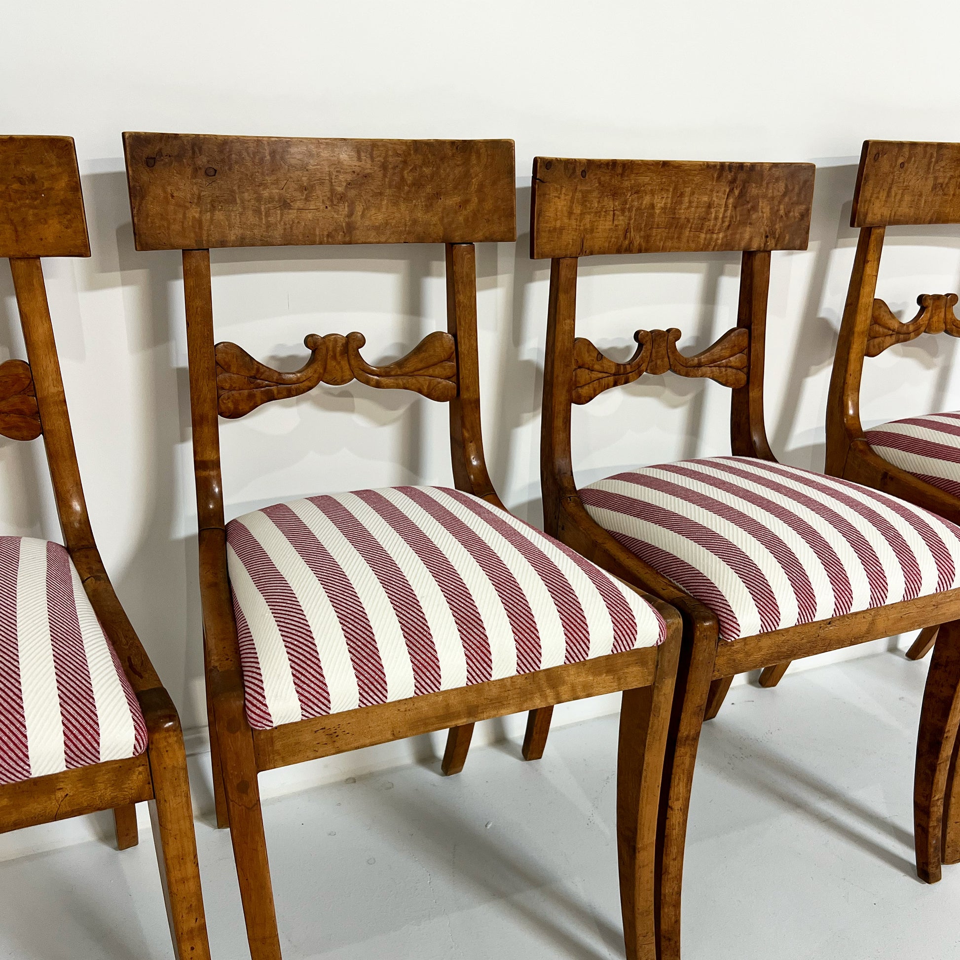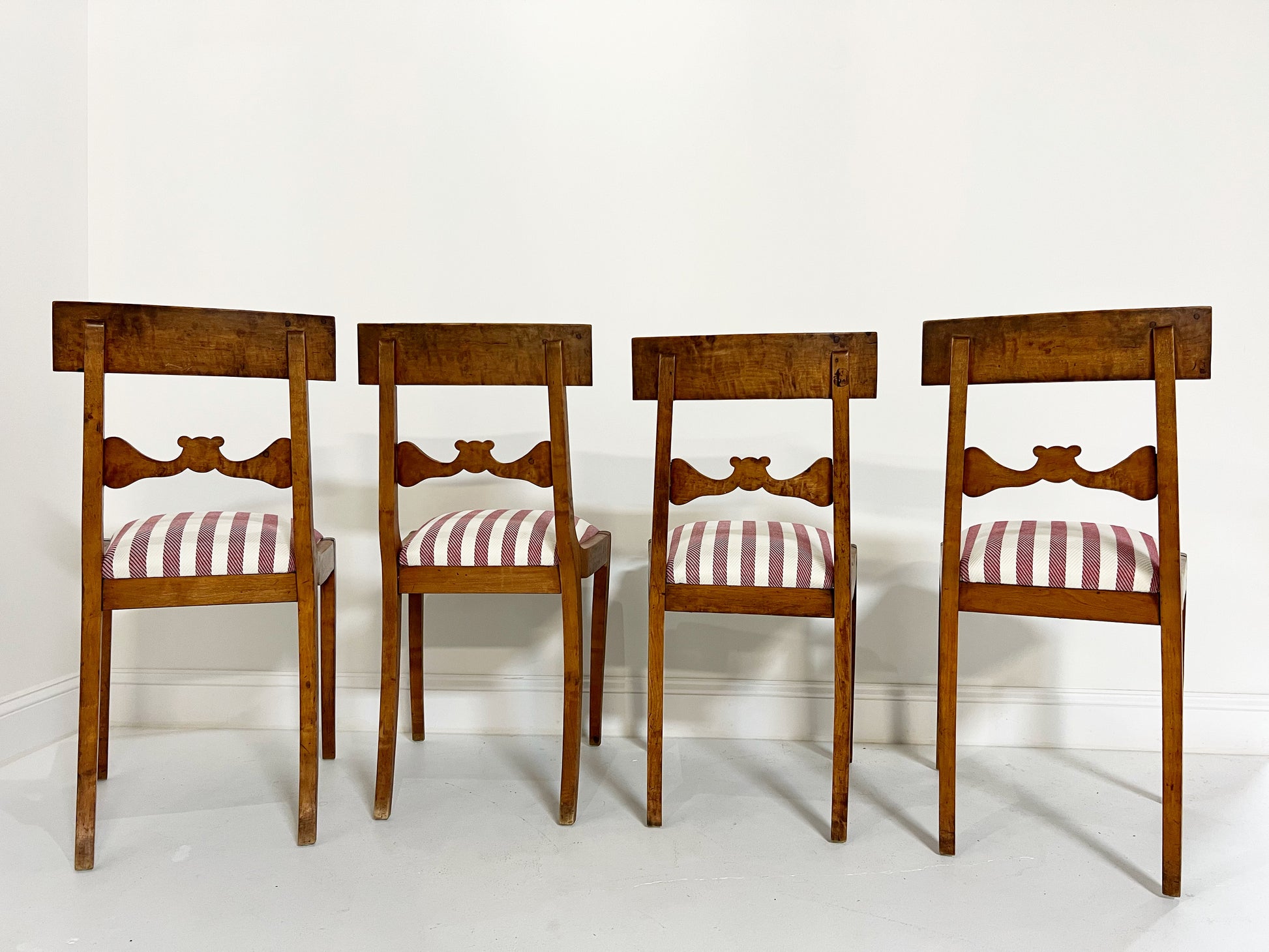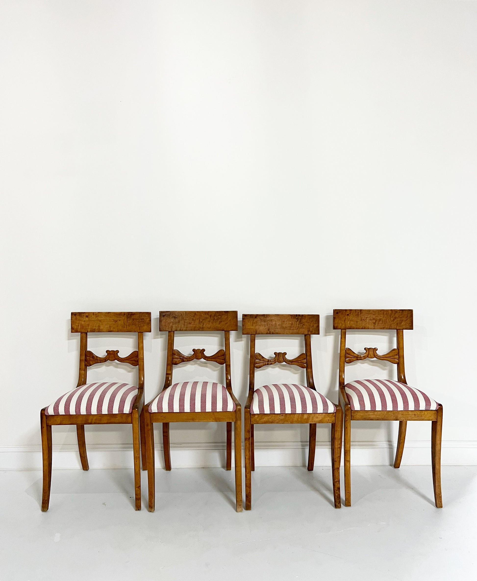 A beautiful set of 4 antique Biedermeier side chairs. We upholstered each chair in a cotton and linen red stripe from the Summer '22 collection of our favorite, Attersee.