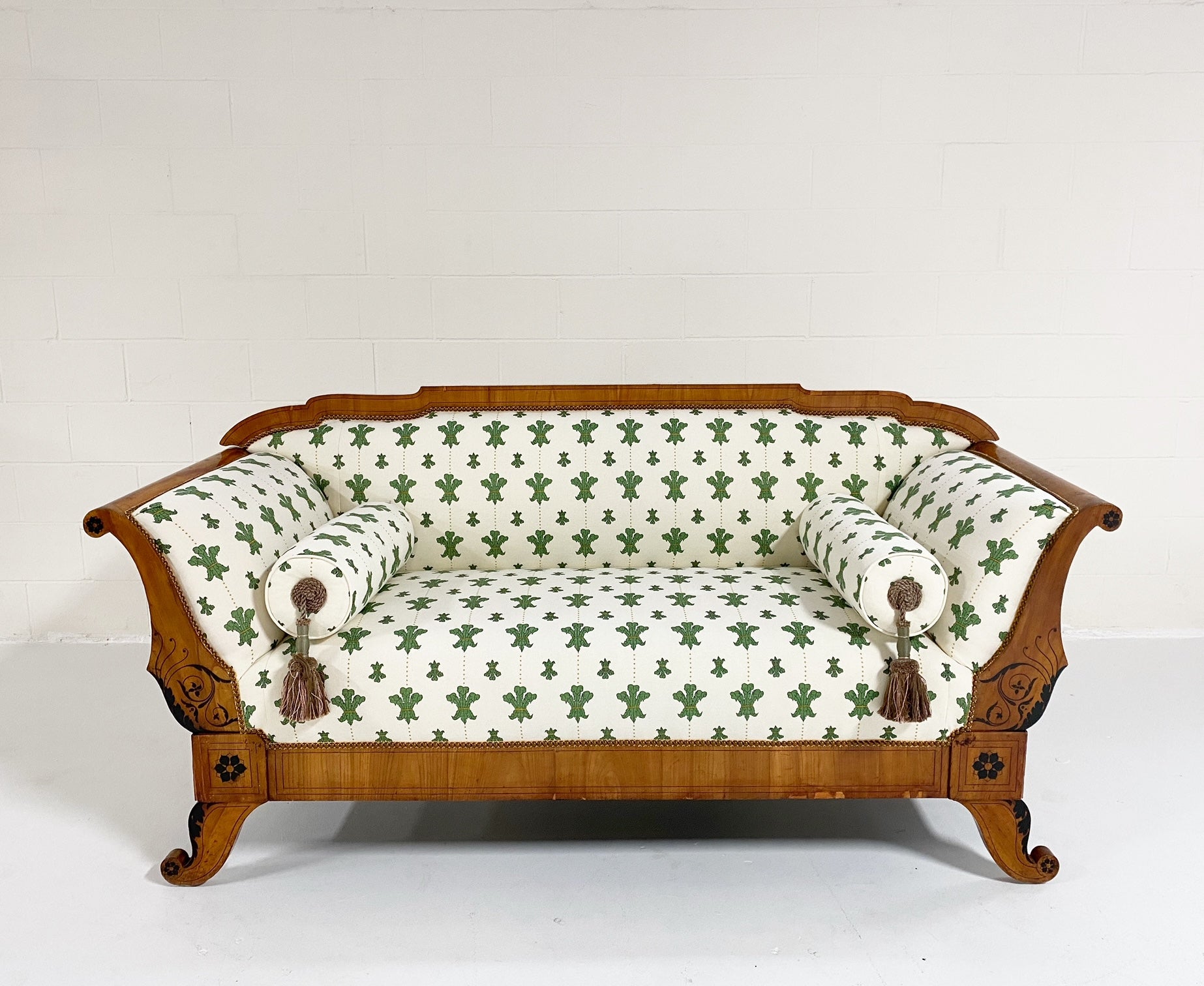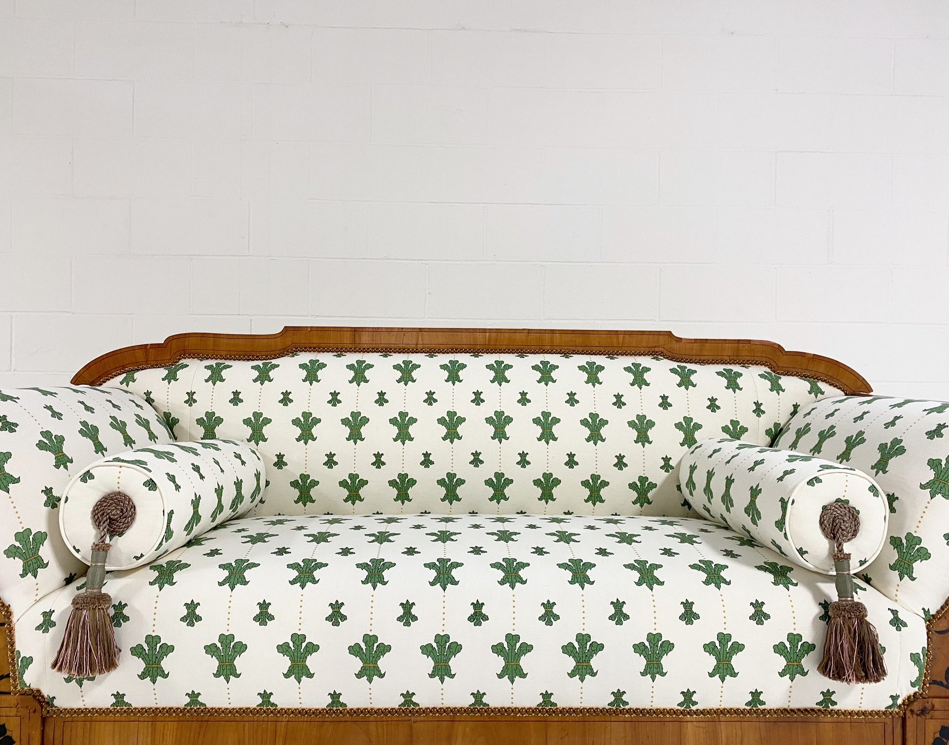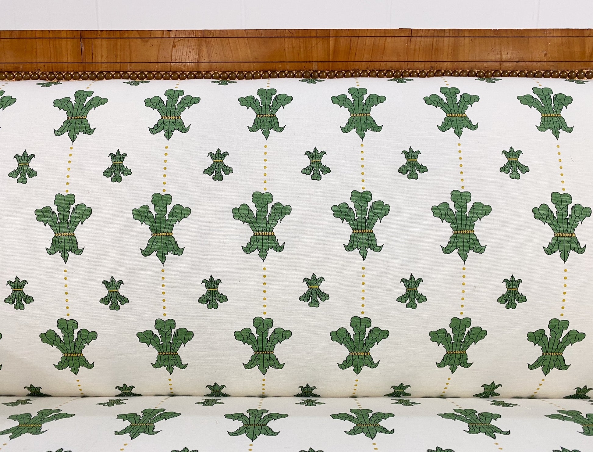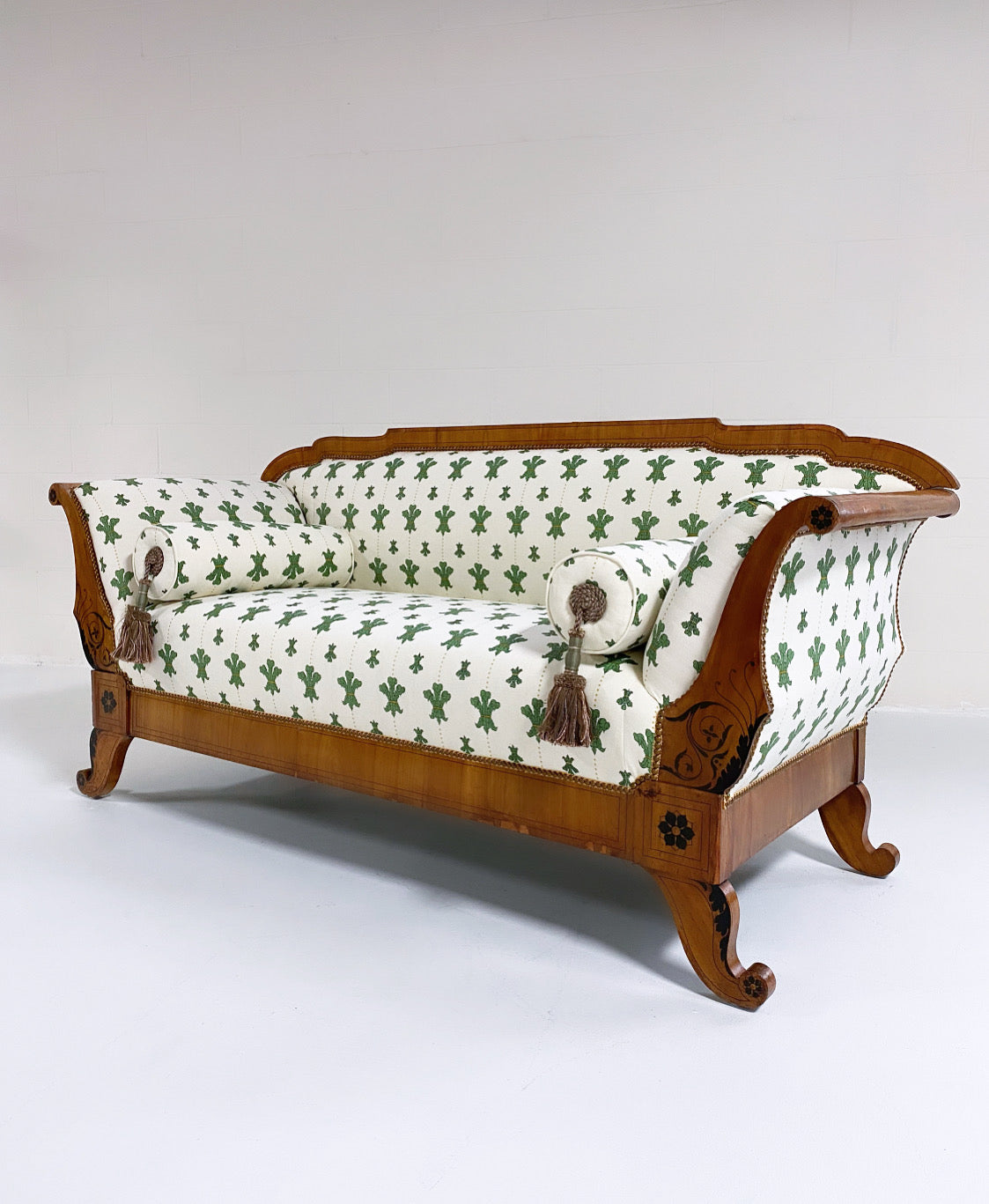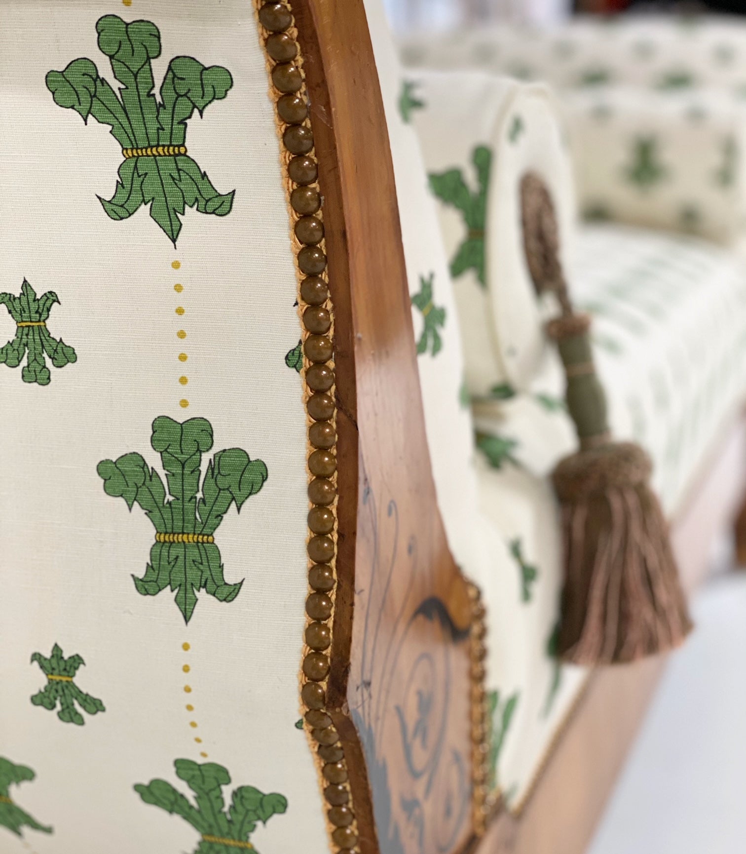 After acquiring this beautiful Biedermeier sofa, we knew we wanted something special for the fabric restoration. So, we turned to our fave designer's line, Beata Heuman. Her Florentine Flowers was a match made in heaven for this piece. From Beata Heuman: Florentine Flowers is inspired in part by Beata’s time spent studying art in Florence, where many buildings are decorated with the Florentine Giglio. The floral motif has been a symbol of the city for centuries, inspired by the Iris Fiorentina that grow wild along the Arno river valley and hills around the city.