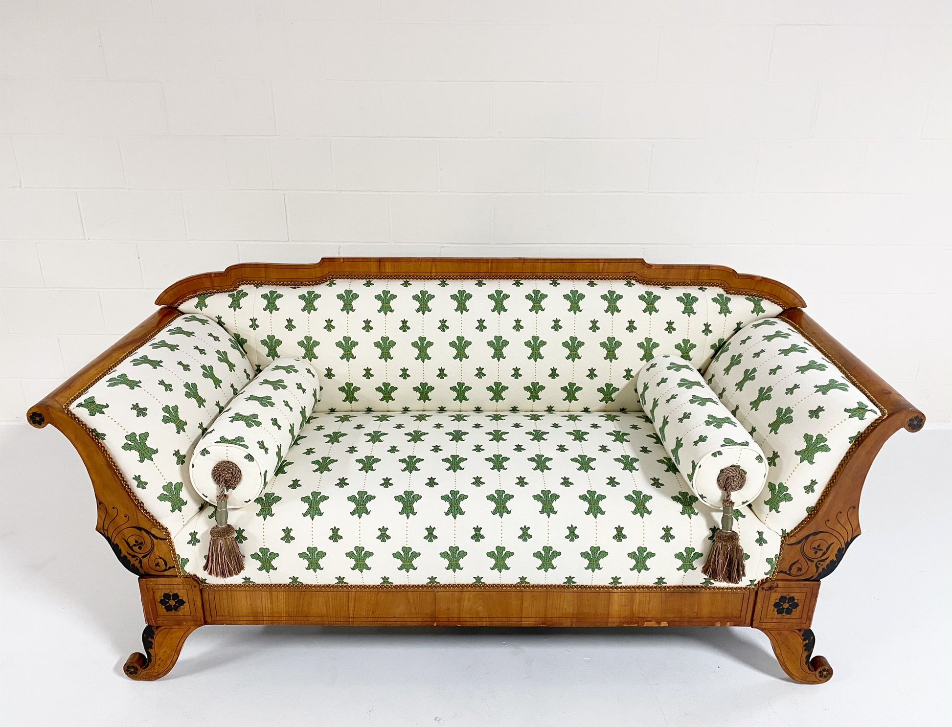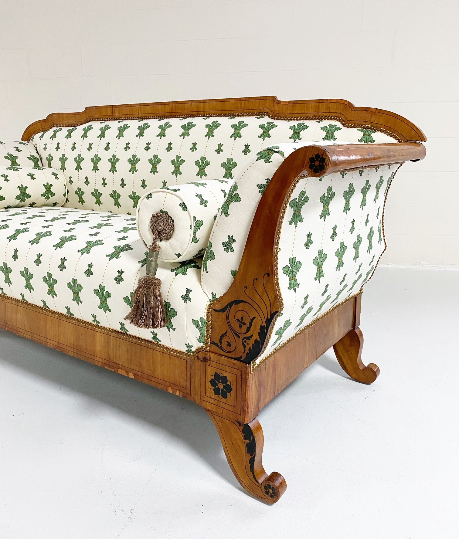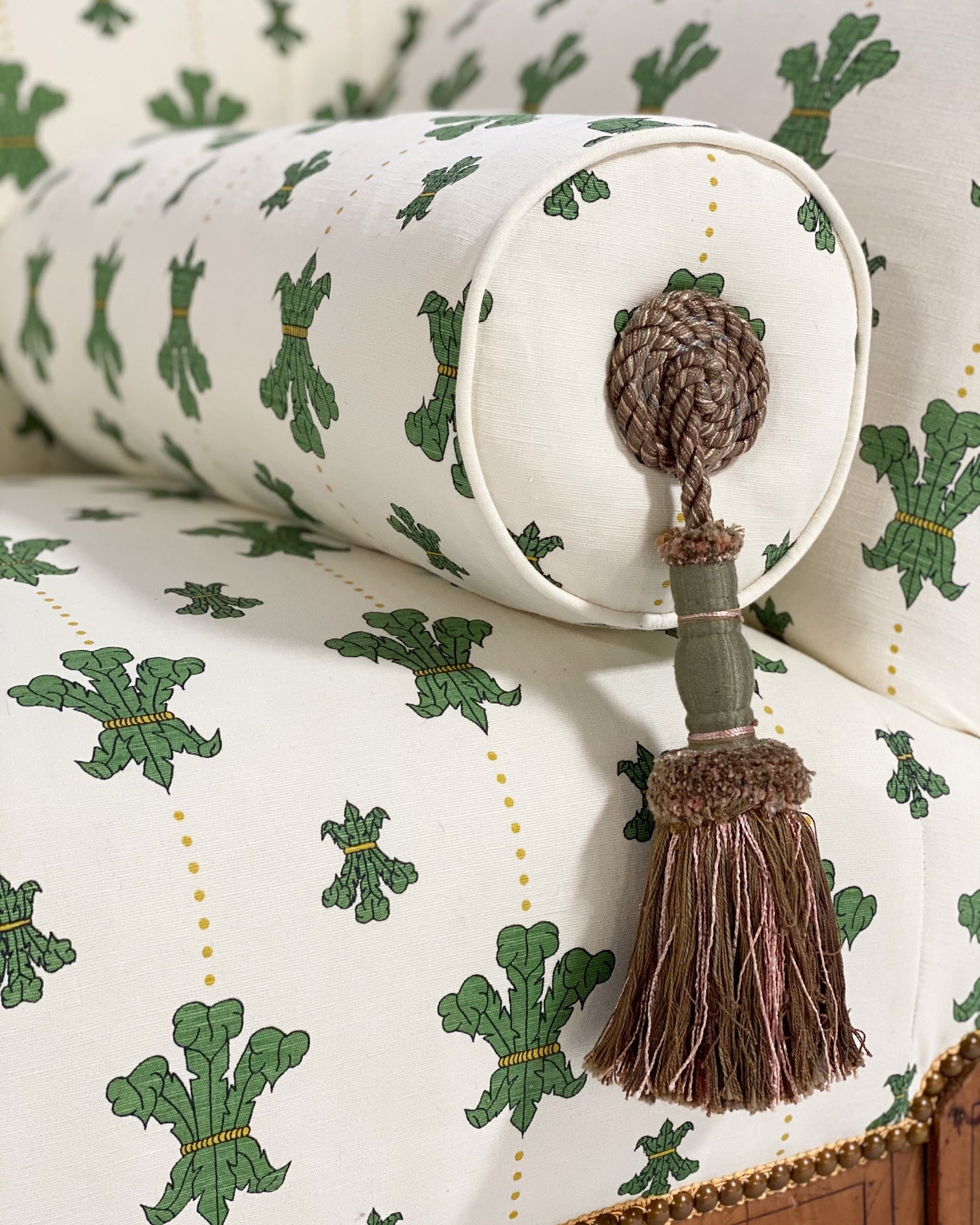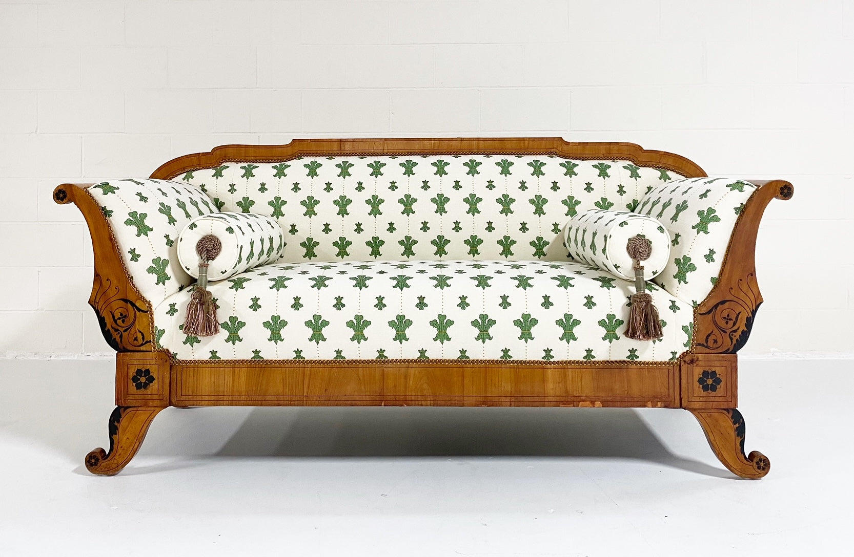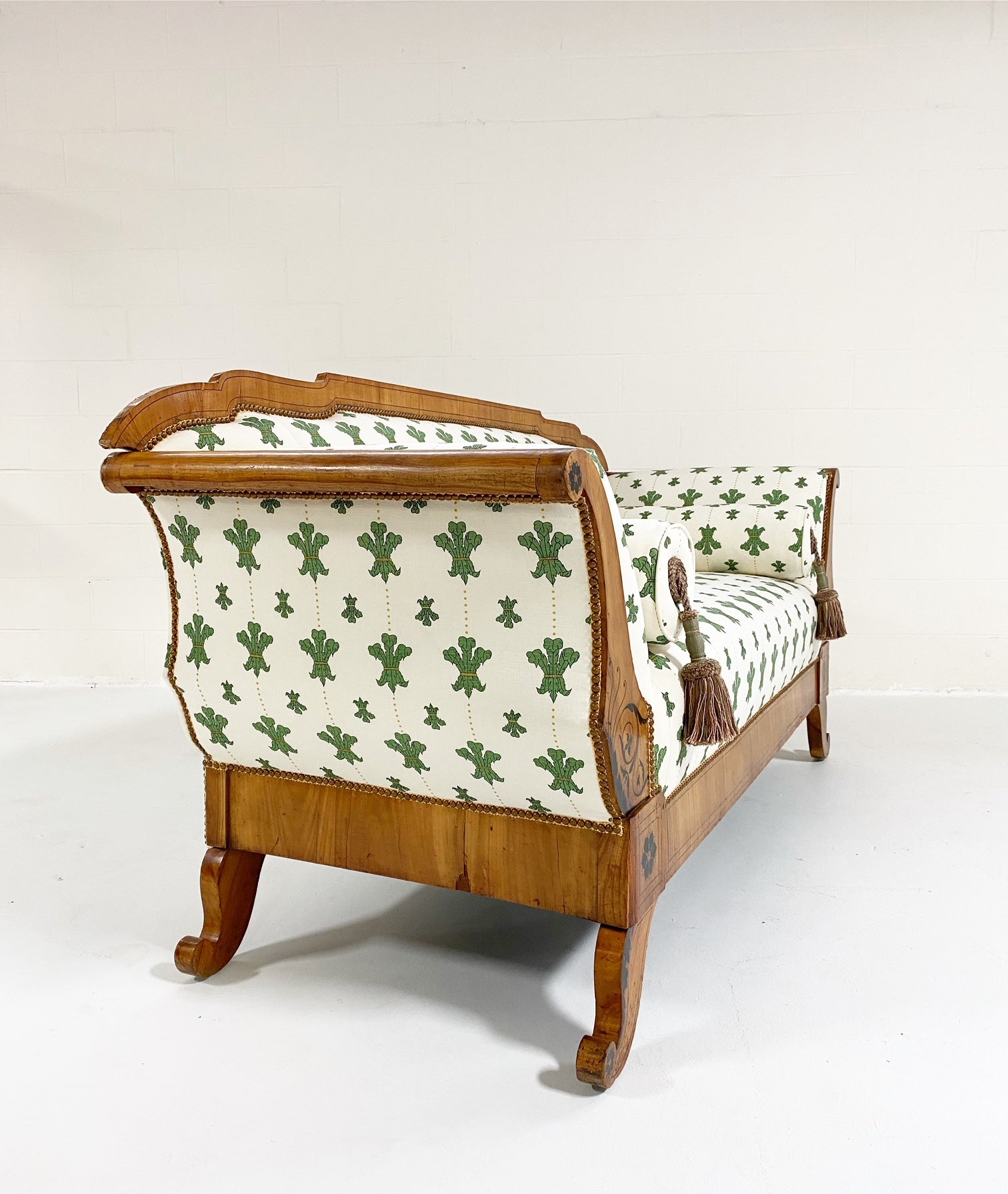 After acquiring this beautiful Biedermeier sofa, we knew we wanted something special for the fabric restoration. So, we turned to our fave designer's line, Beata Heuman. Her Florentine Flowers was a match made in heaven for this piece. From Beata Heuman: Florentine Flowers is inspired in part by Beata’s time spent studying art in Florence, where many buildings are decorated with the Florentine Giglio. The floral motif has been a symbol of the city for centuries, inspired by the Iris Fiorentina that grow wild along the Arno river valley and hills around the city.