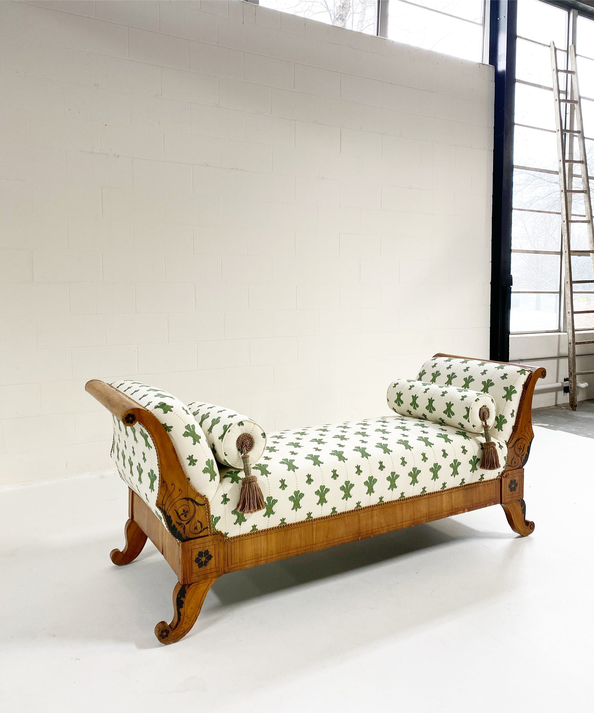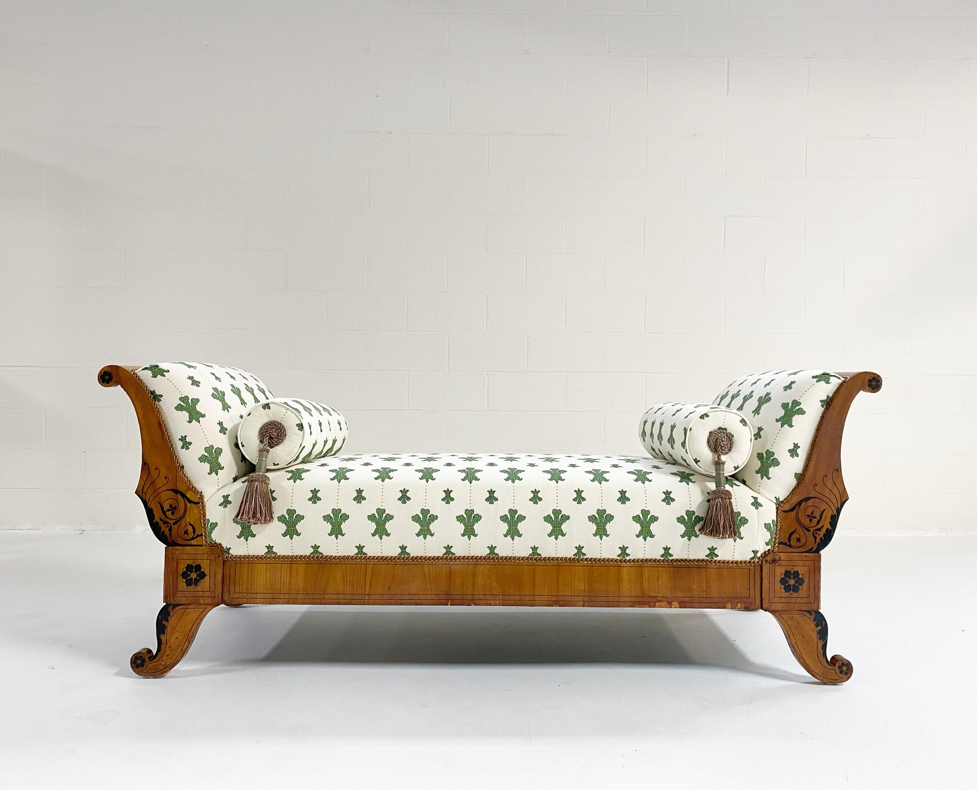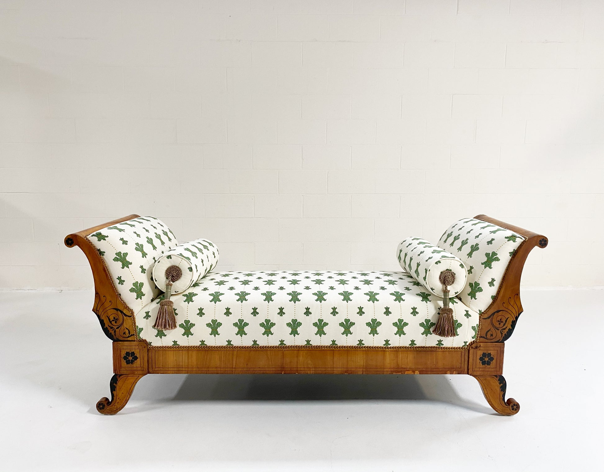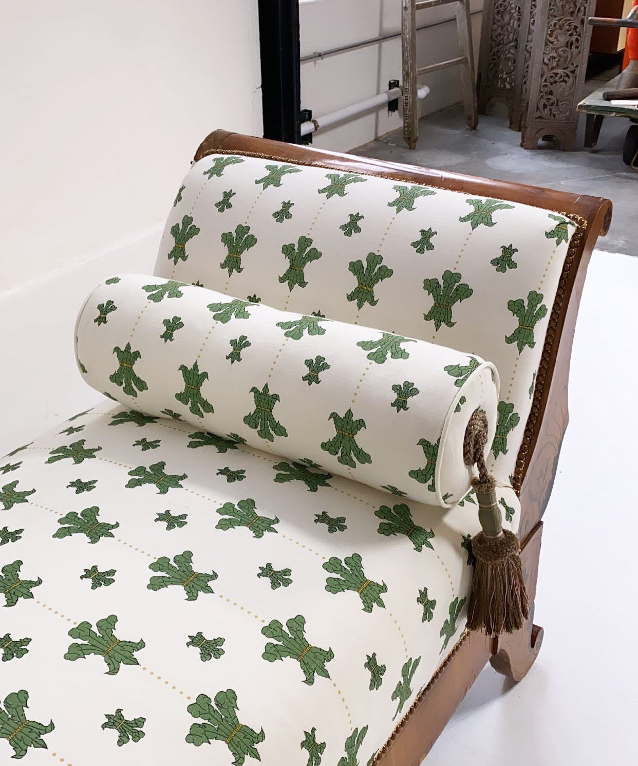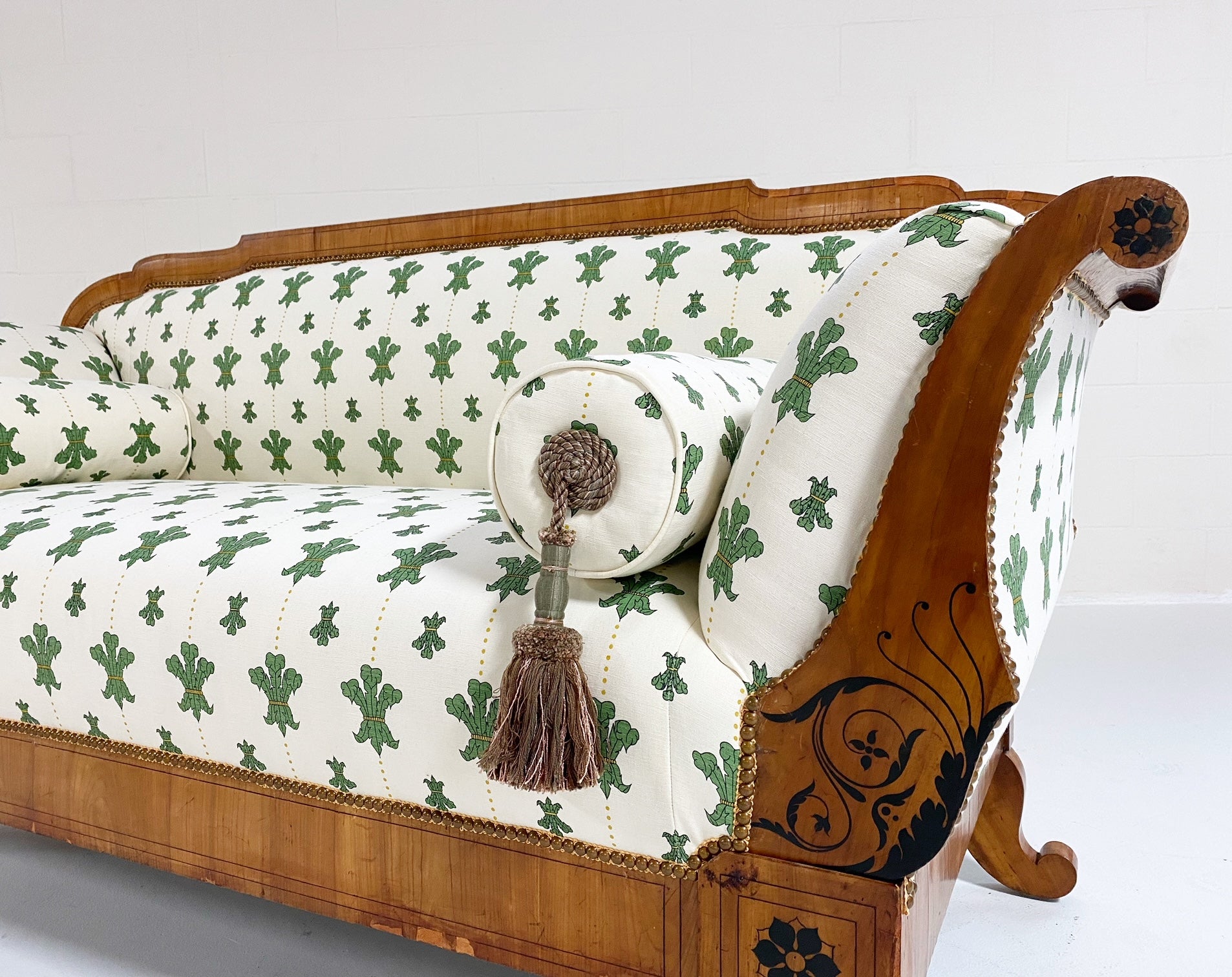 After acquiring this beautiful Biedermeier sofa, we knew we wanted something special for the fabric restoration. So, we turned to our fave designer's line, Beata Heuman. Her Florentine Flowers was a match made in heaven for this piece. From Beata Heuman: Florentine Flowers is inspired in part by Beata’s time spent studying art in Florence, where many buildings are decorated with the Florentine Giglio. The floral motif has been a symbol of the city for centuries, inspired by the Iris Fiorentina that grow wild along the Arno river valley and hills around the city.