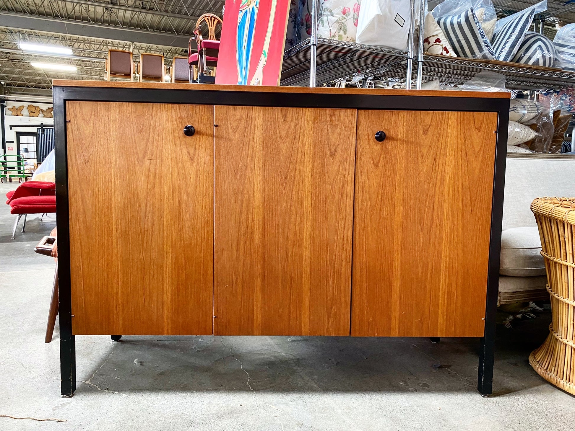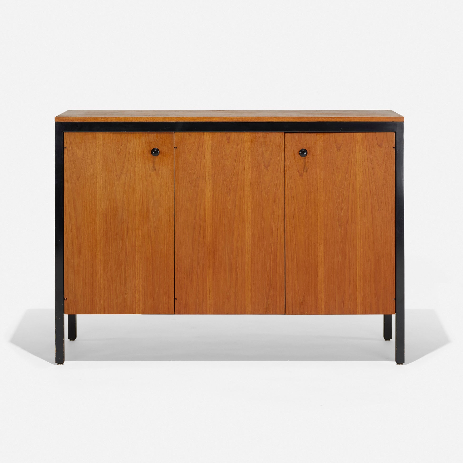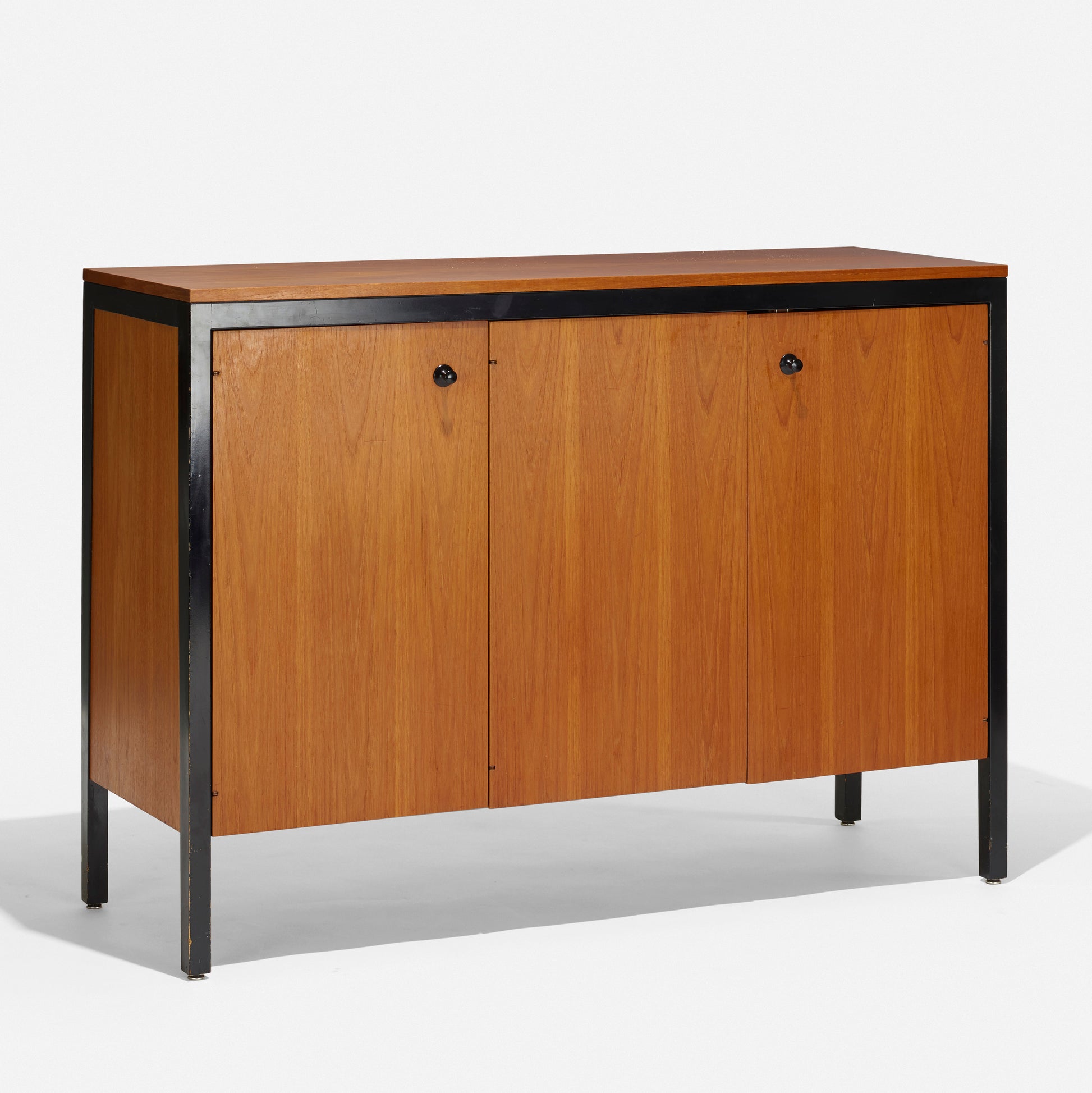 The Black Frame series, part of the Executive Office Group, was a line of luxurious office and home furnishings. In production for approximately five years, few examples are known. The cabinet features three doors concealing drawers and two shelves. There is a metal manufacturer's label to the interior stating: ‘Designed by George Nelson Herman Miller Zeeland Mich’. We love this piece! The height is great.