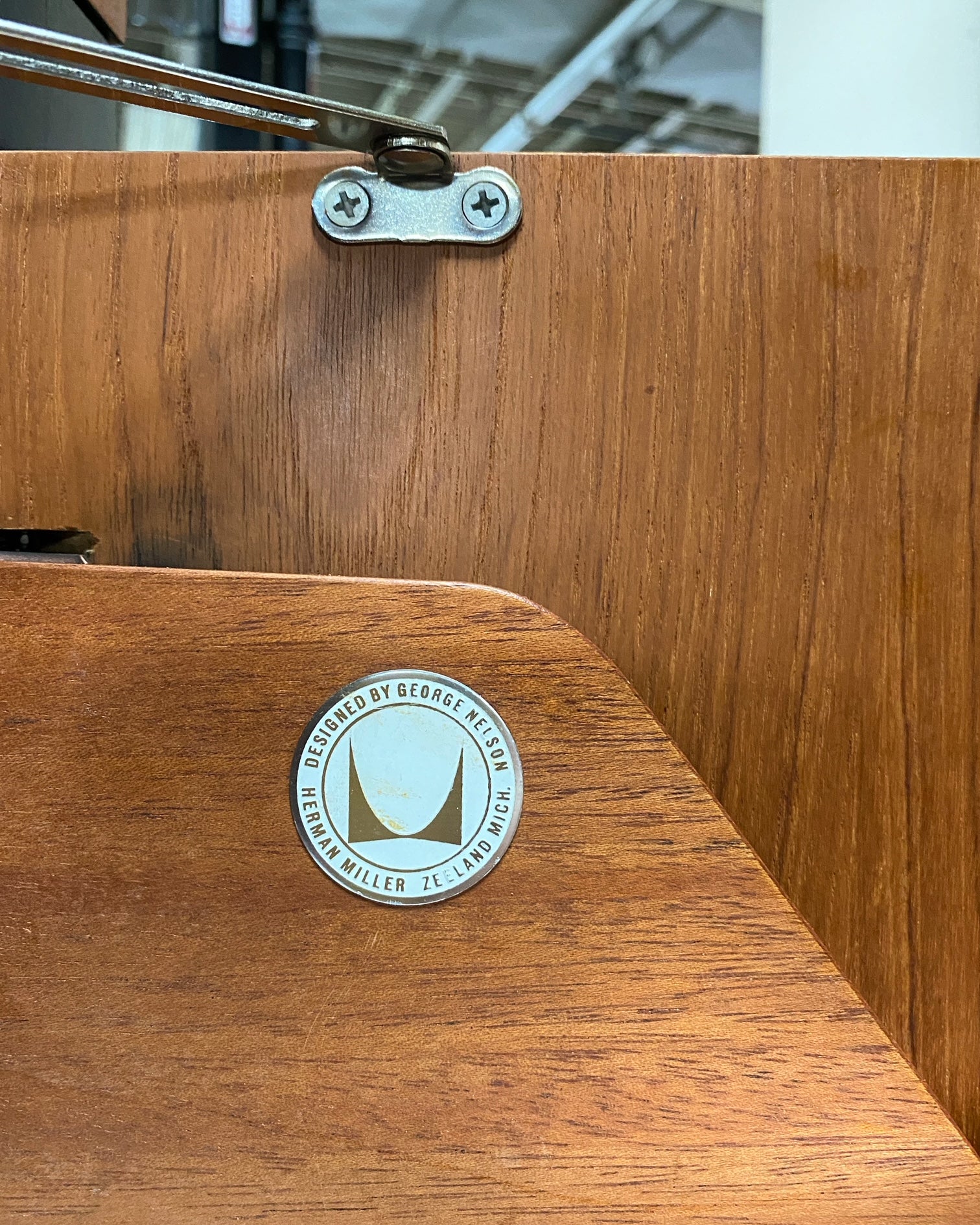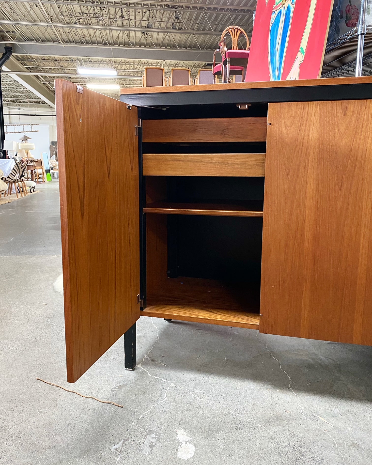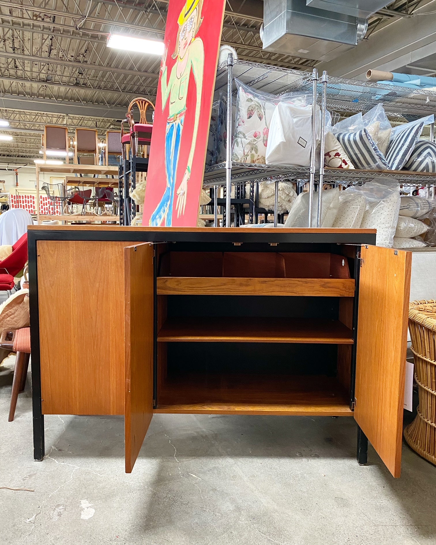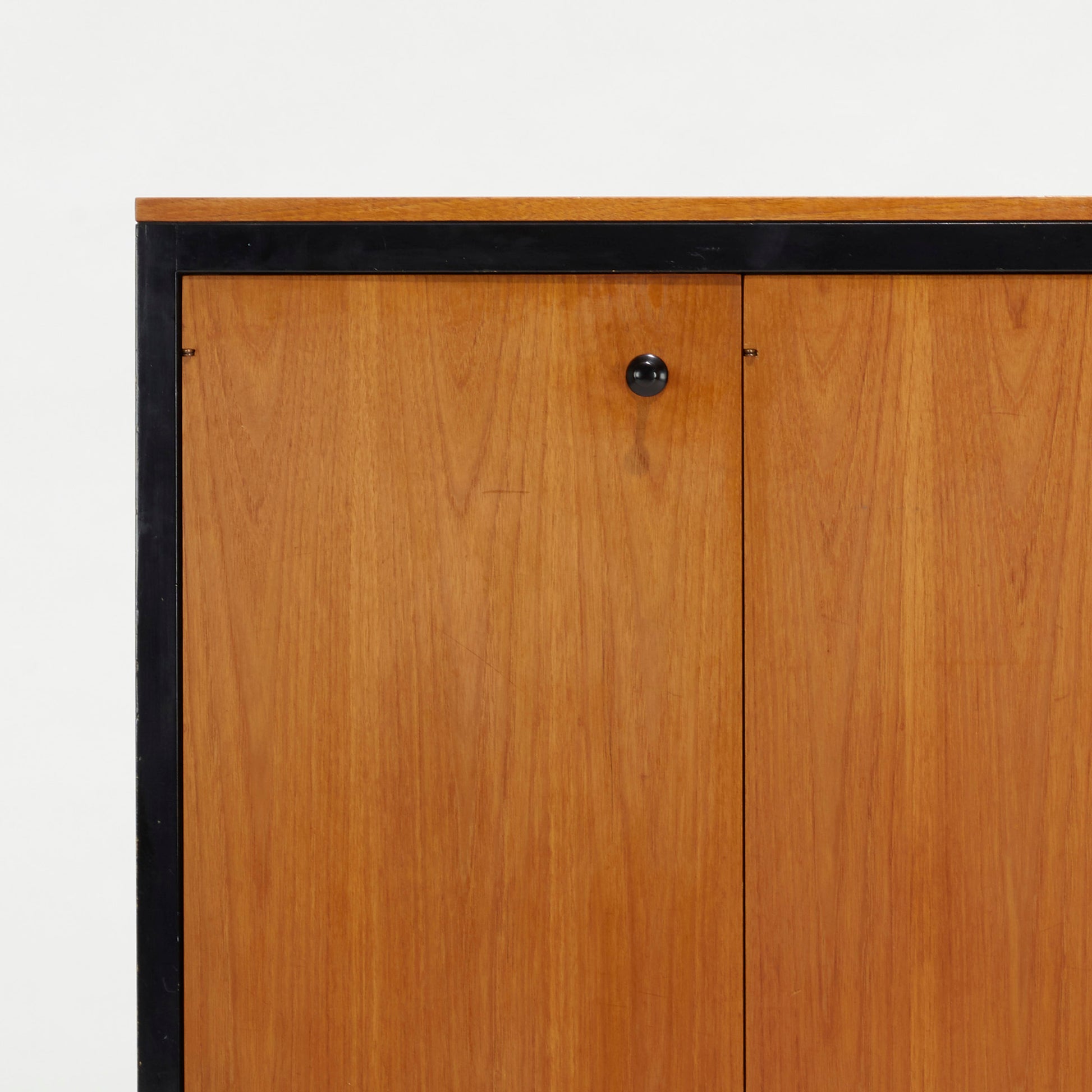 The Black Frame series, part of the Executive Office Group, was a line of luxurious office and home furnishings. In production for approximately five years, few examples are known. The cabinet features three doors concealing drawers and two shelves. There is a metal manufacturer's label to the interior stating: ‘Designed by George Nelson Herman Miller Zeeland Mich’. We love this piece! The height is great.
