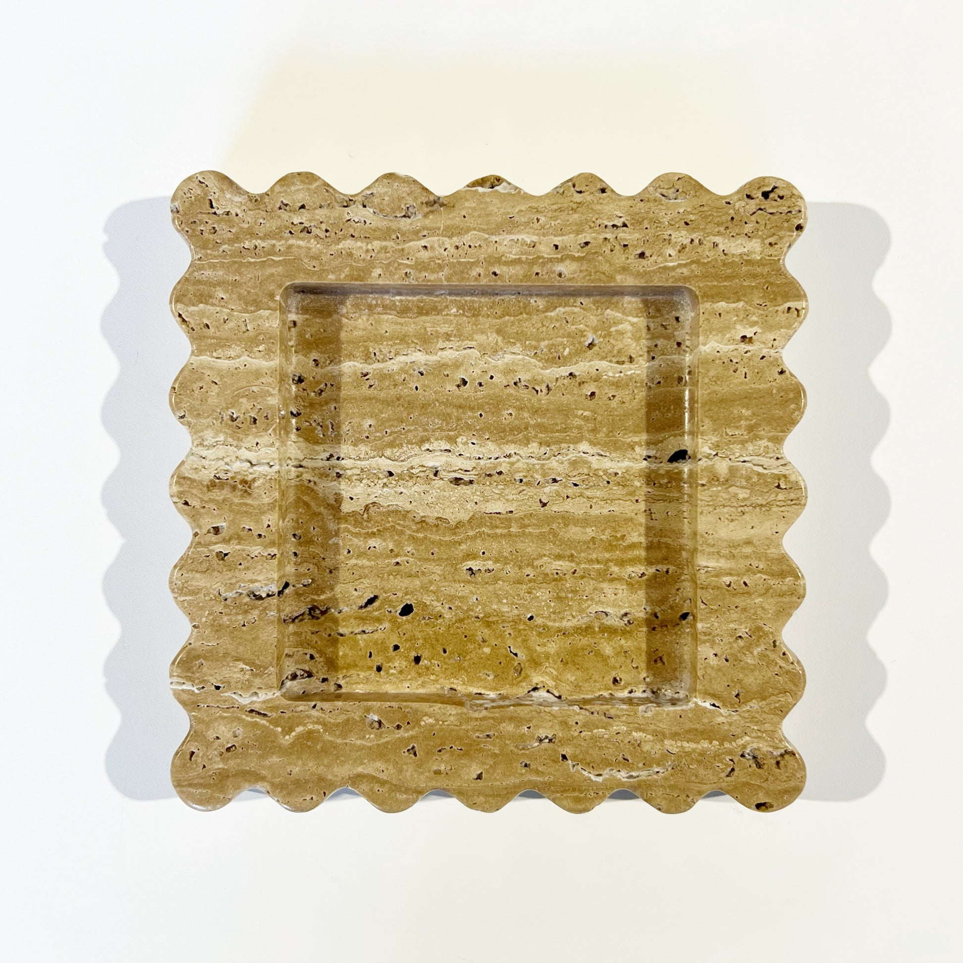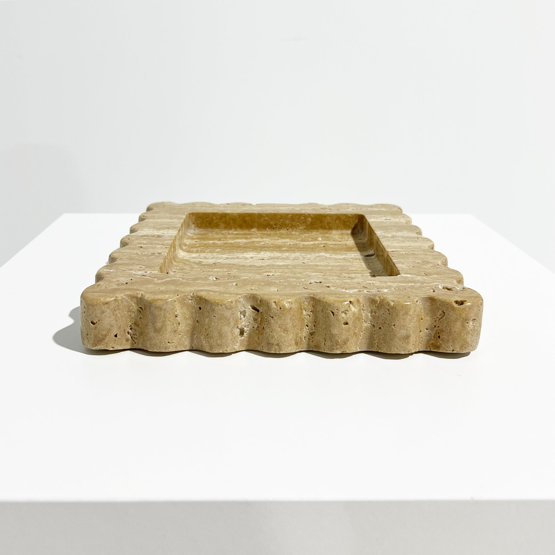 The Box Tray is a limited production, functional object d'art. The Box is a sculptural eight by eight inch tray cut from a single piece of solid marble or stone with scalloped edges, hand-finished by artisans in a growing stone atelier in Rajasthan, India. Arrives in luxe, gift-ready packaging with felt protective pads.