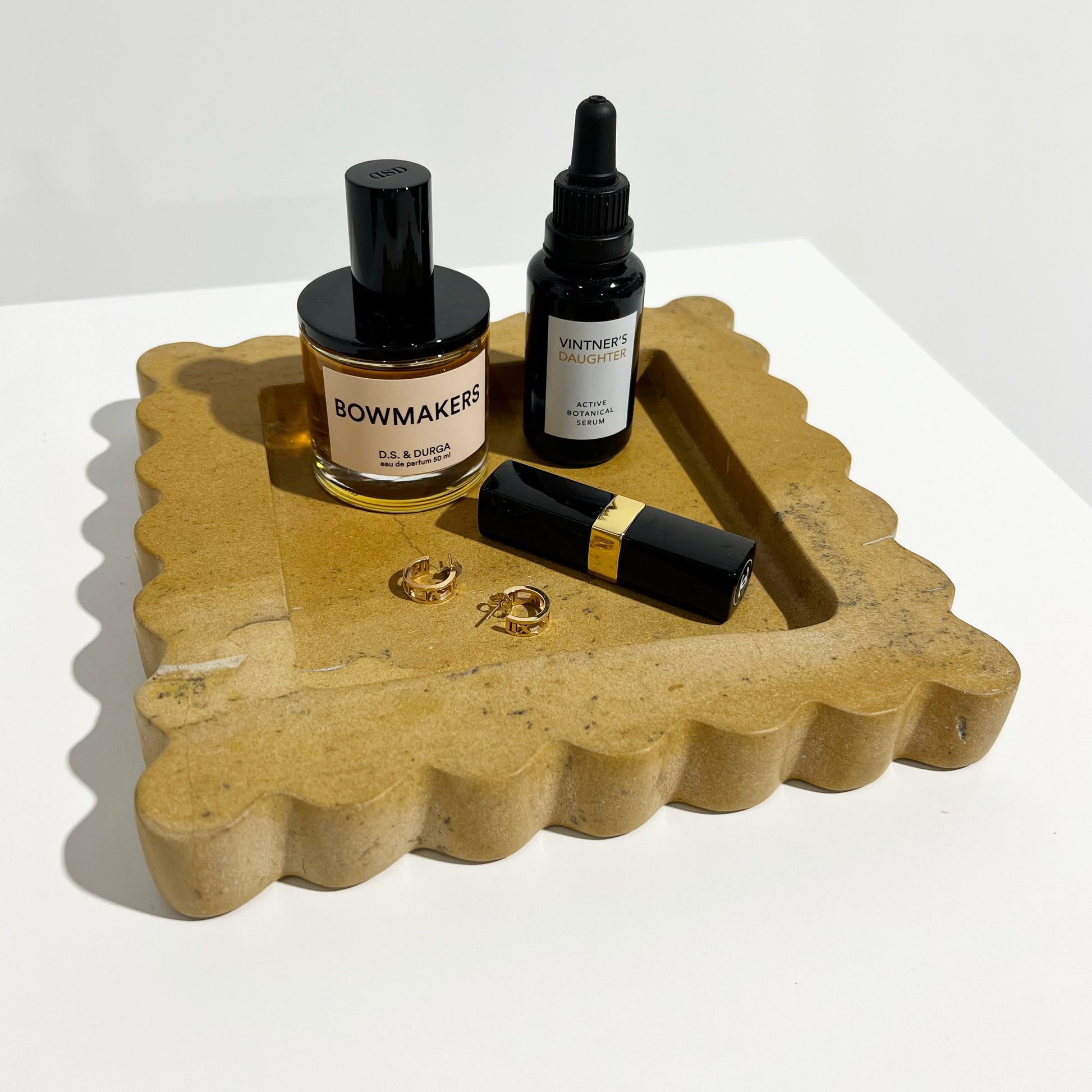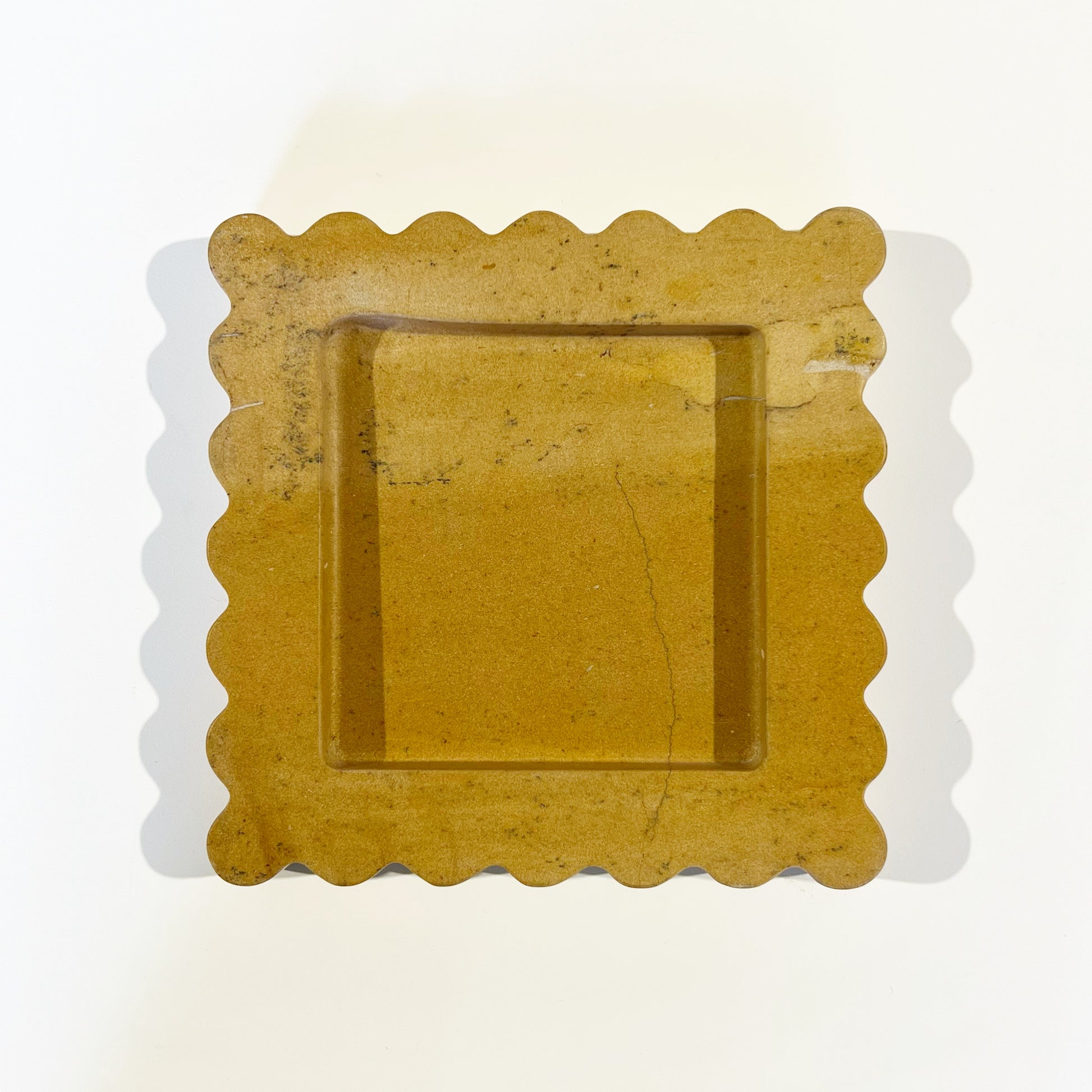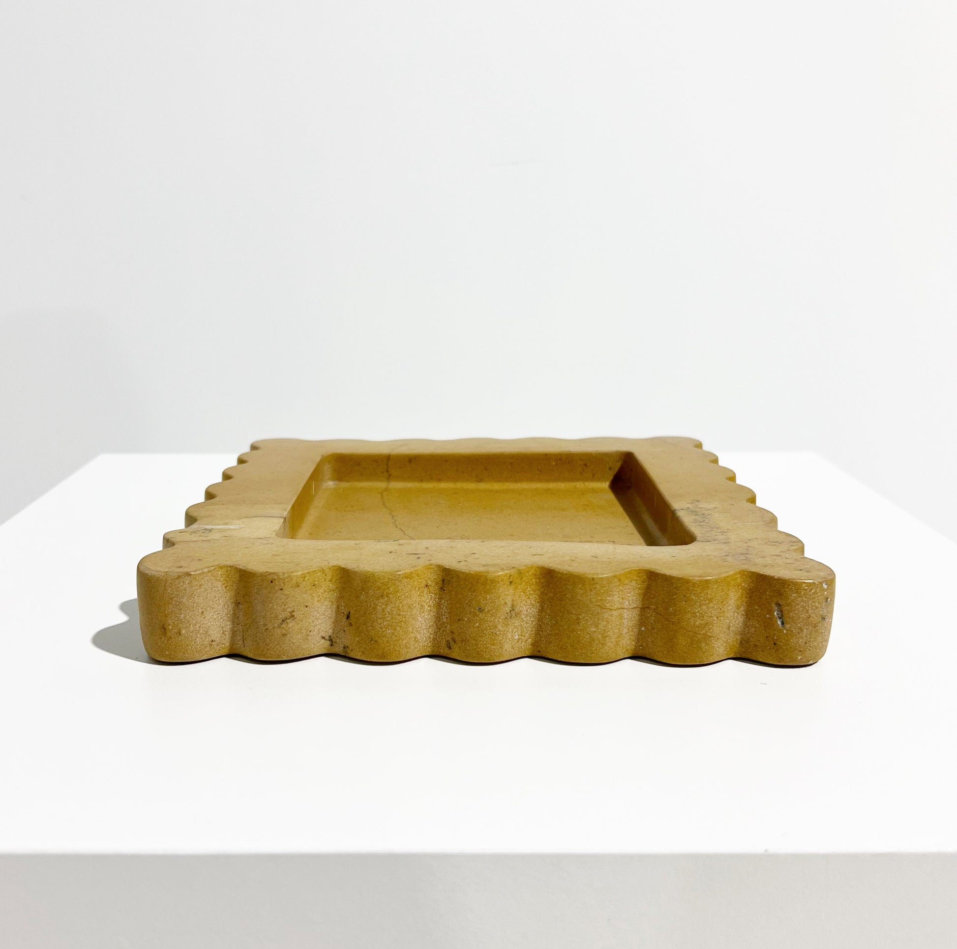 The Box Tray is a limited production, functional object d'art. The Box is a sculptural eight by eight inch tray cut from a single piece of solid marble or stone with scalloped edges, hand-finished by artisans in a growing stone atelier in Rajasthan, India. Arrives in luxe, gift-ready packaging with felt protective pads.