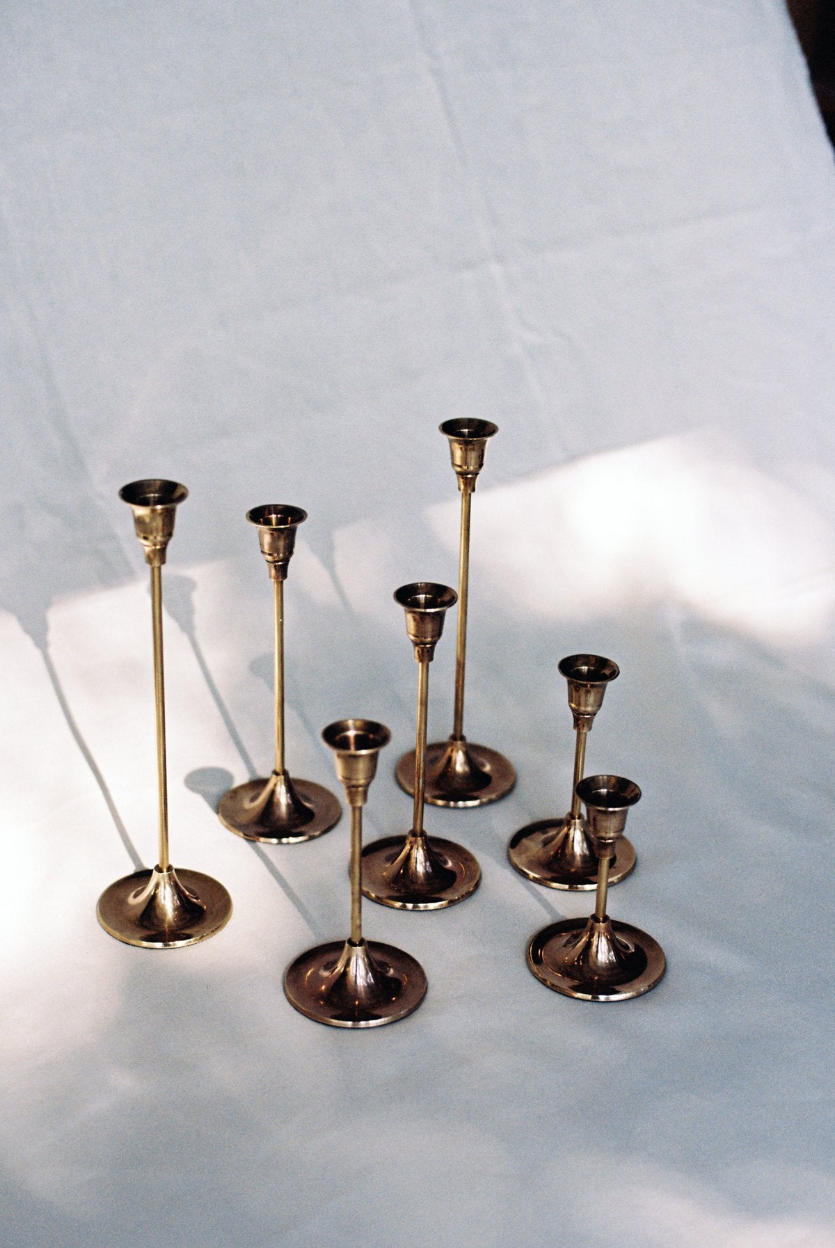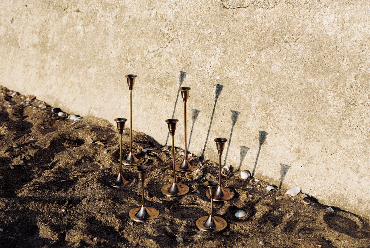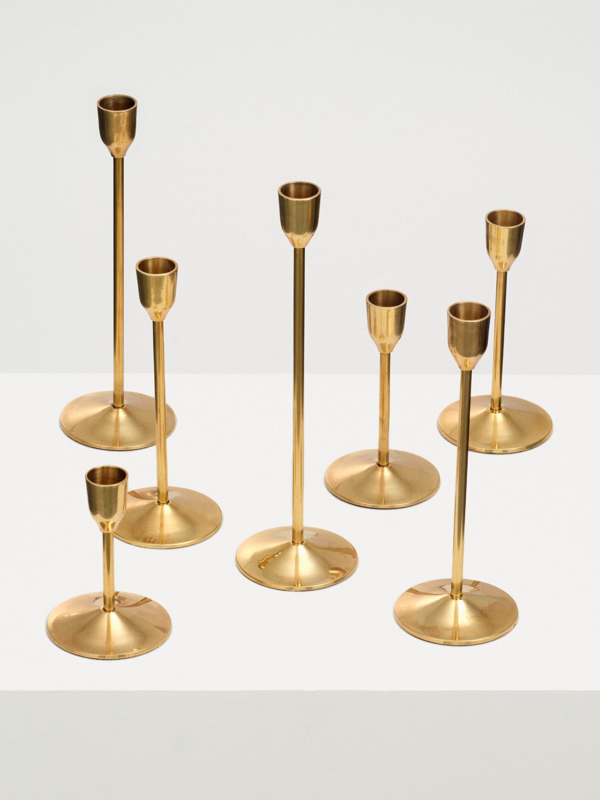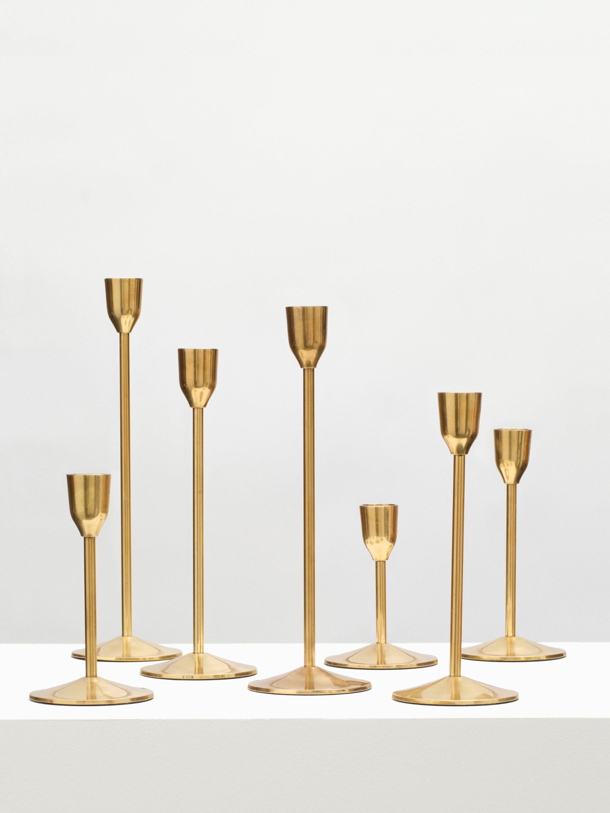 A gorgeously romantic set of 7 brass candlesticks. These look fantastic together as a set on your dining table or kitchen island, or scattered around the home. They are made in small batches by skilled brass artisans in Uttar Pradesh, India. The bases fit a standard-sized tapered candle. Check out our Fourth St Tapered Candle listings to complete a set.