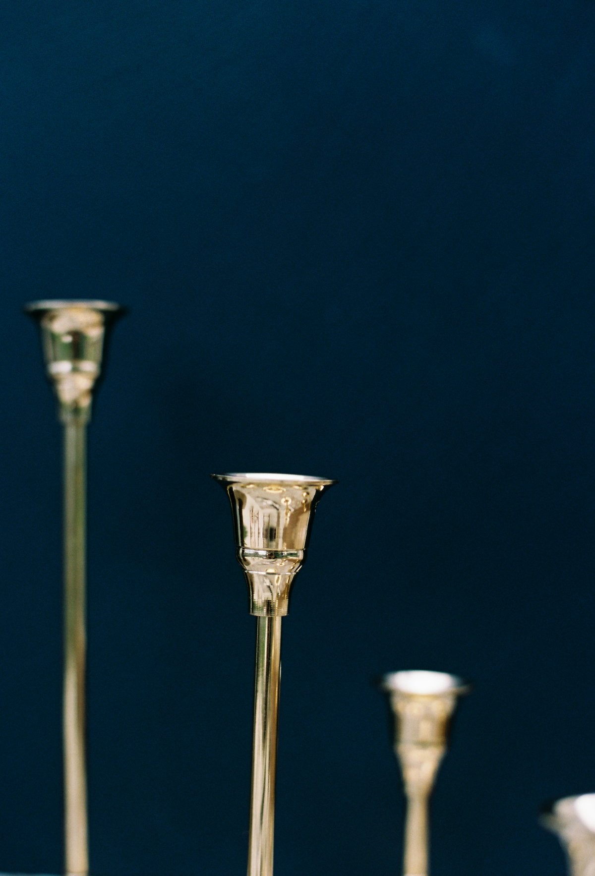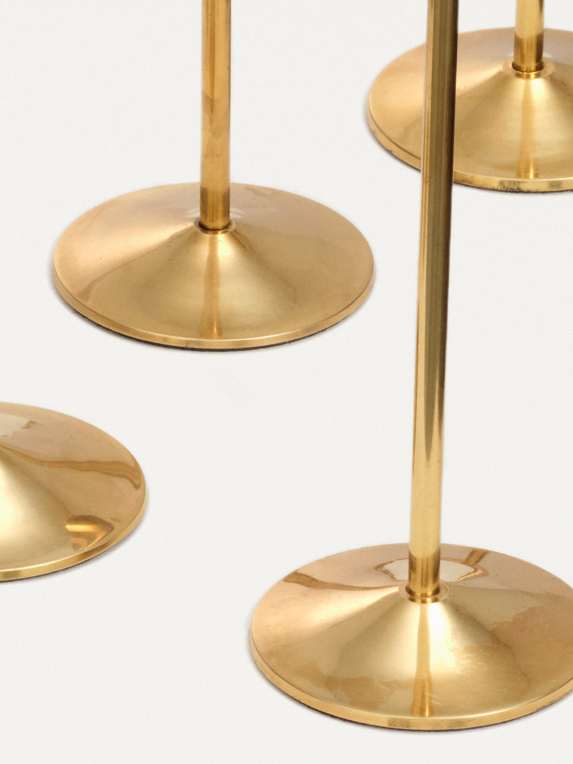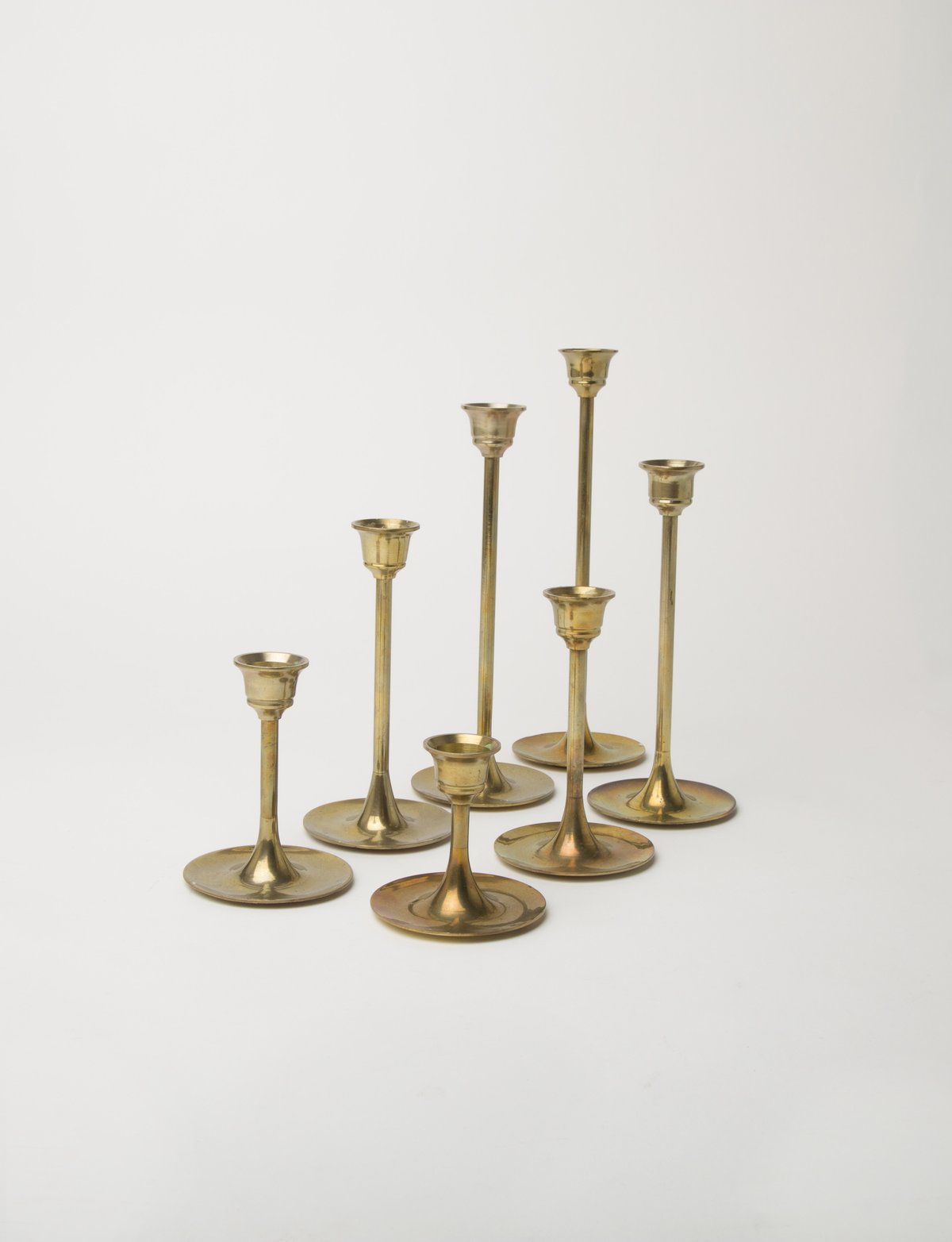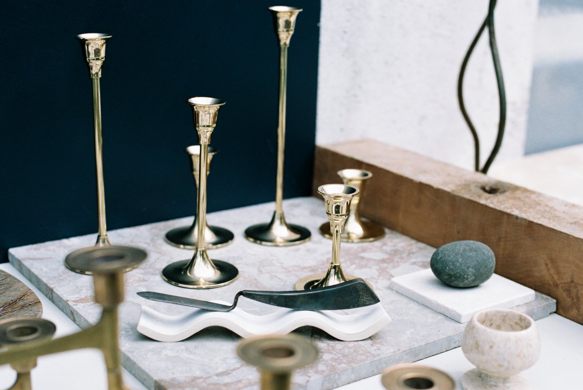 A gorgeously romantic set of 7 brass candlesticks. These look fantastic together as a set on your dining table or kitchen island, or scattered around the home. They are made in small batches by skilled brass artisans in Uttar Pradesh, India. The bases fit a standard-sized tapered candle. Check out our Fourth St Tapered Candle listings to complete a set.