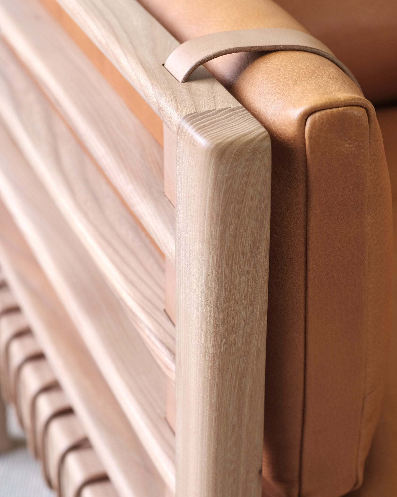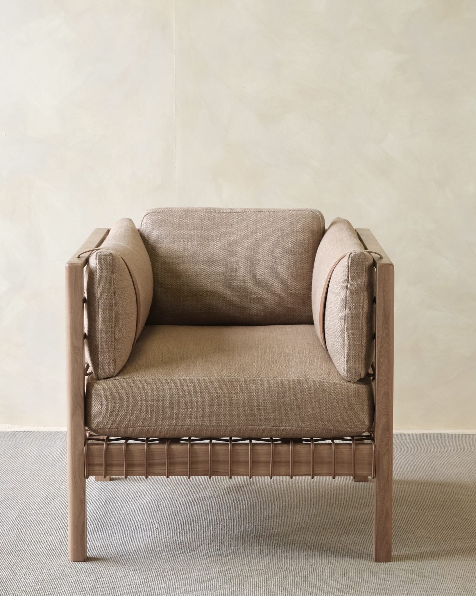 As with the Mochi, it has a sturdy hardwood frame with a laddered backrest and sides. Woven leather cord webbing is carefully hand tacked for durability and comfort. The upholstery features loose cushions in either an olive tanned leather or linen wool mix. They are held to the frame by with bridle leather straps. It has a relatively small footprint for such a generously proportioned and comfortable piece.