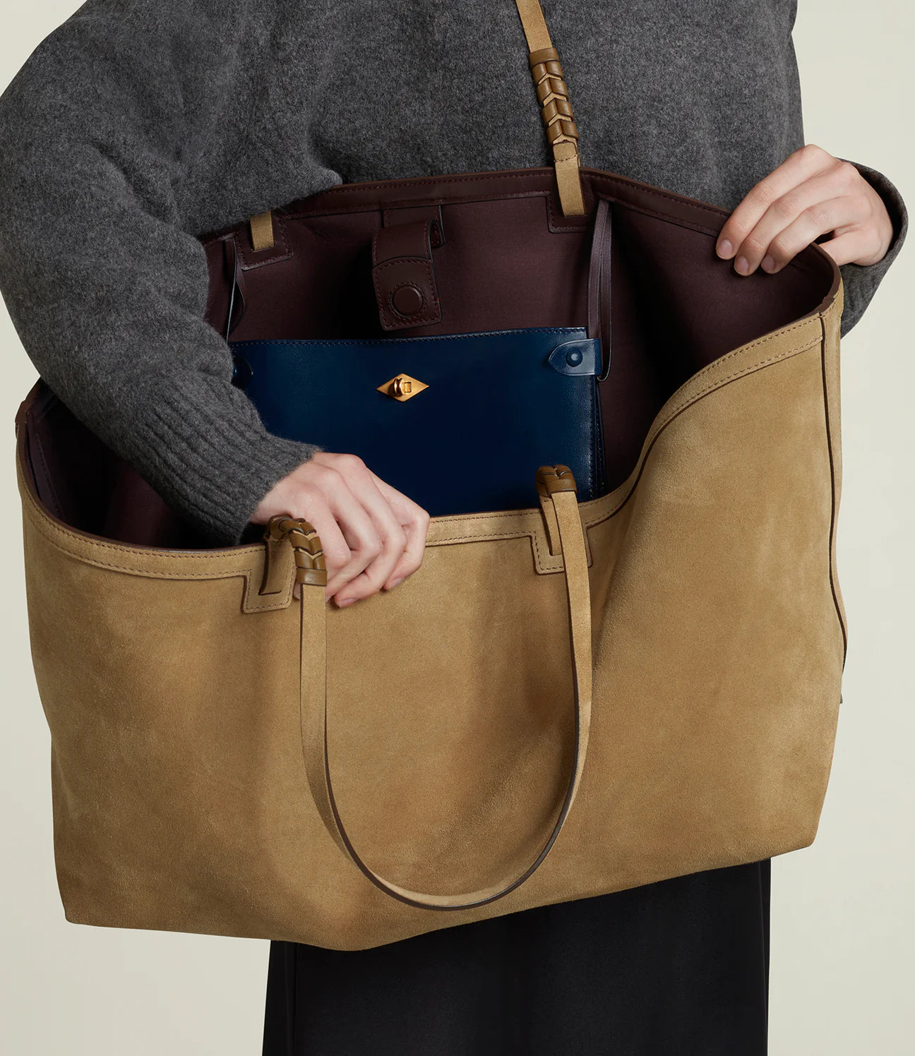 Here, the largest sized offering in the Cala line, the 42, allows for a generously liberal packing mindset for everything, plus just-in-case, for the luxury of being indecisive. The interior pocket is a detachable pouch that can transform into a cross body bag and be replaced with the Stowaway aid in organising. Hand-stitching anchoring the handle, and a discreet magnetic top closure provide a delicate finish.