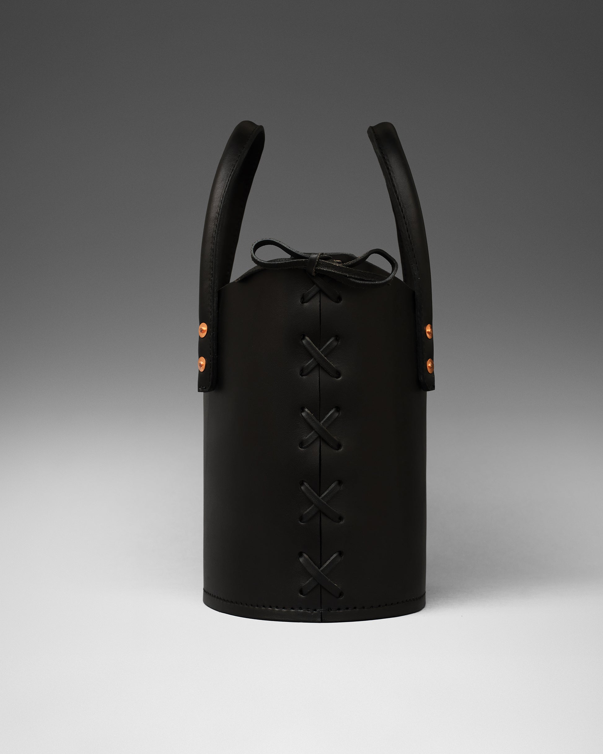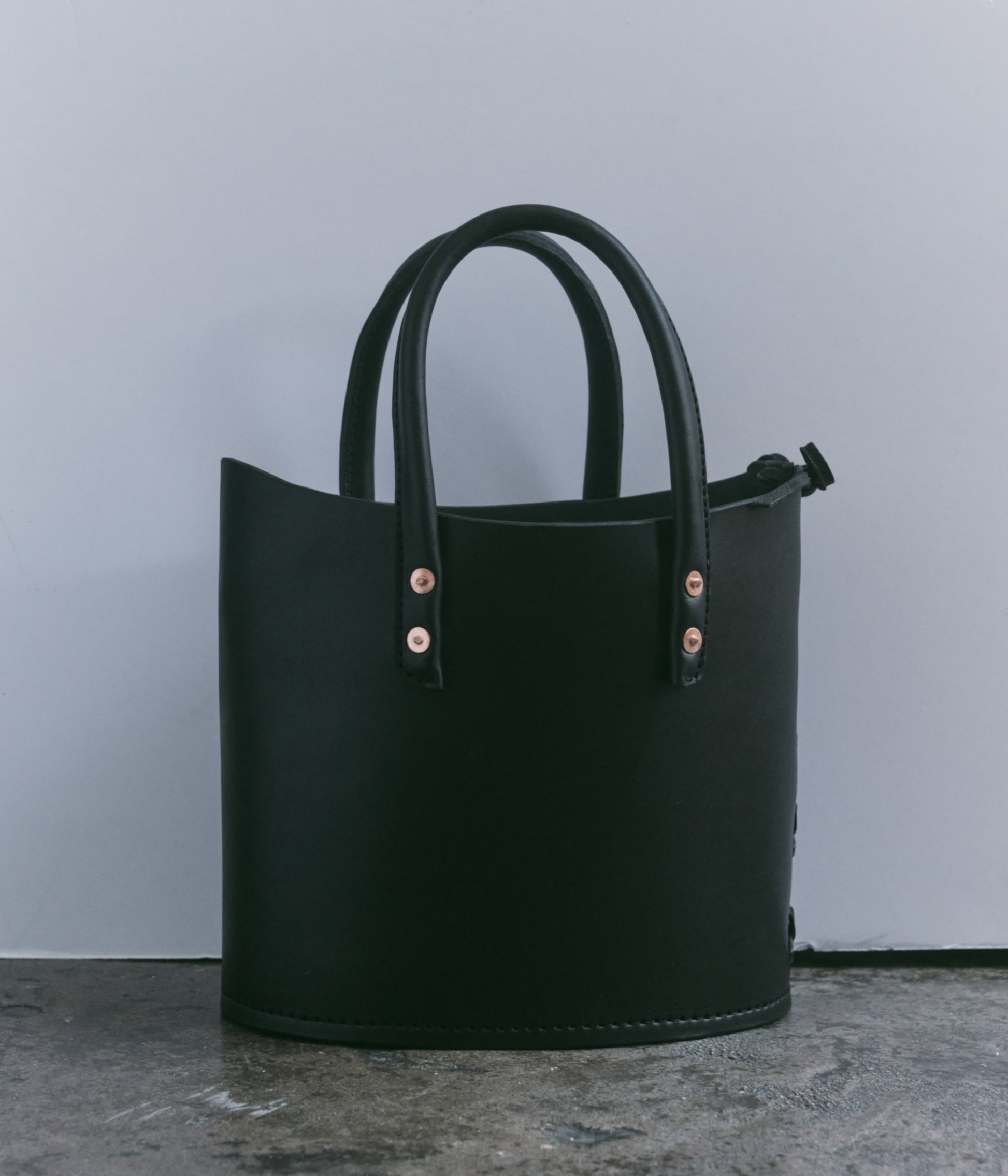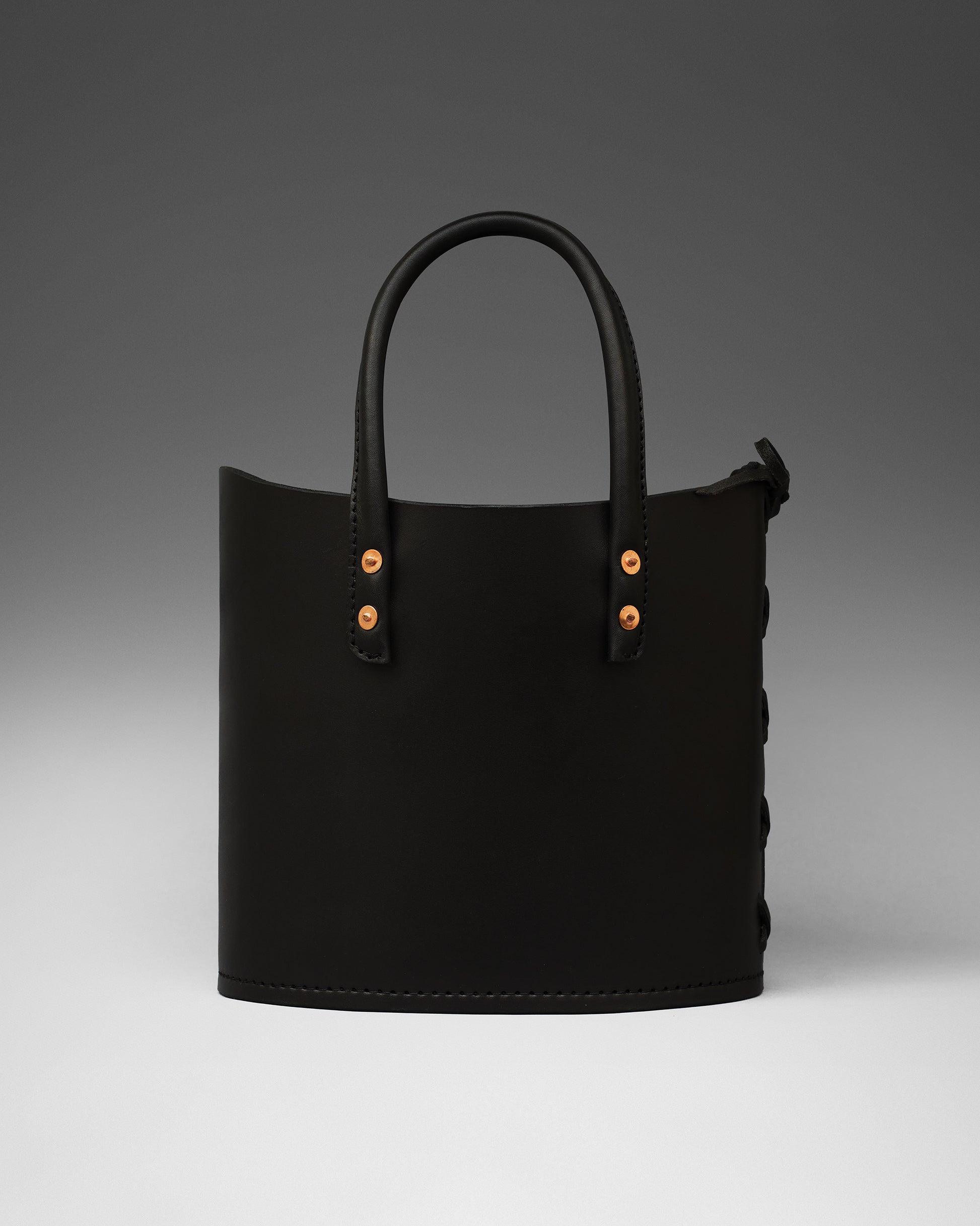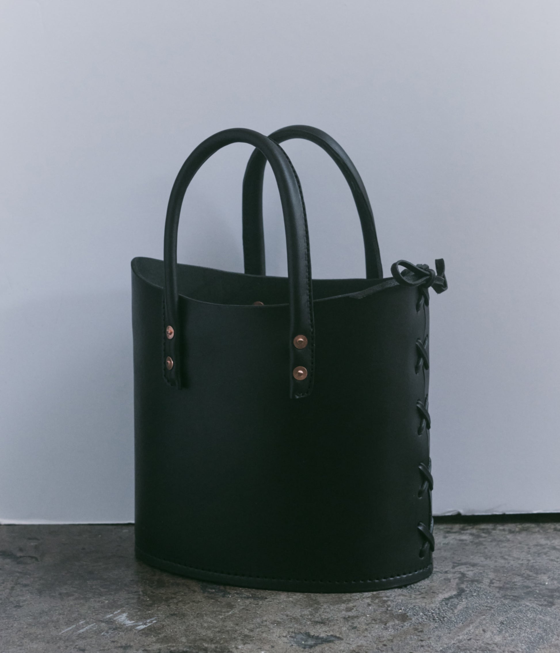 Structured tote bag handcrafted in luxurious bridle leather with tubular solid leather handles, welted constructed base, leather laced side, copper rivets, and open top.