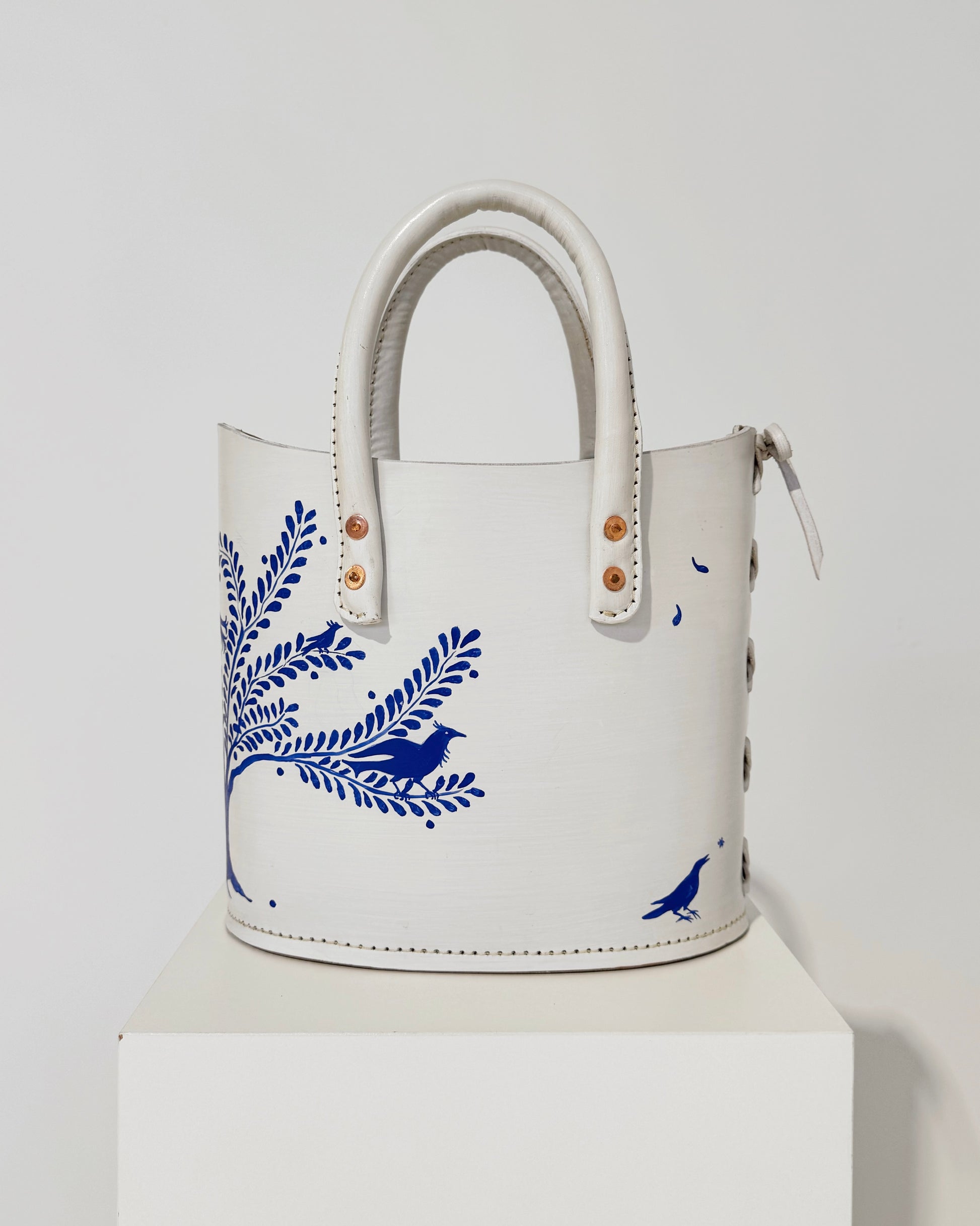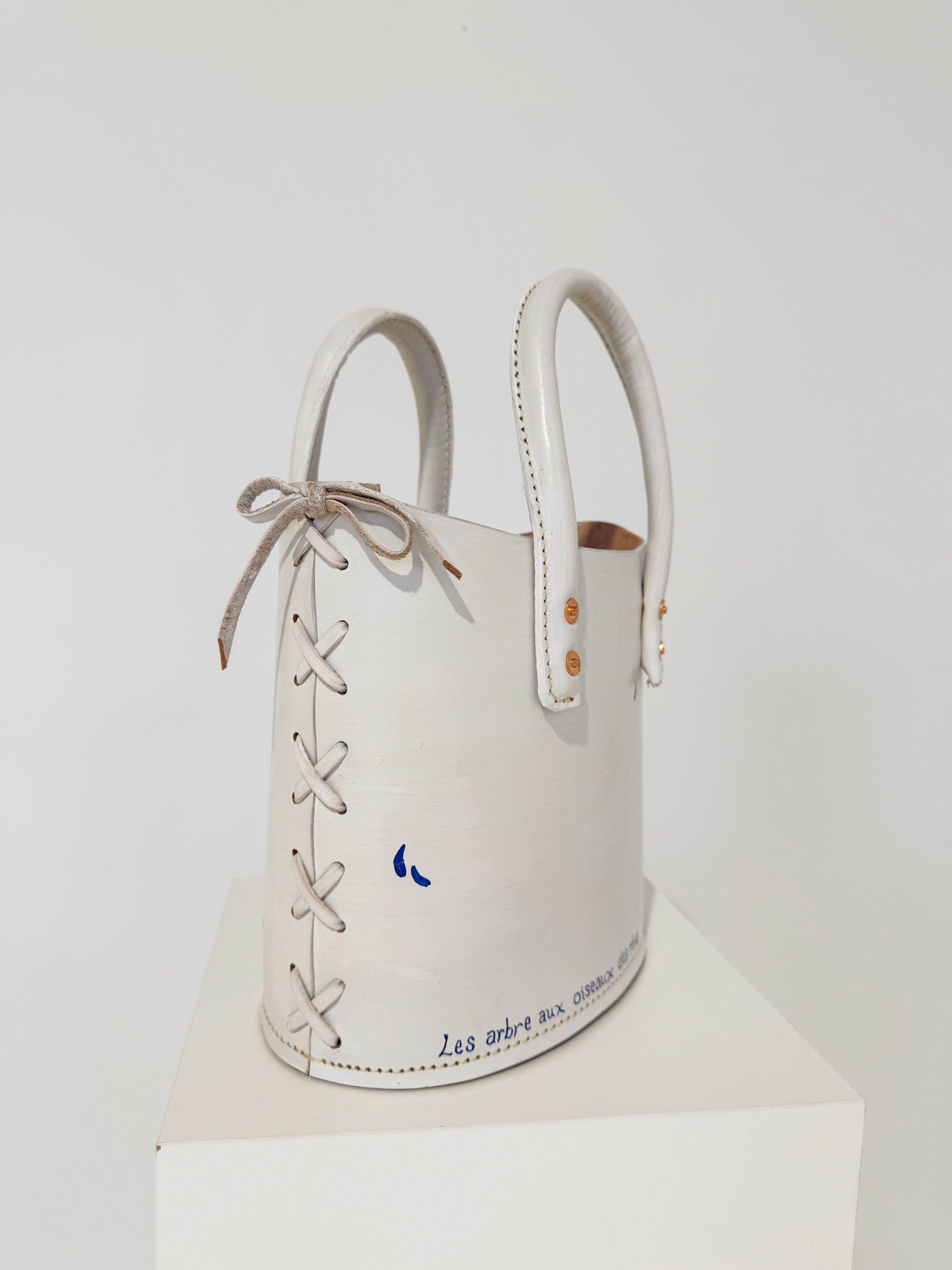 The Leather | We begin with the highest grade of full-grain, vegetable-tanned leather—carefully selected for its clean, unblemished surface. This leather is tanned using traditional, time-intensive methods to preserve its natural integrity. Each hide is then hand-painted in a durable white leather pigment. Once painted, the leather becomes like a perfectly prepared canvas—smooth, luminous, and ready to receive artwork.