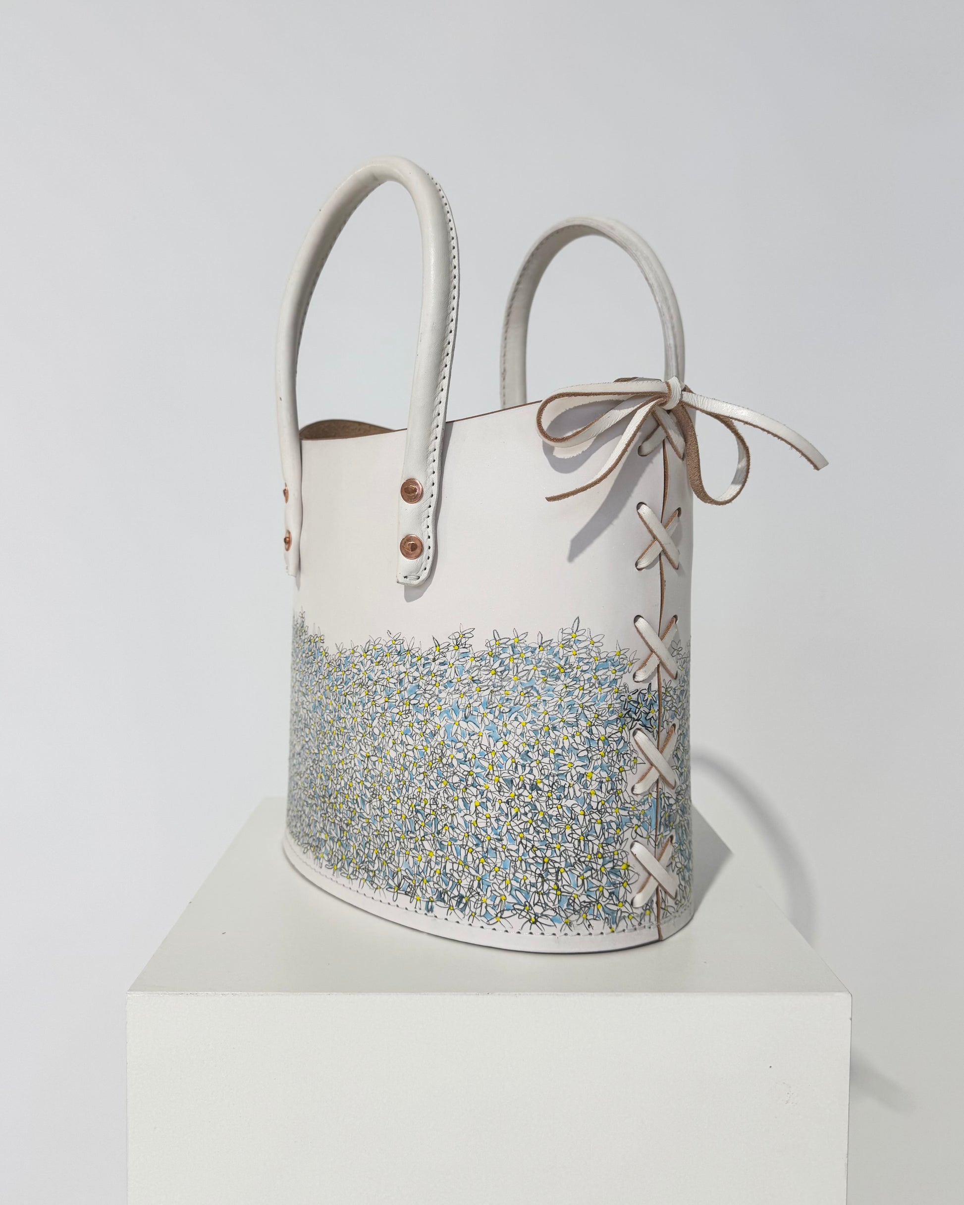 The Leather | We begin with the highest grade of full-grain, vegetable-tanned leather—carefully selected for its clean, unblemished surface. This leather is tanned using traditional, time-intensive methods to preserve its natural integrity. Each hide is then hand-painted in a durable white leather pigment. Once painted, the leather becomes like a perfectly prepared canvas—smooth, luminous, and ready to receive artwork.