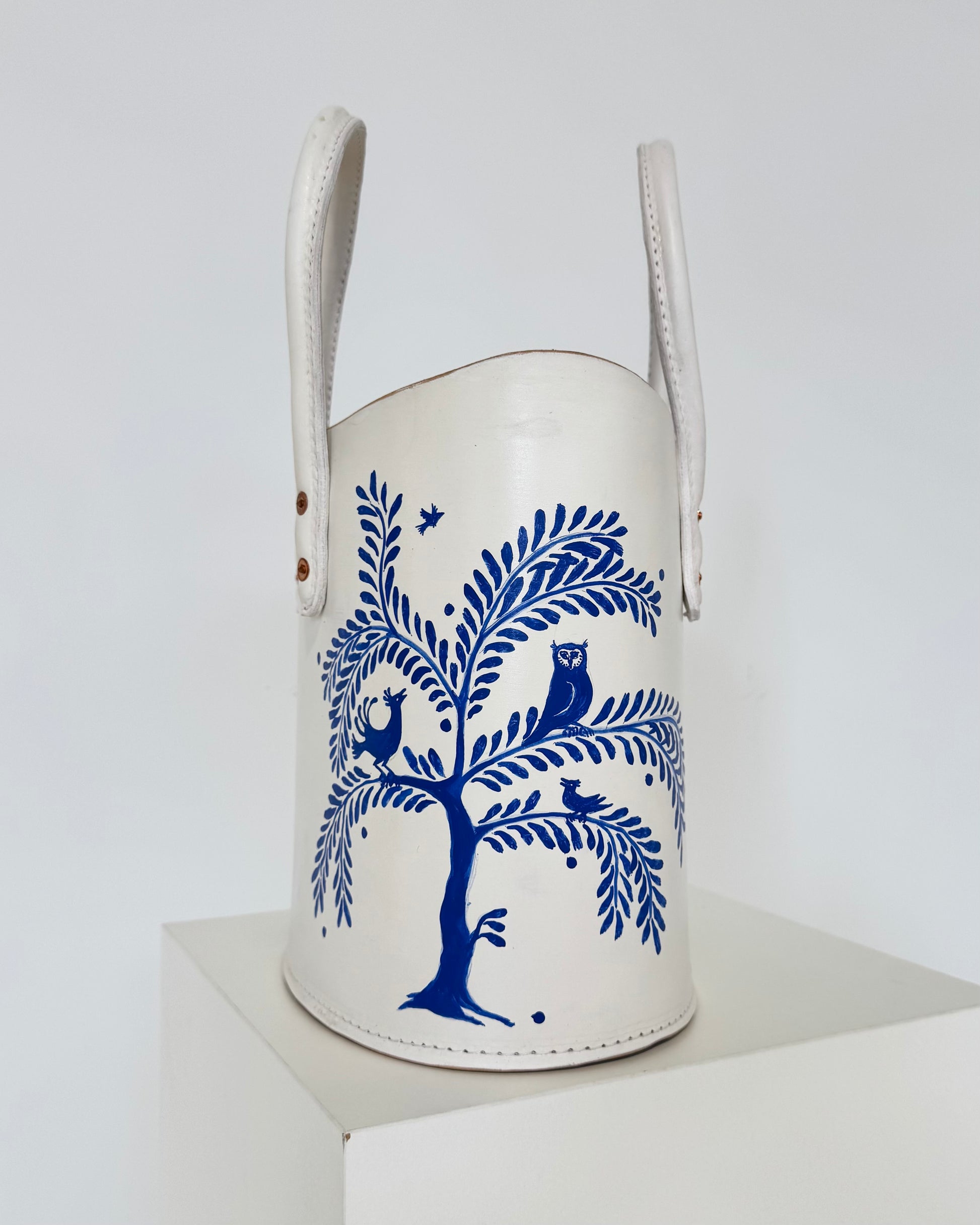 The Leather | We begin with the highest grade of full-grain, vegetable-tanned leather—carefully selected for its clean, unblemished surface. This leather is tanned using traditional, time-intensive methods to preserve its natural integrity. Each hide is then hand-painted in a durable white leather pigment. Once painted, the leather becomes like a perfectly prepared canvas—smooth, luminous, and ready to receive artwork.