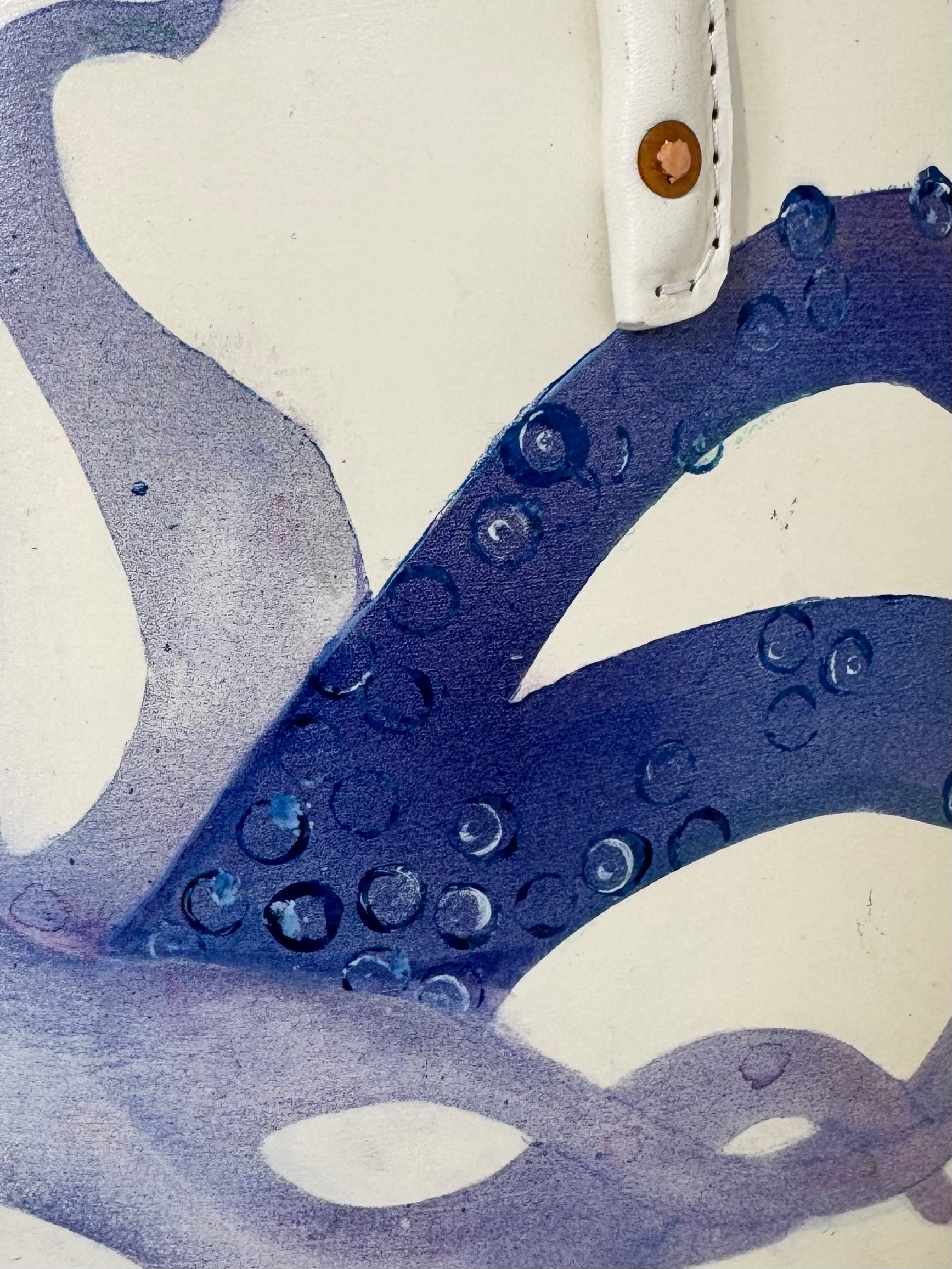 The Leather | We begin with the highest grade of full-grain, vegetable-tanned leather—carefully selected for its clean, unblemished surface. This leather is tanned using traditional, time-intensive methods to preserve its natural integrity. Each hide is then hand-painted in a durable white leather pigment. Once painted, the leather becomes like a perfectly prepared canvas—smooth, luminous, and ready to receive artwork.