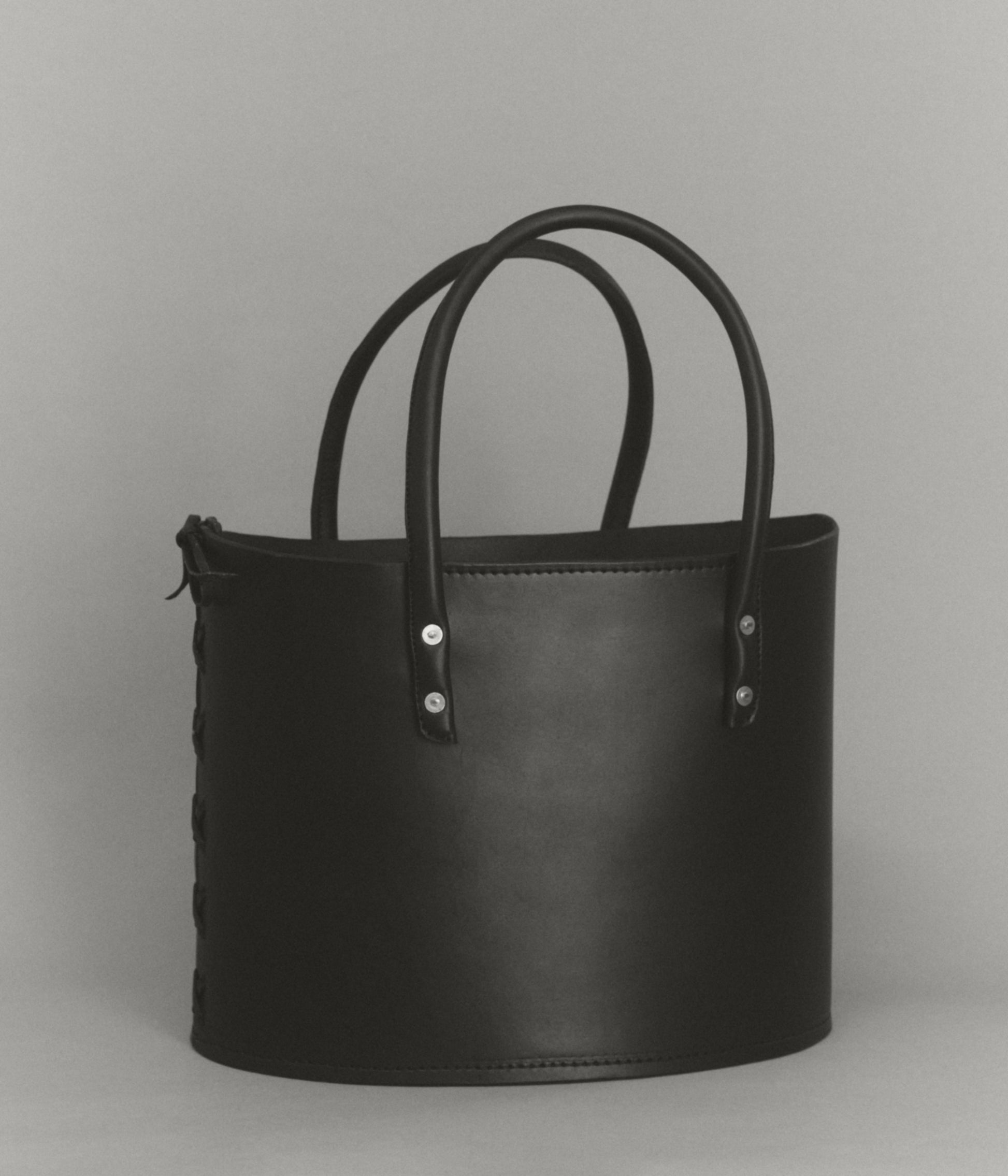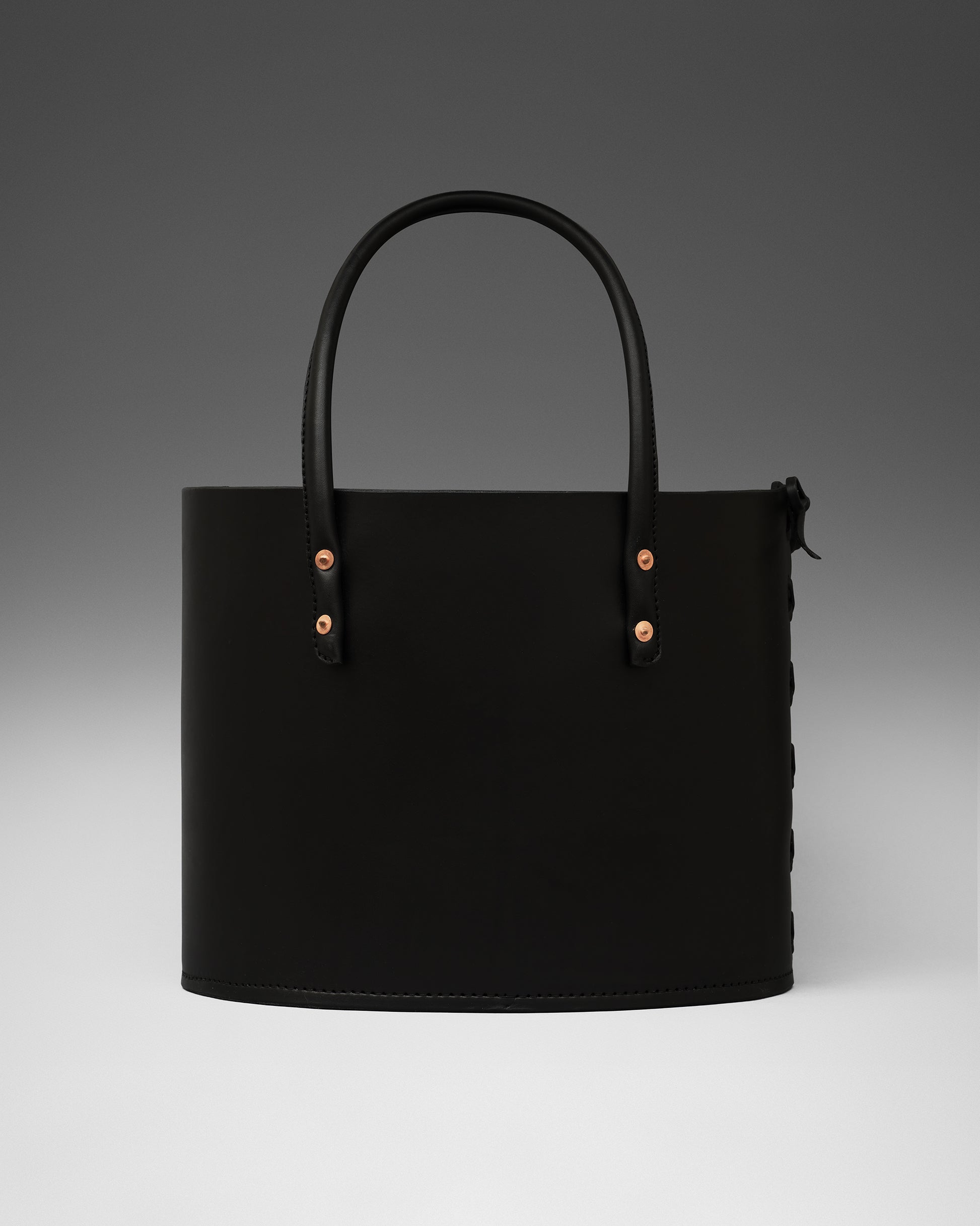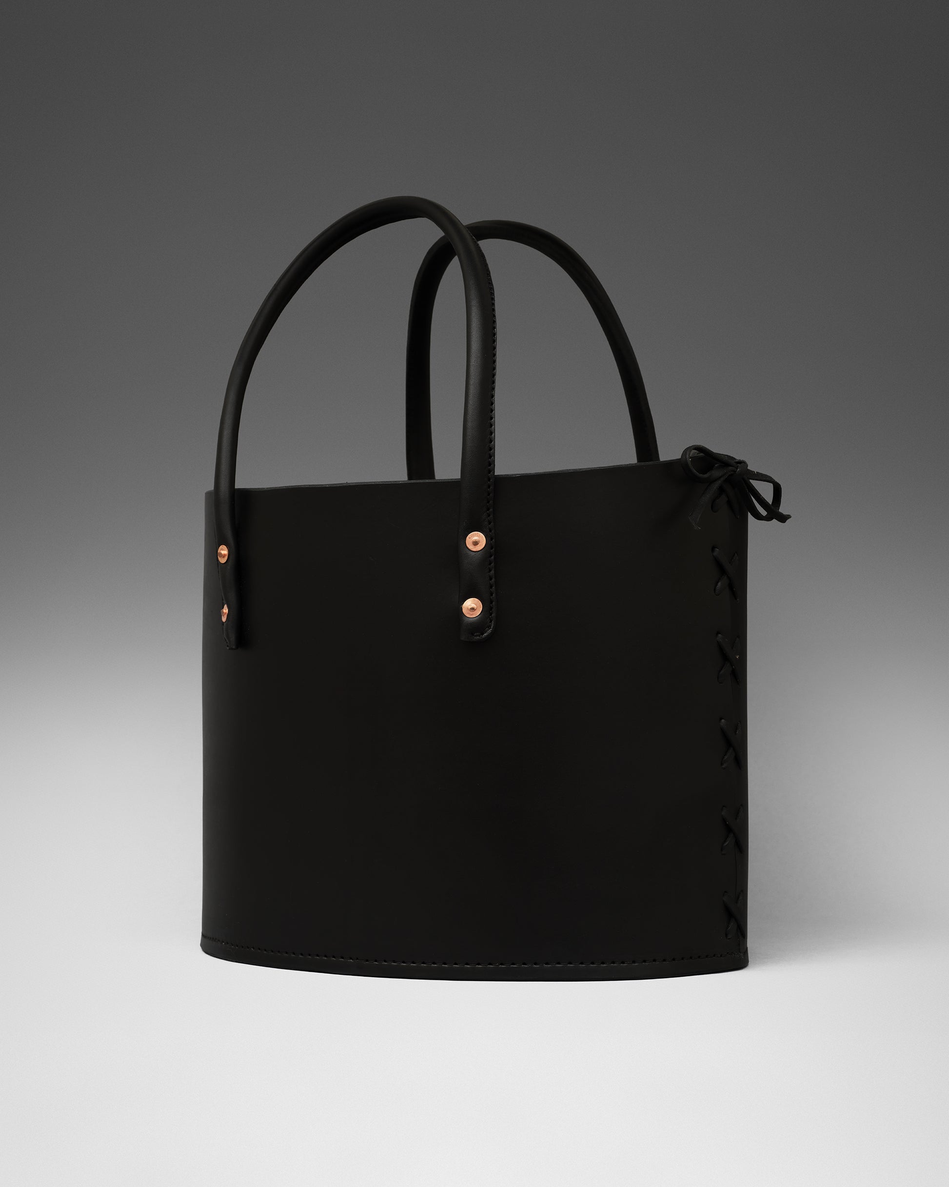 Structured tote bag handcrafted in luxurious bridle leather with tubular solid leather handles, welted constructed base, leather laced side, copper rivets, and open top.