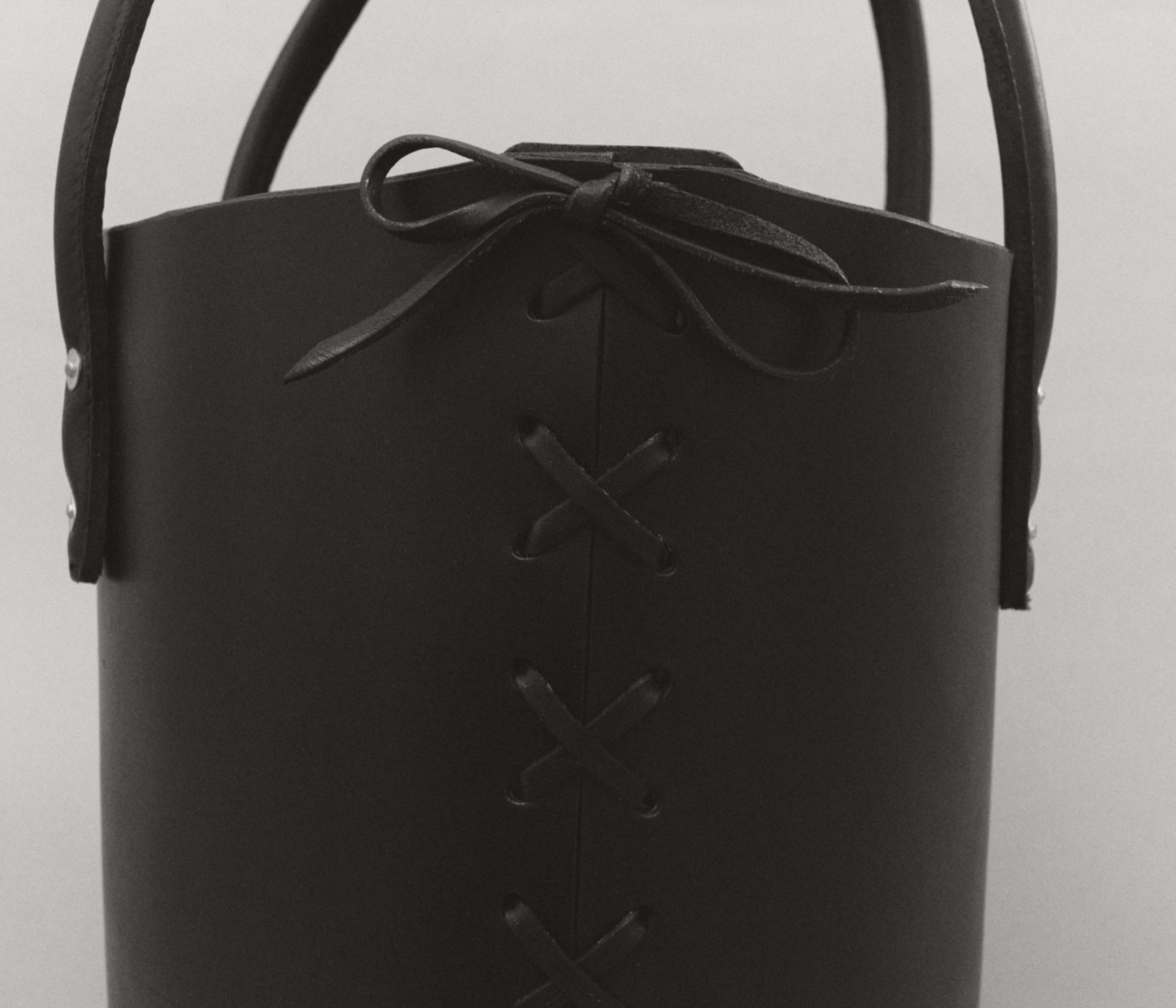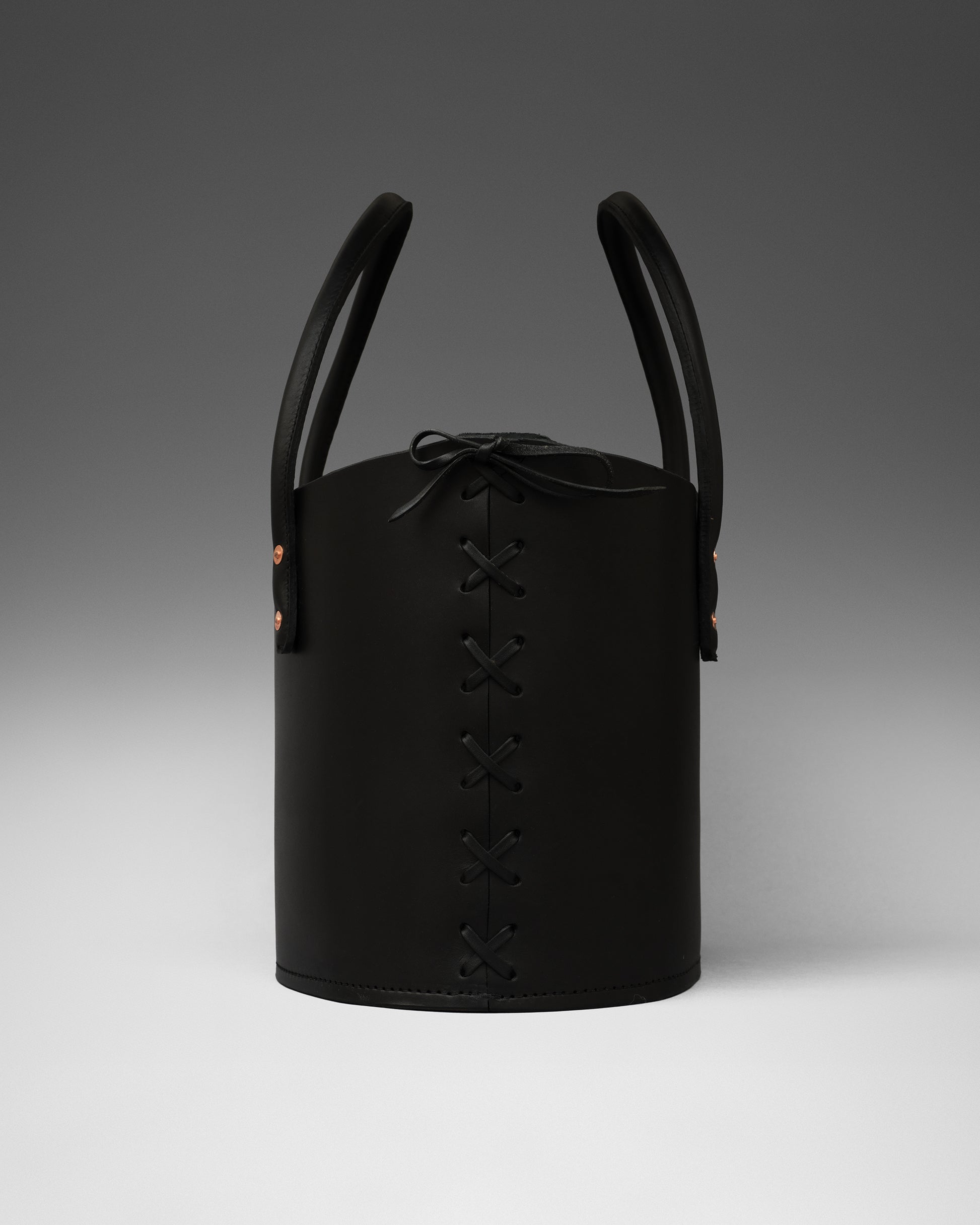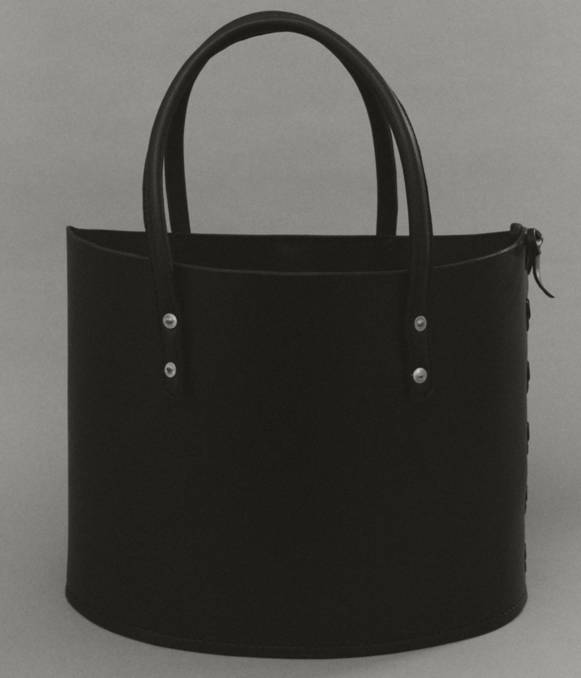 Structured tote bag handcrafted in luxurious bridle leather with tubular solid leather handles, welted constructed base, leather laced side, copper rivets, and open top.