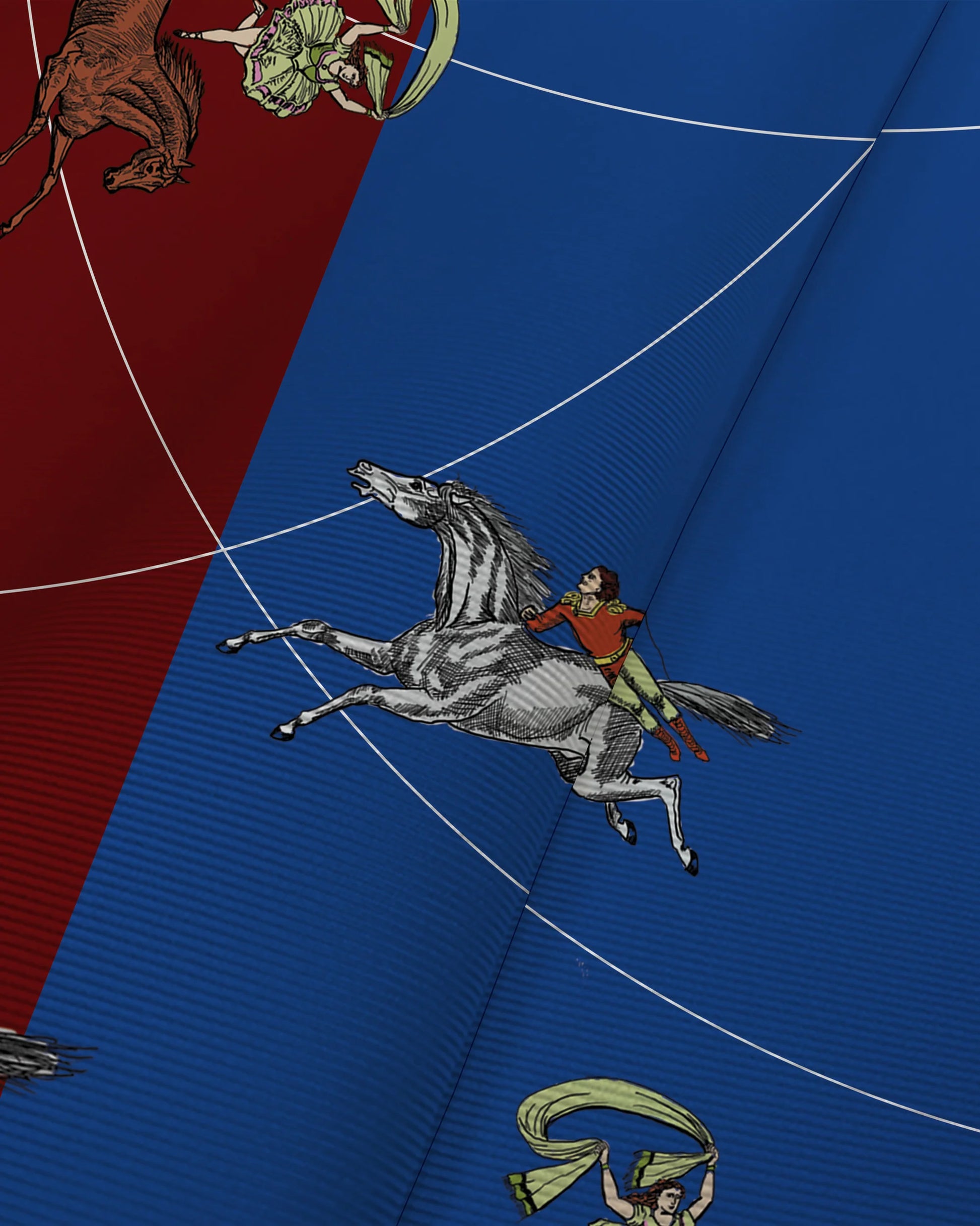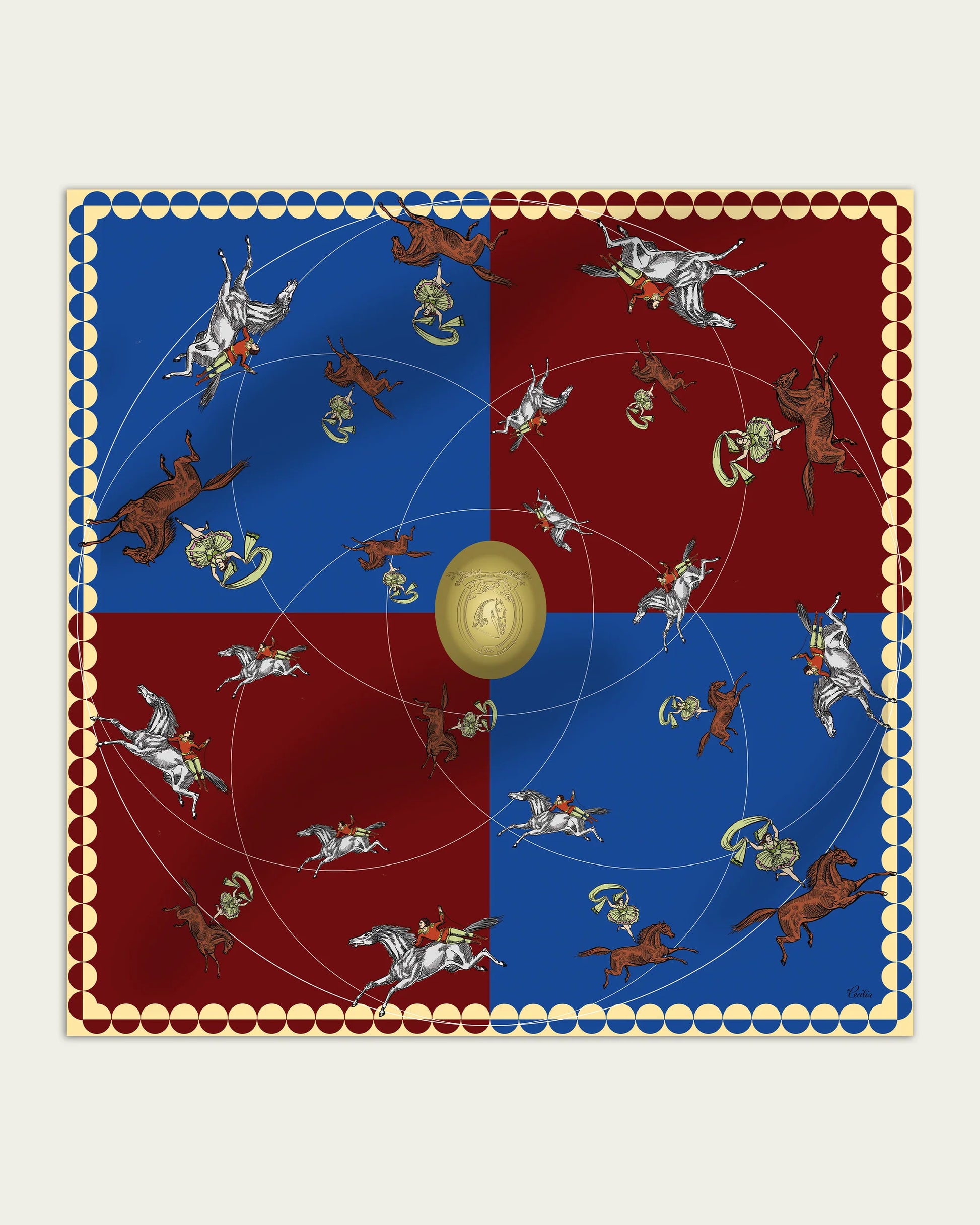 This large silk square scarf features beautifully hand-drawn riders and horses in motion, captured in a classic color palette of classic ivory and black. The design draws inspiration from the timeless charm of a carousel, the figures dance and leap in rhythmic patterns that draw the eye around the design. A joyful, elegant piece that brings movement and warmth to any outfit.