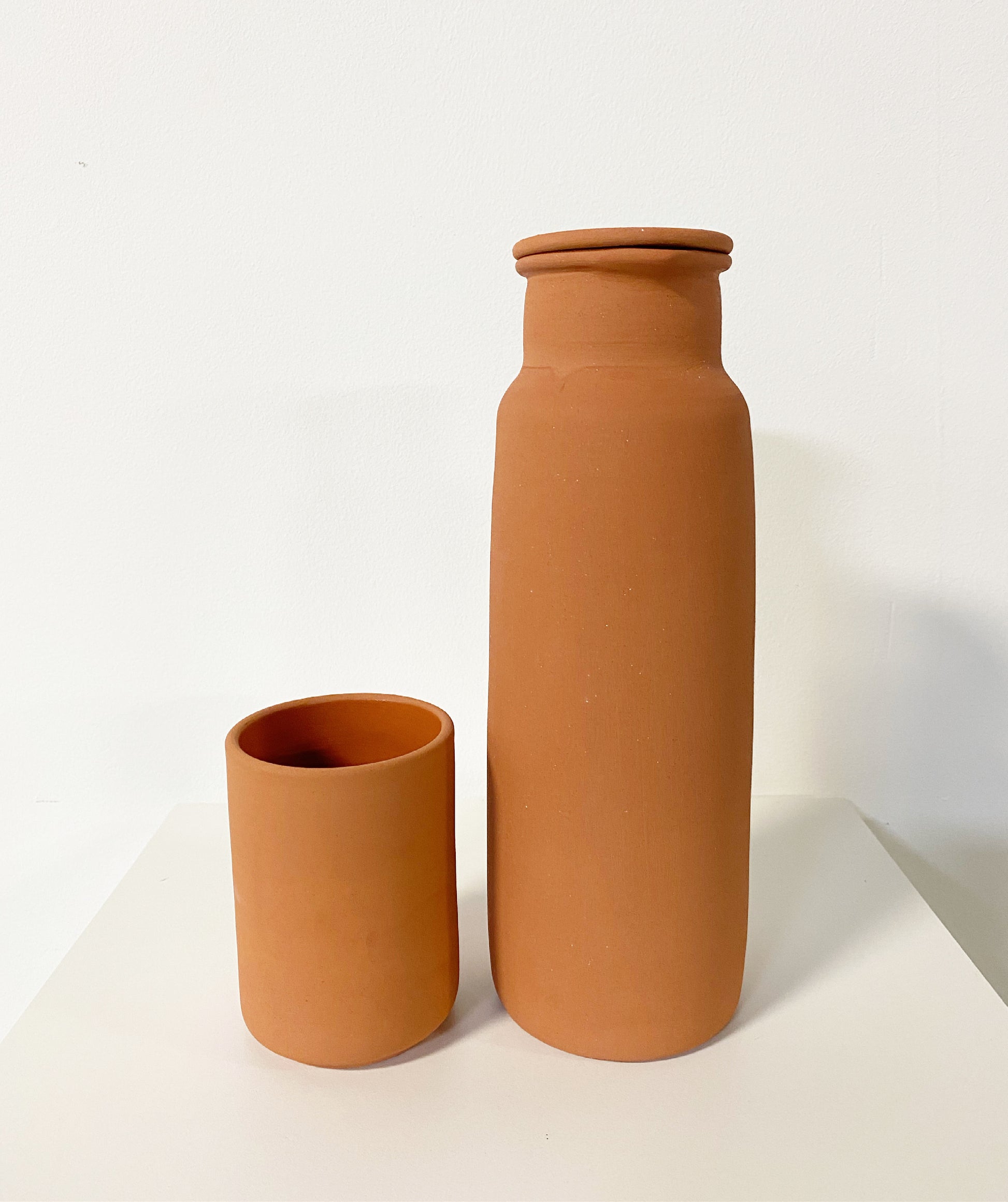 Please note, these are water tight but slightly 'perspire,' as clay absorbs heat from water as part of the cooling process. Ayurveda recommends storing water in ceramic vessels as there are many health benefits, including clay being alkaline in nature. Storing water in clay helps to maintain the ph balance in our body.