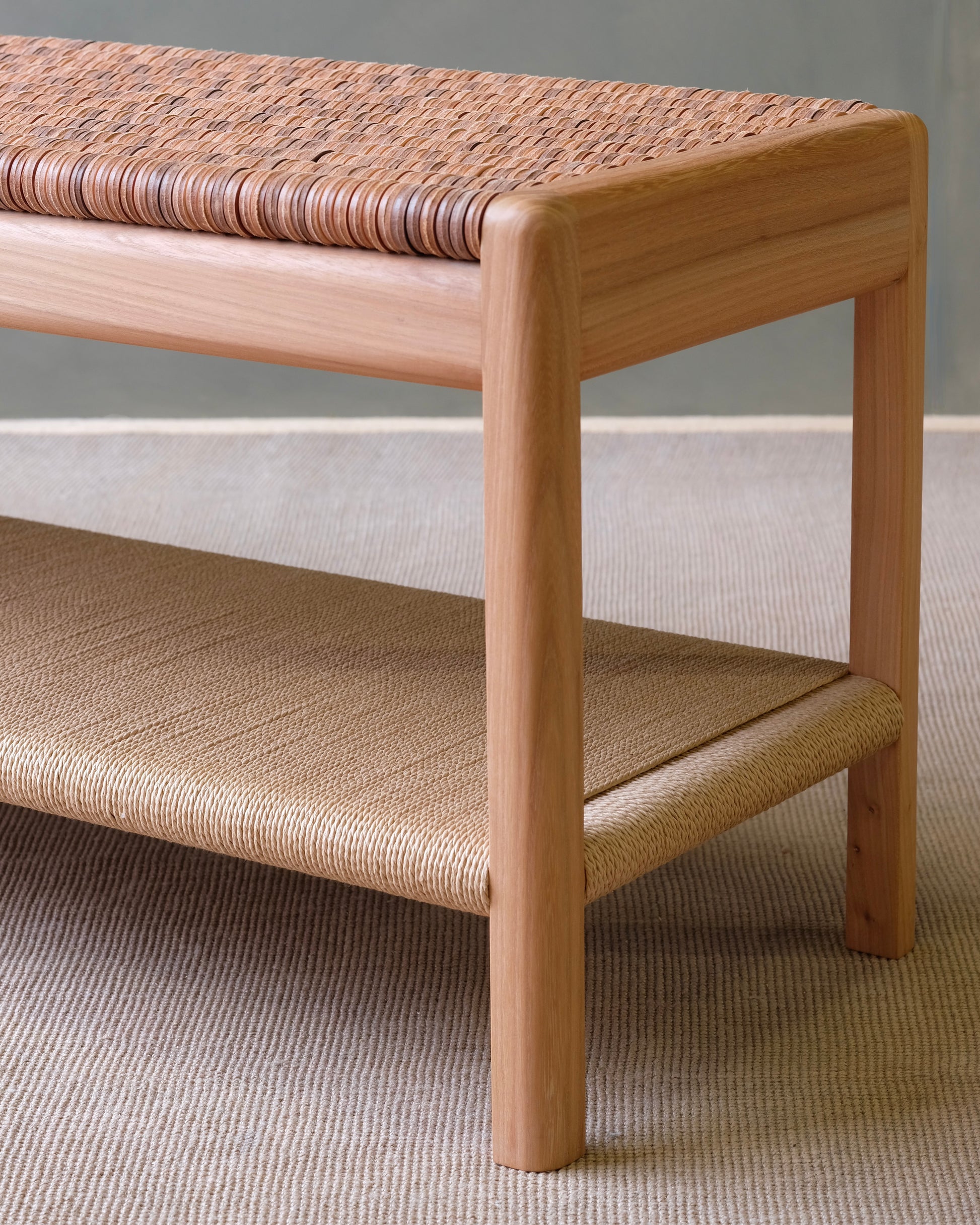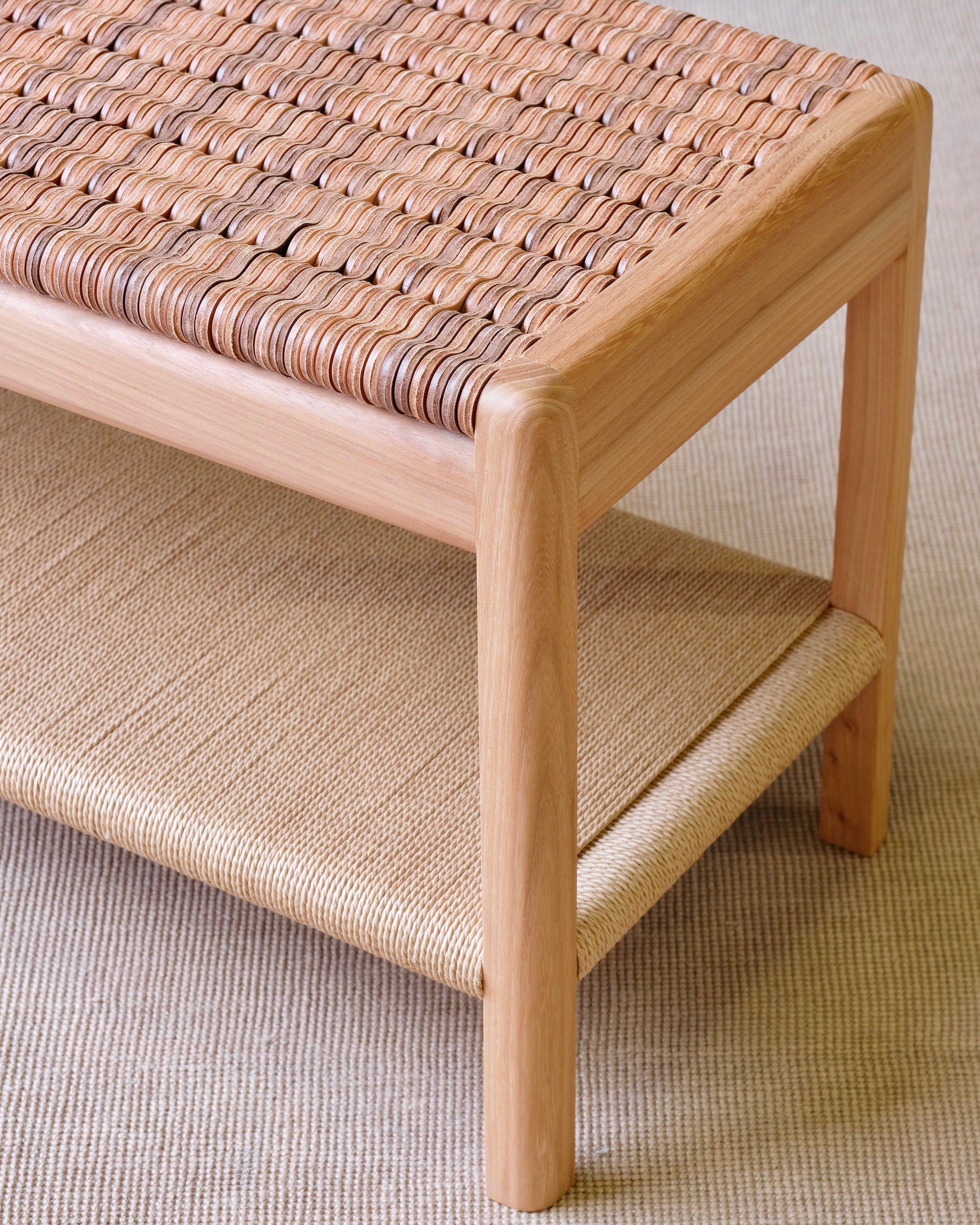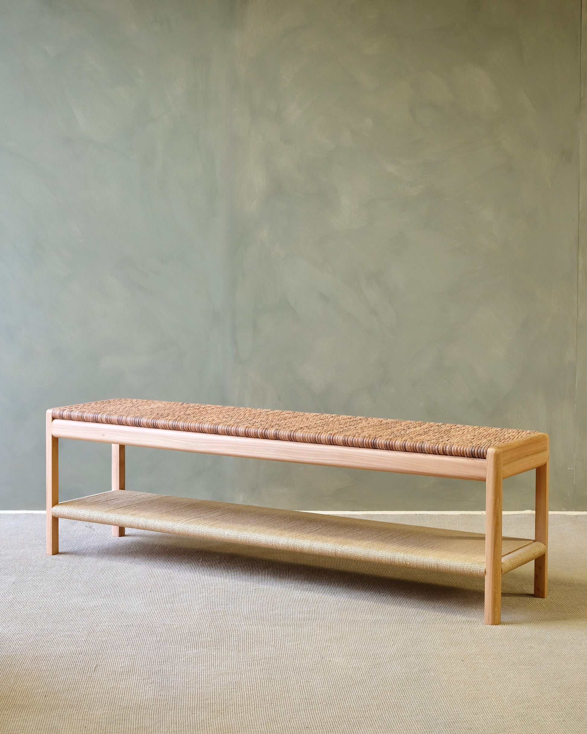 No leather scrap goes unused in Studio OTZI's workshop. As a material, leather is laborious and expensive to produce so they make a point to use each hide to the fullest. Inspired by traditional conveyor belts, formed of links like bicycle chains, the Click bench ensures that every scrap and off-cut gets put to good use. Leather is punched out, then threaded onto lengths of dowel and mounted. The profiles of the frame are set to match the leather, inviting the hand to engage with the warmth of the piece. The undulating surface itself demands tactile engagement, and will burnish with use. The bench is finished with a papercord-wrapped shelf underneath, a final accent that extends function and references traditional, cord-wrapped footstools. Perfect for a hallway or bedroom, the Click bench can be modified to almost any length or dimension, and curved around radiuses. Because of the nature of the off-cuts used, each bench will have its own, unique character.