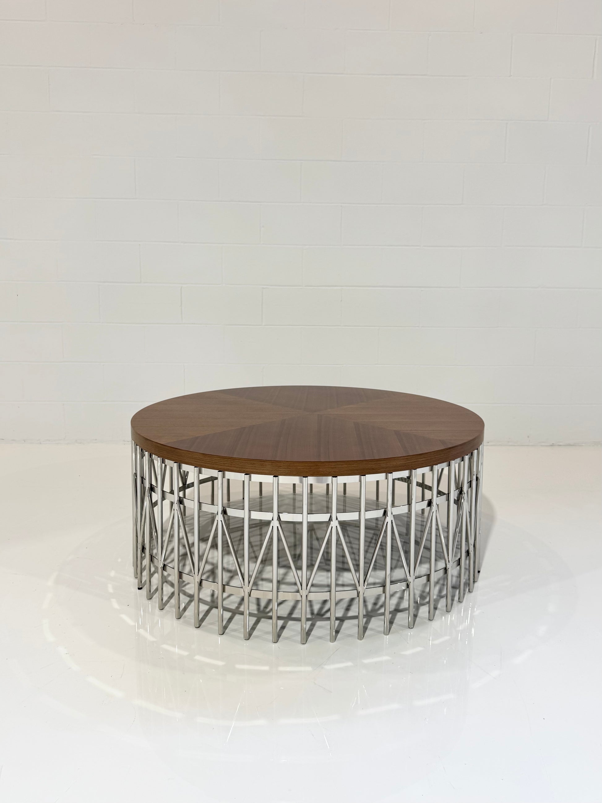 Vintage coffee table with a walnut top and metal base. We have a second table with a bronze finish on the legs.