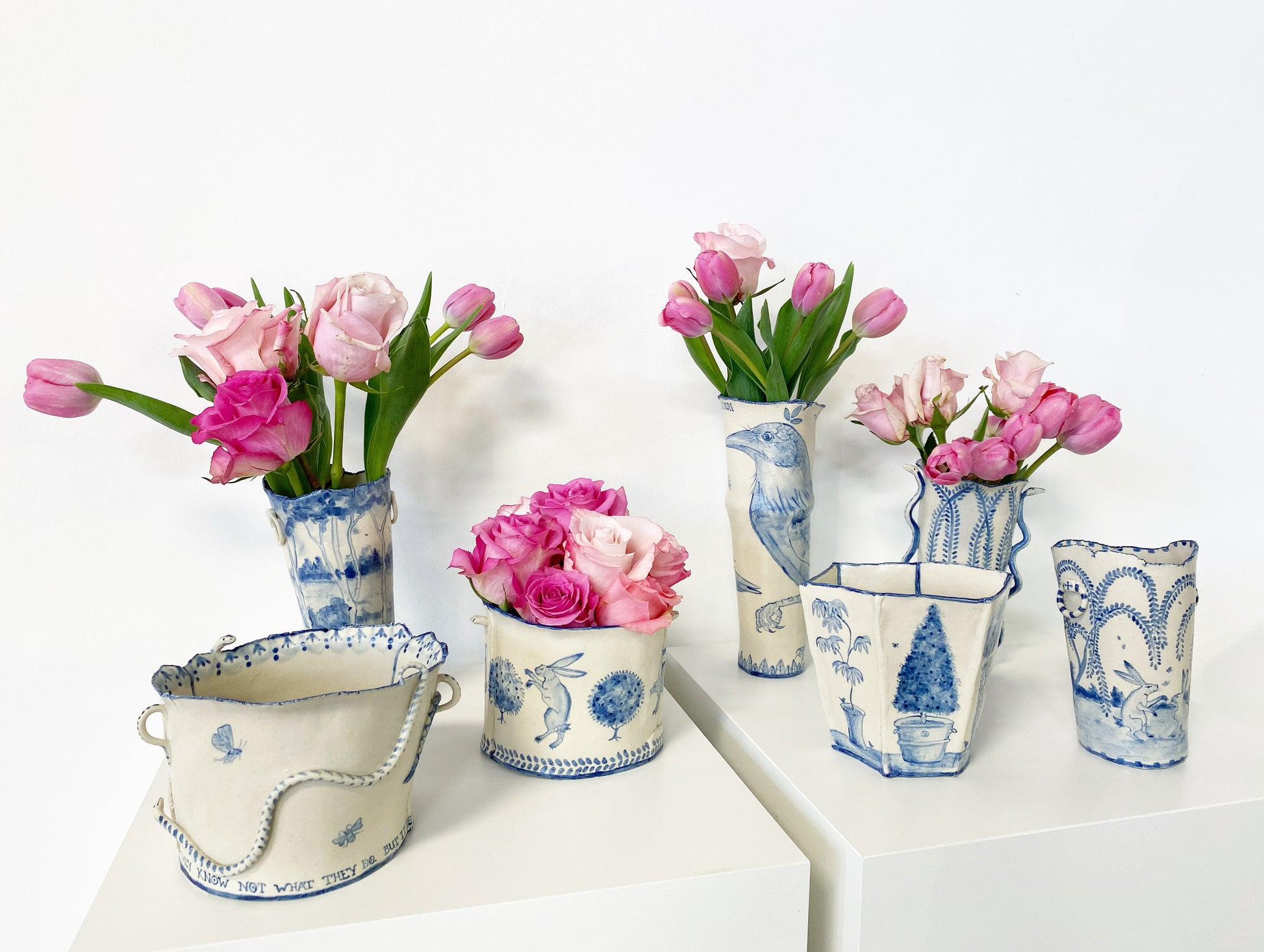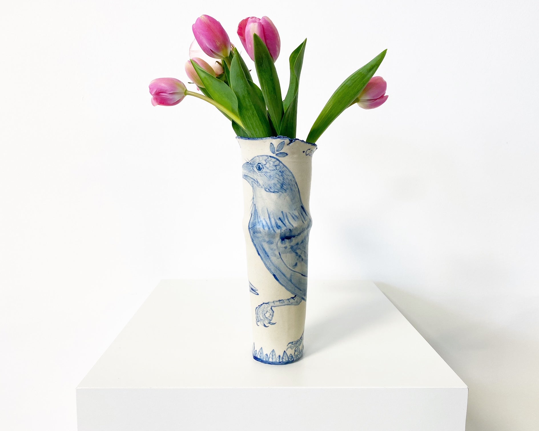 The Country Gentleman Collection by artist Maggie Robertson is a beautiful series of one-of-a-kind stoneware vessels. Each unique piece embraces the seams and irregularities of her hand-built technique complemented by intricate, hand-painted scenes of the English countryside in classic blue and white. The vessels are water tight and food safe, microwaveable and dishwasher safe; however, as they are art pieces and fragile, we would recommend hand washing.