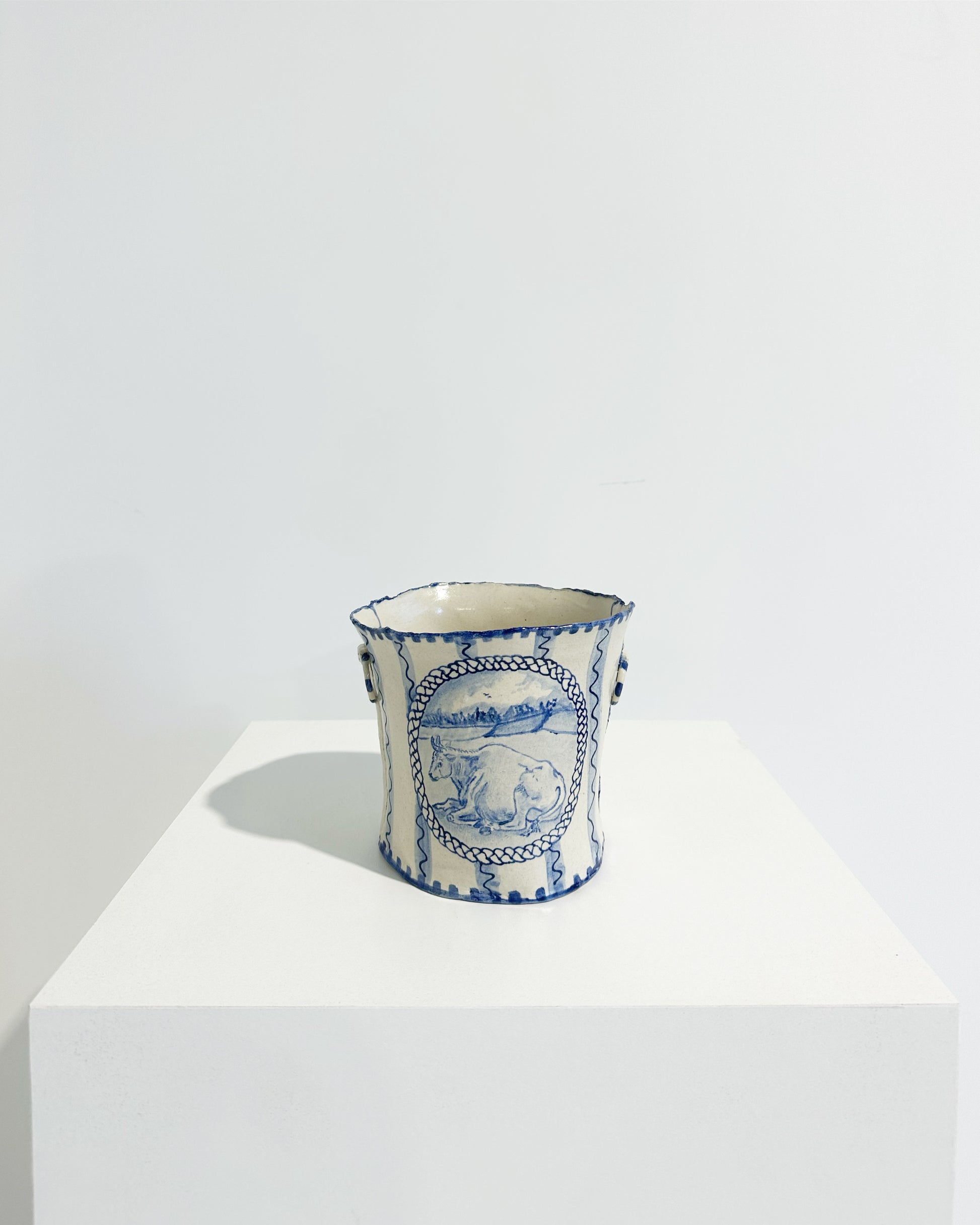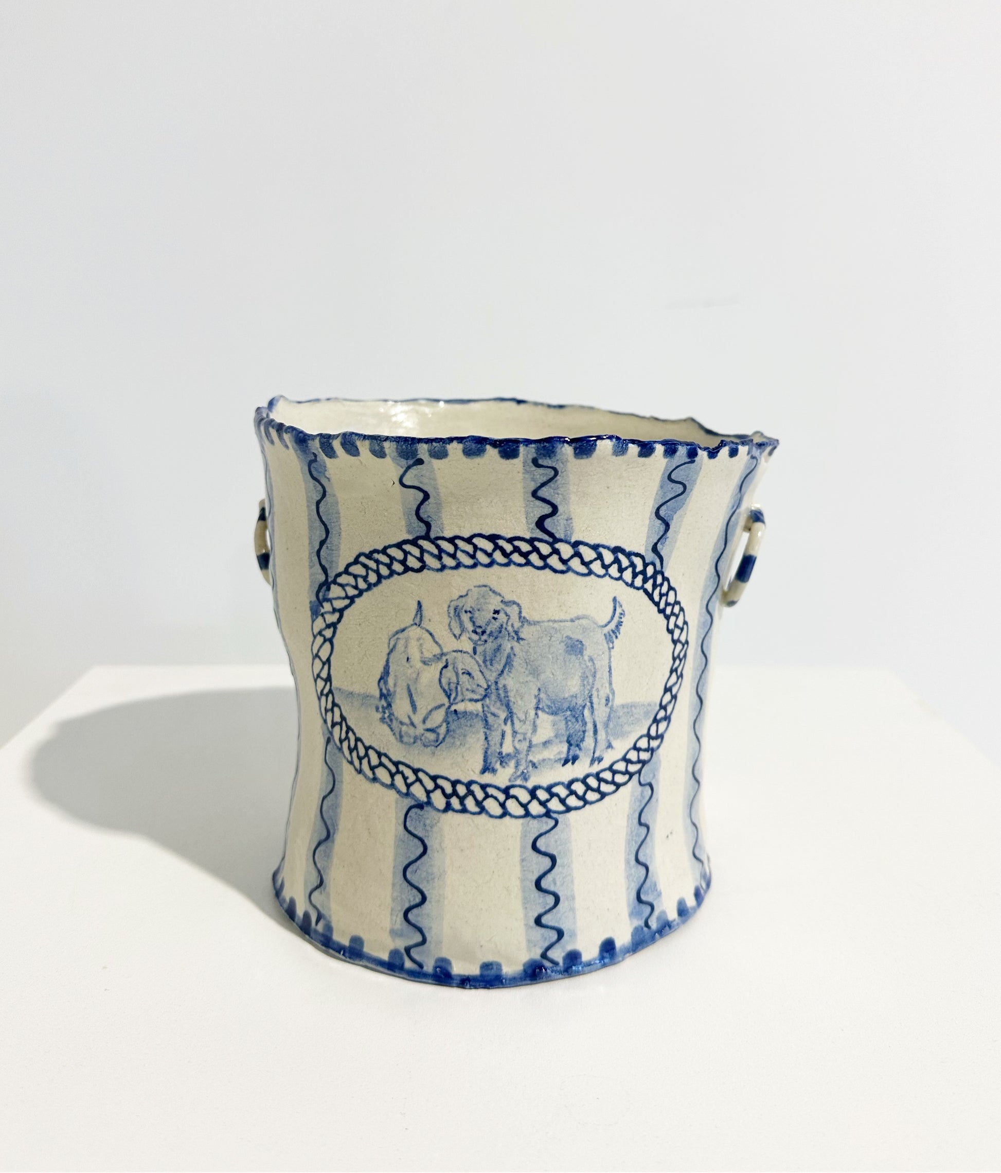 The Country Gentleman Collection by artist Maggie Robertson is a beautiful series of one-of-a-kind stoneware vessels. Each unique piece embraces the seams and irregularities of her hand-built technique complemented by intricate, hand-painted scenes of the English countryside in classic blue and white. The vessels are water tight and food safe, microwaveable and dishwasher safe; however, as they are art pieces and fragile, we would recommend hand washing.