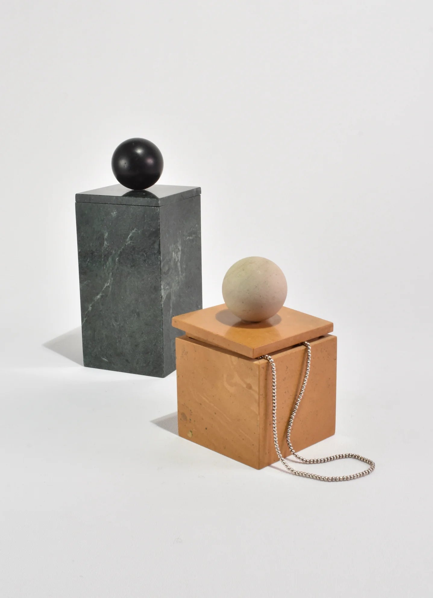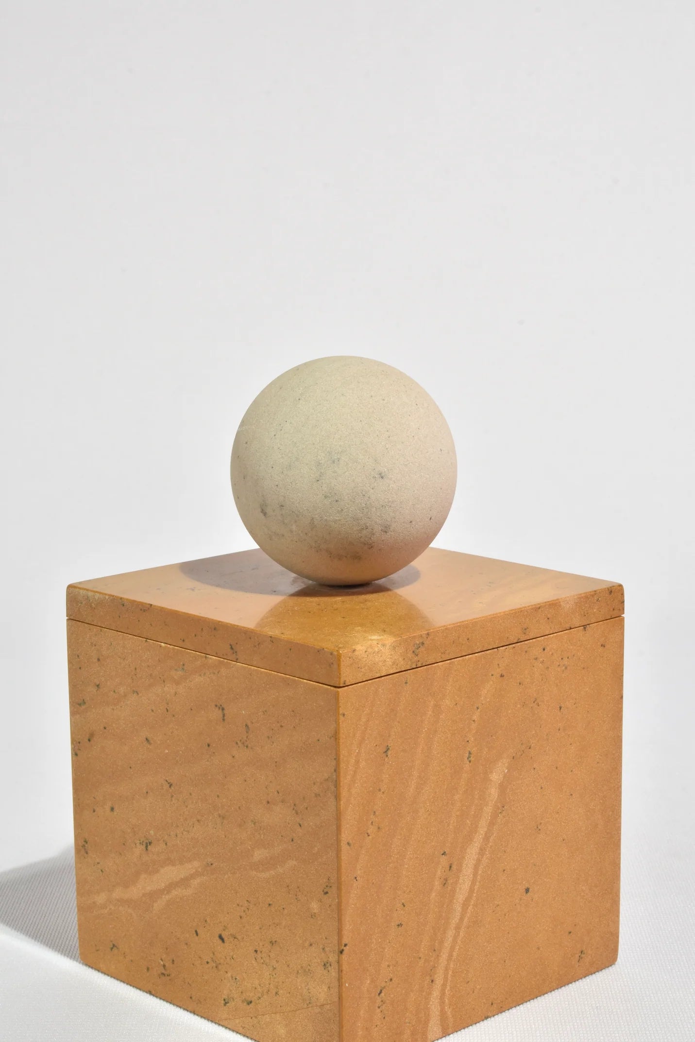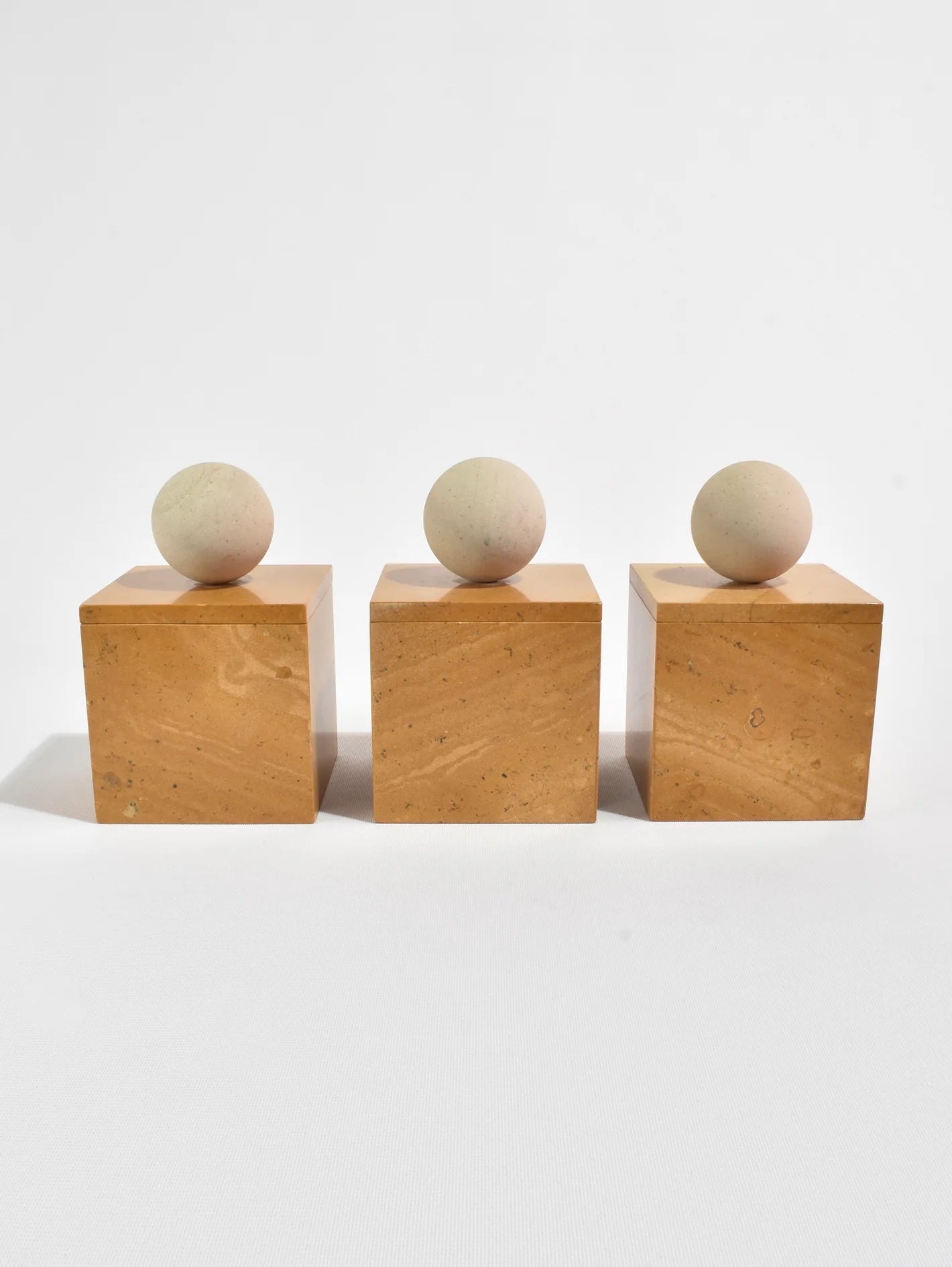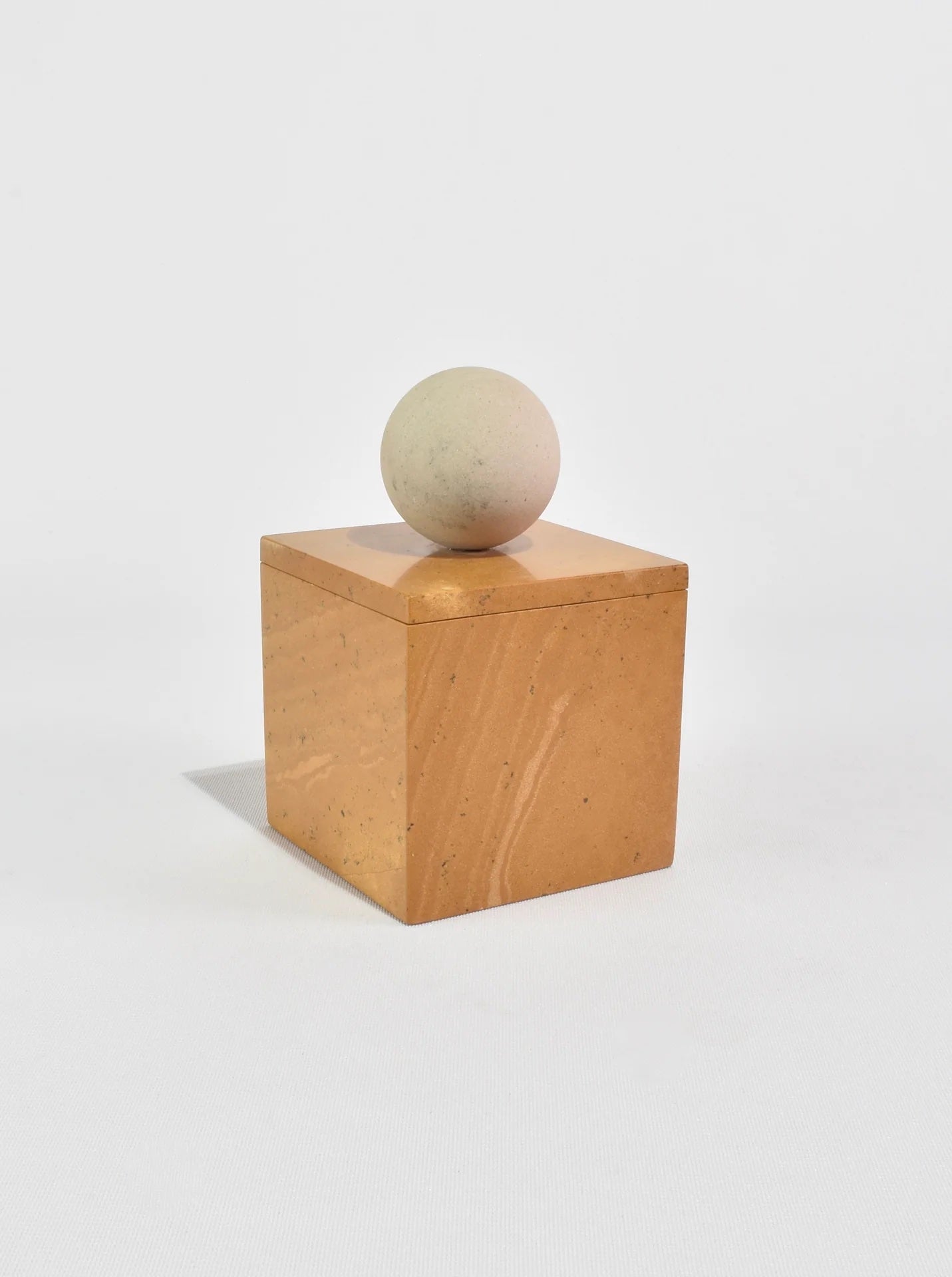 The Curio Box by Casa Shop in Yellow Jaisalmer with Beige Sandstone. Inspired by a favorite vintage find, each box features a square base with a sphere handle. Handmade by artisans in India.