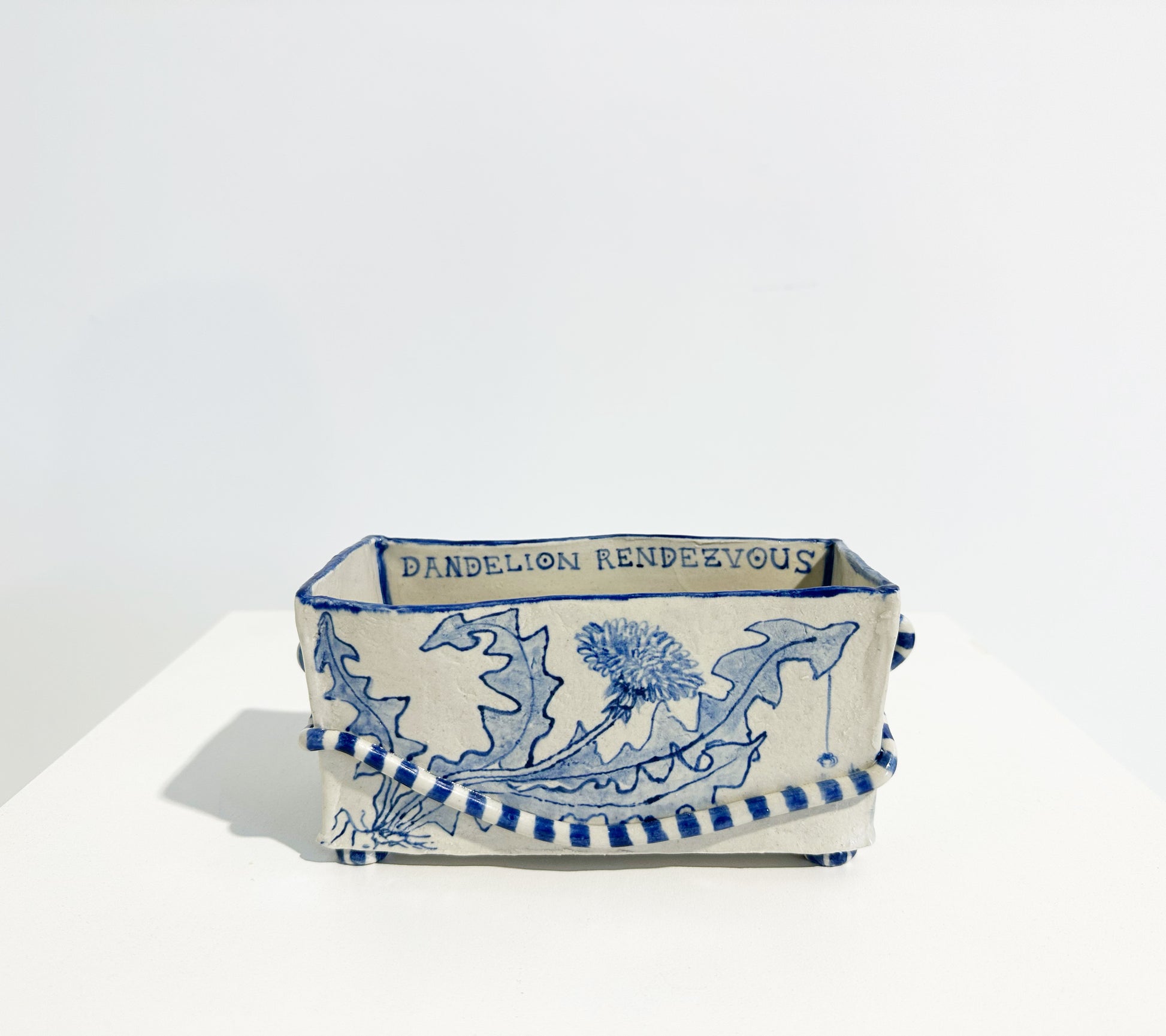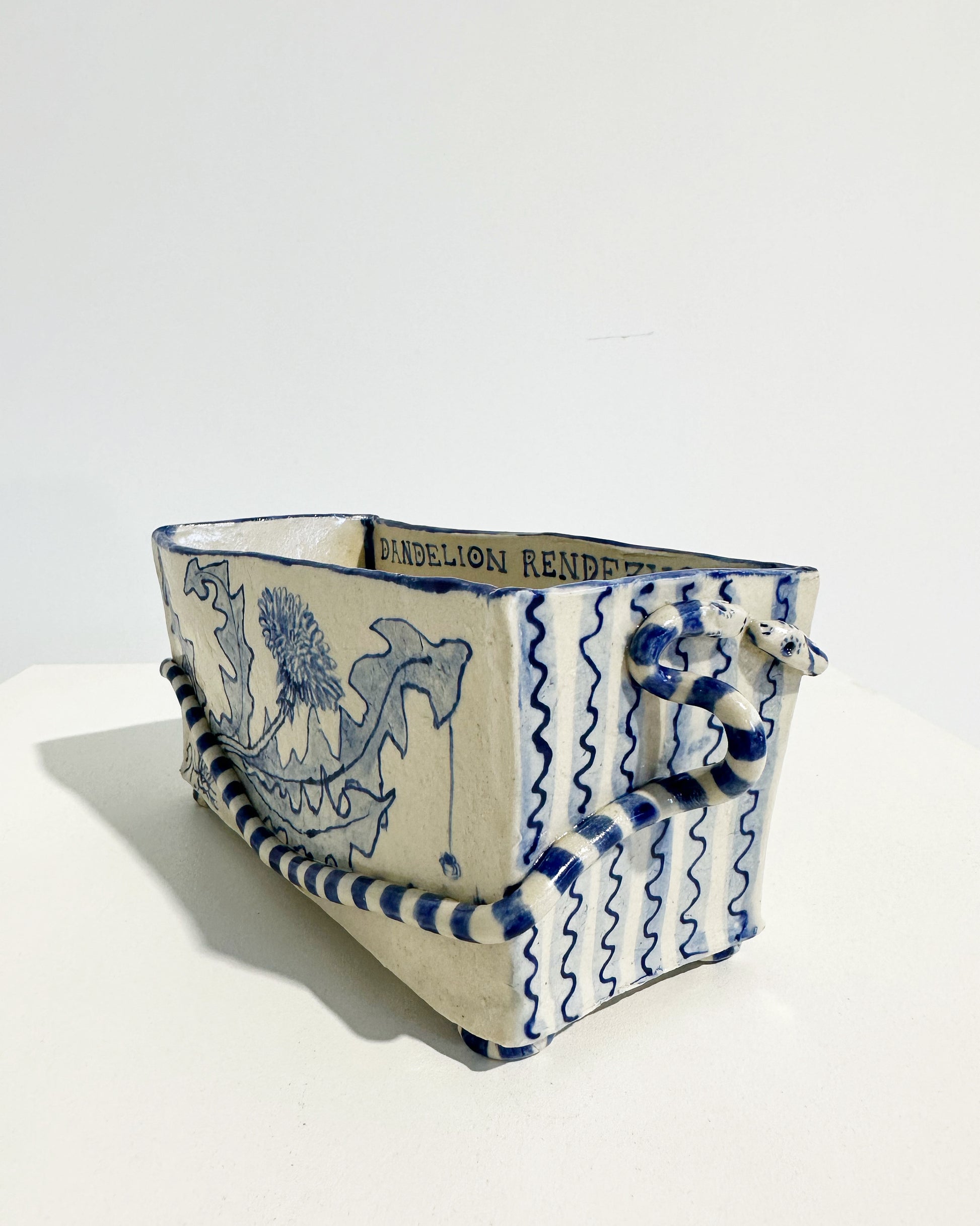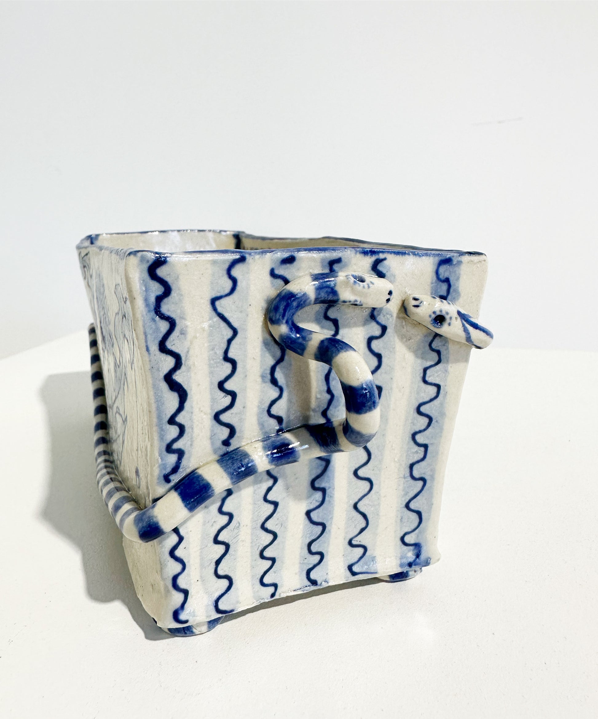 The Country Gentleman Collection by artist Maggie Robertson is a beautiful series of one-of-a-kind stoneware vessels. Each unique piece embraces the seams and irregularities of her hand-built technique complemented by intricate, hand-painted scenes of the English countryside in classic blue and white. The vessels are water tight and food safe, microwaveable and dishwasher safe; however, as they are art pieces and fragile, we would recommend hand washing.