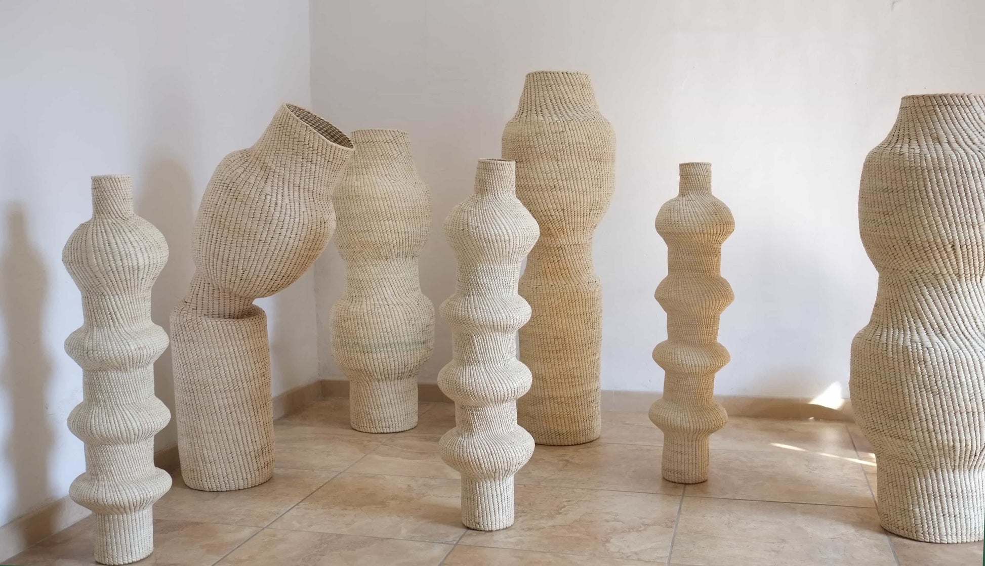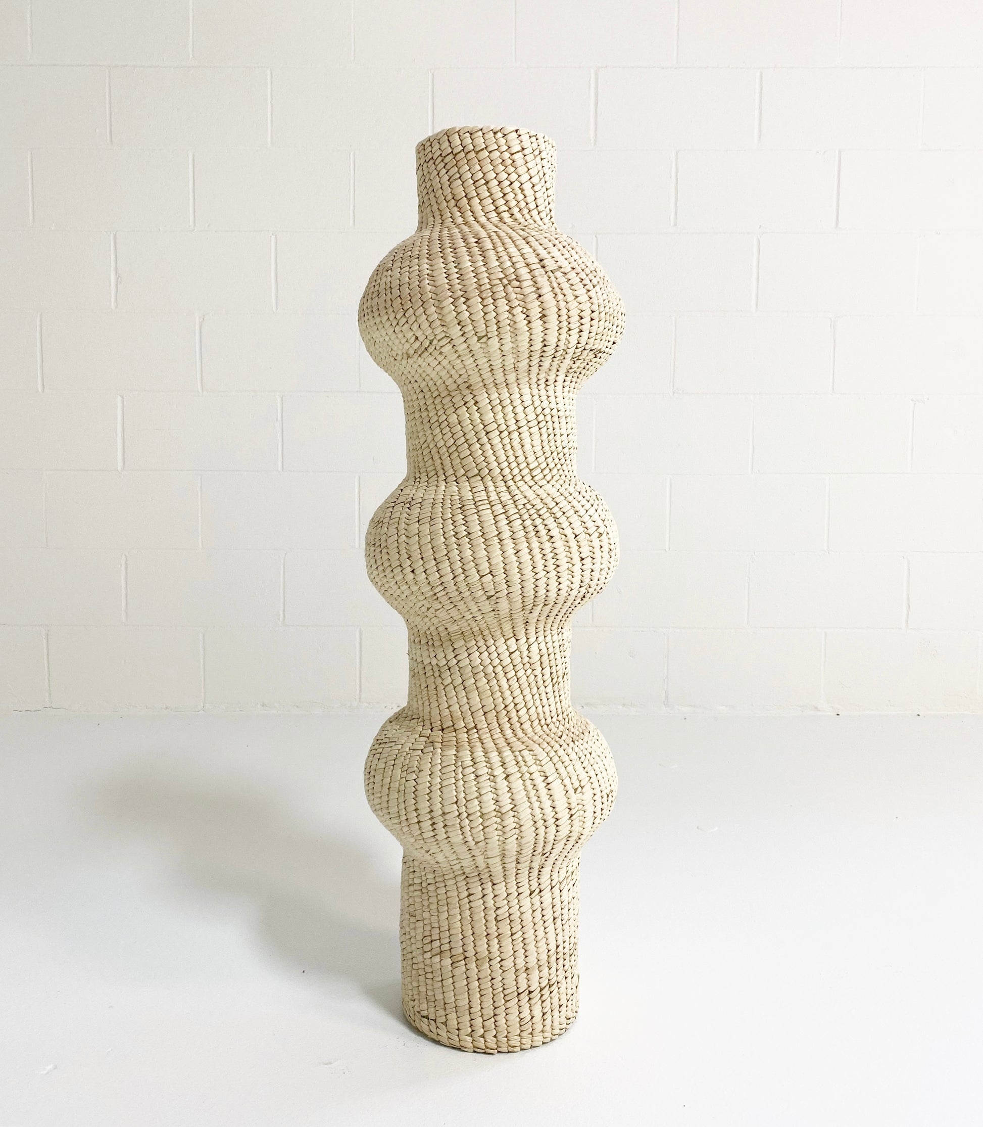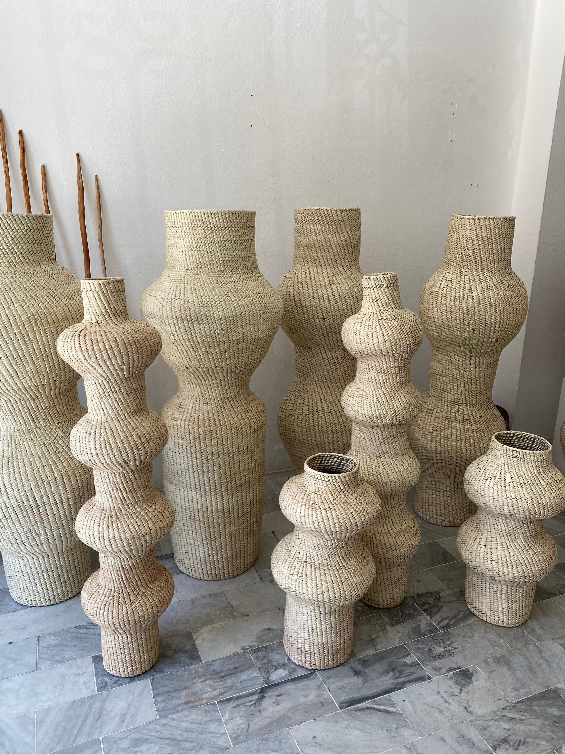 The Family series of palm sculptures is inspired by the artisan families who work with Rrres studio. The sculptures are created using traditional techniques. Each is reinforced for greater durability and to achieve the large volume. The beautiful palm material changes color as it ages. In its youngest state, it is a warm yellow, as they get older, the color changes to a salmon tone.