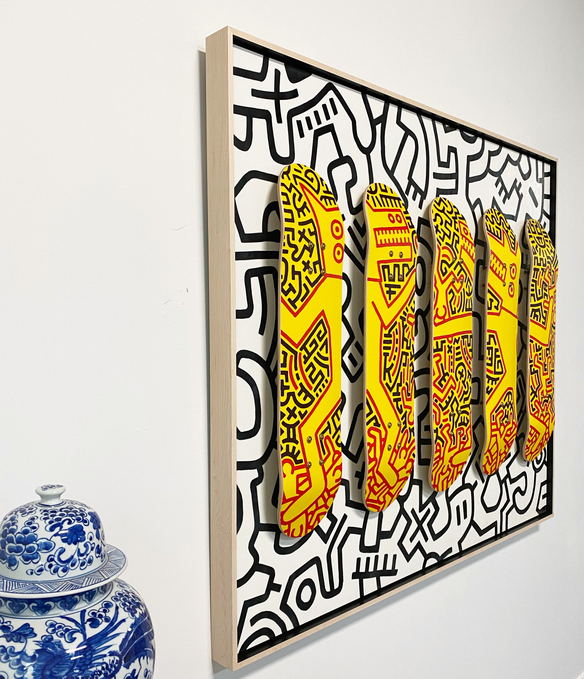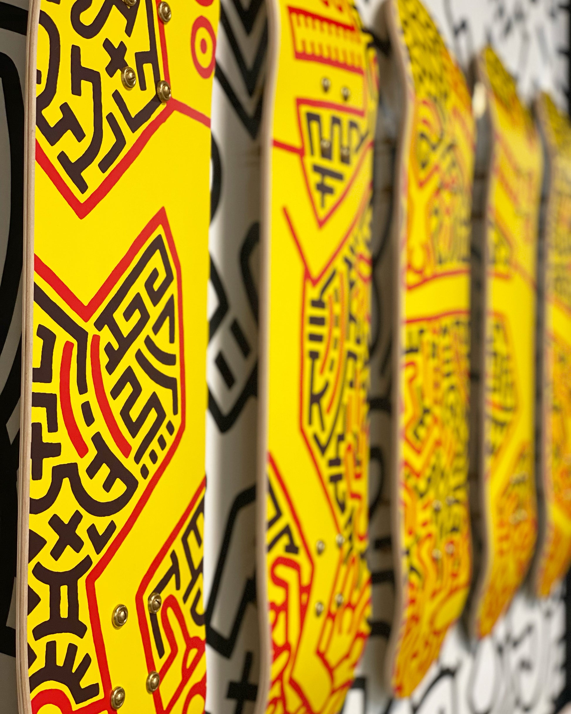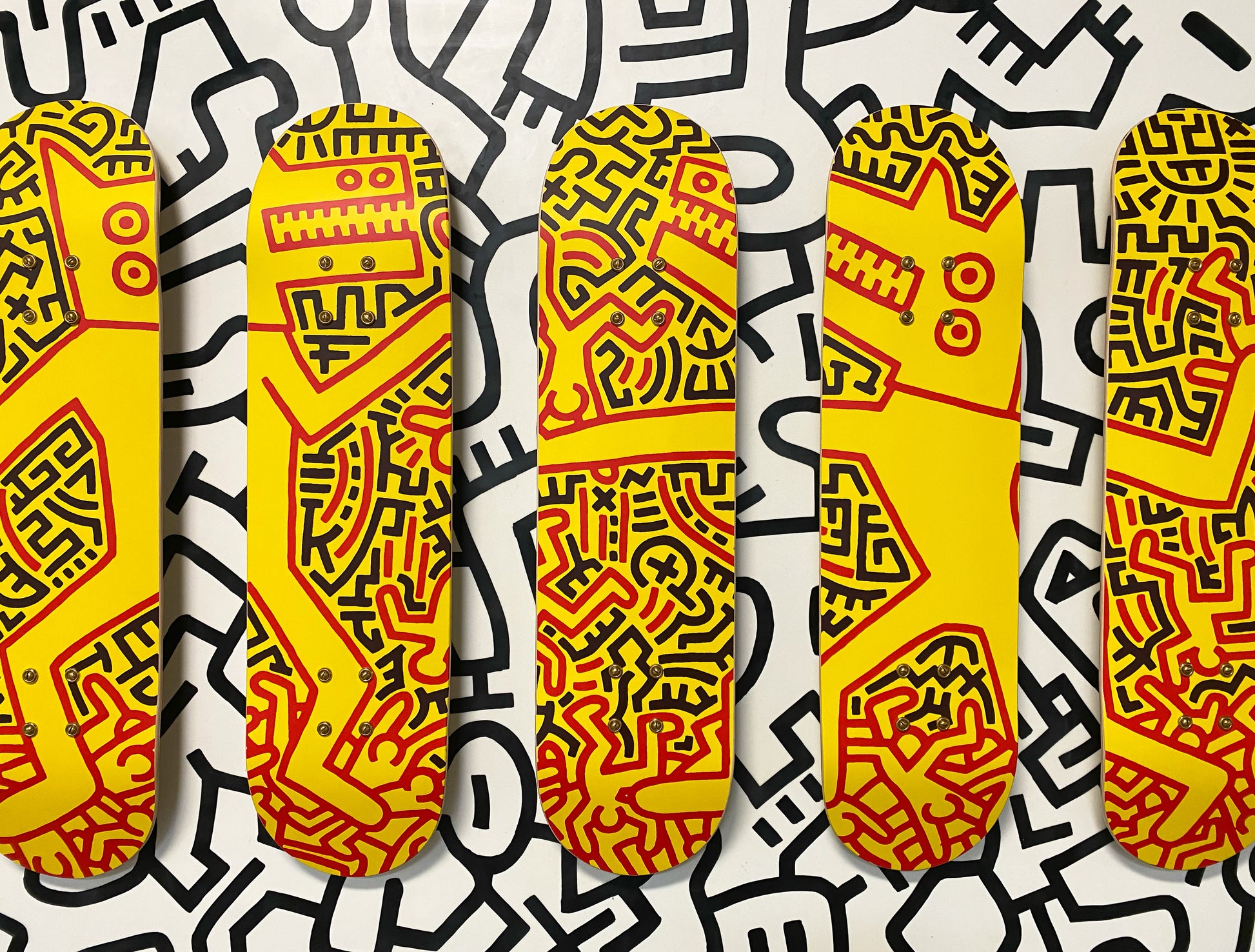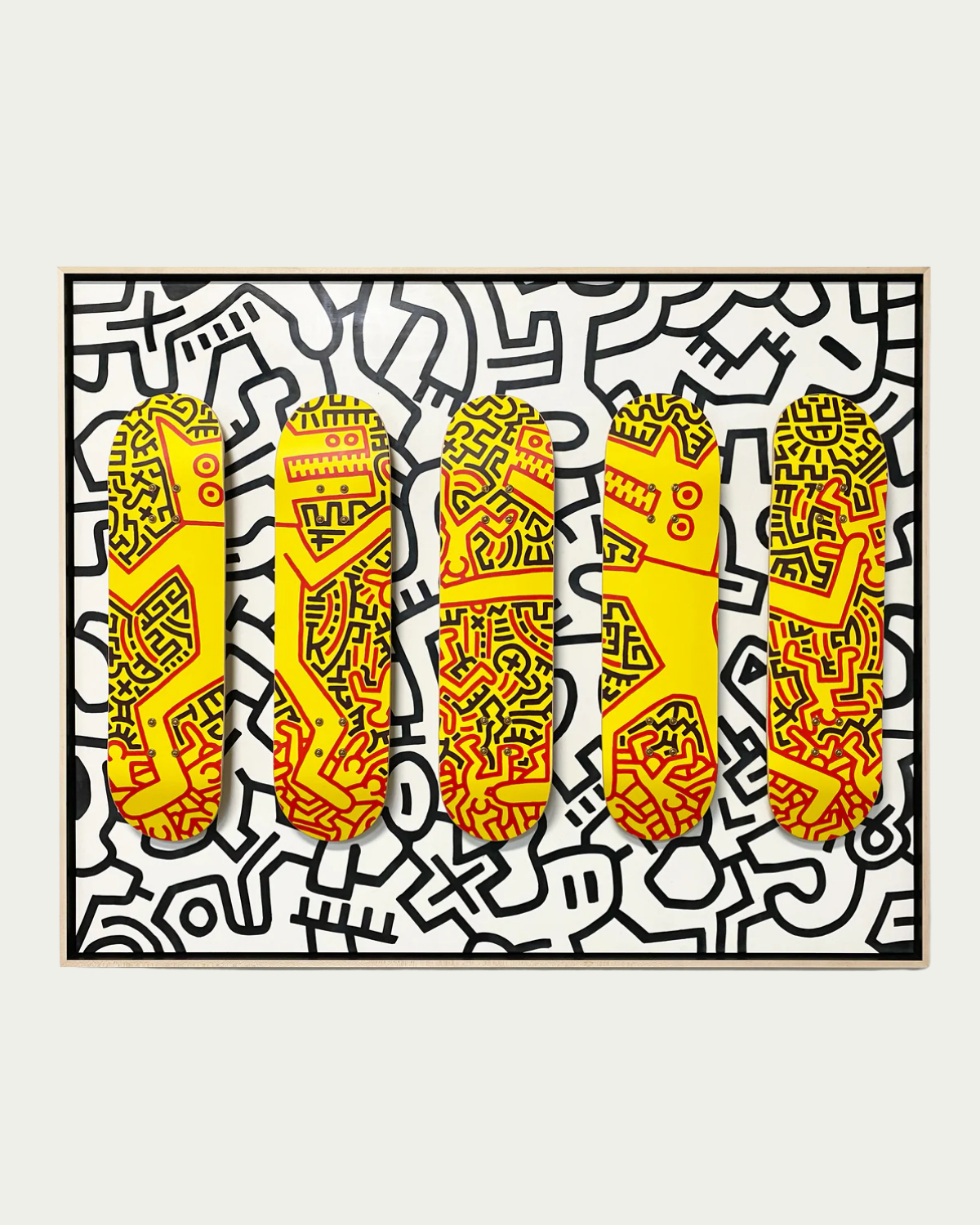 The Deck series. Screen-printed maple skate decks. Float-mounted on encaustic painted boards. This open edition set of 5 skate decks features Keith Haring's Monsters and was designed in 2019 by The Skateroom with the Keith Haring Foundation.