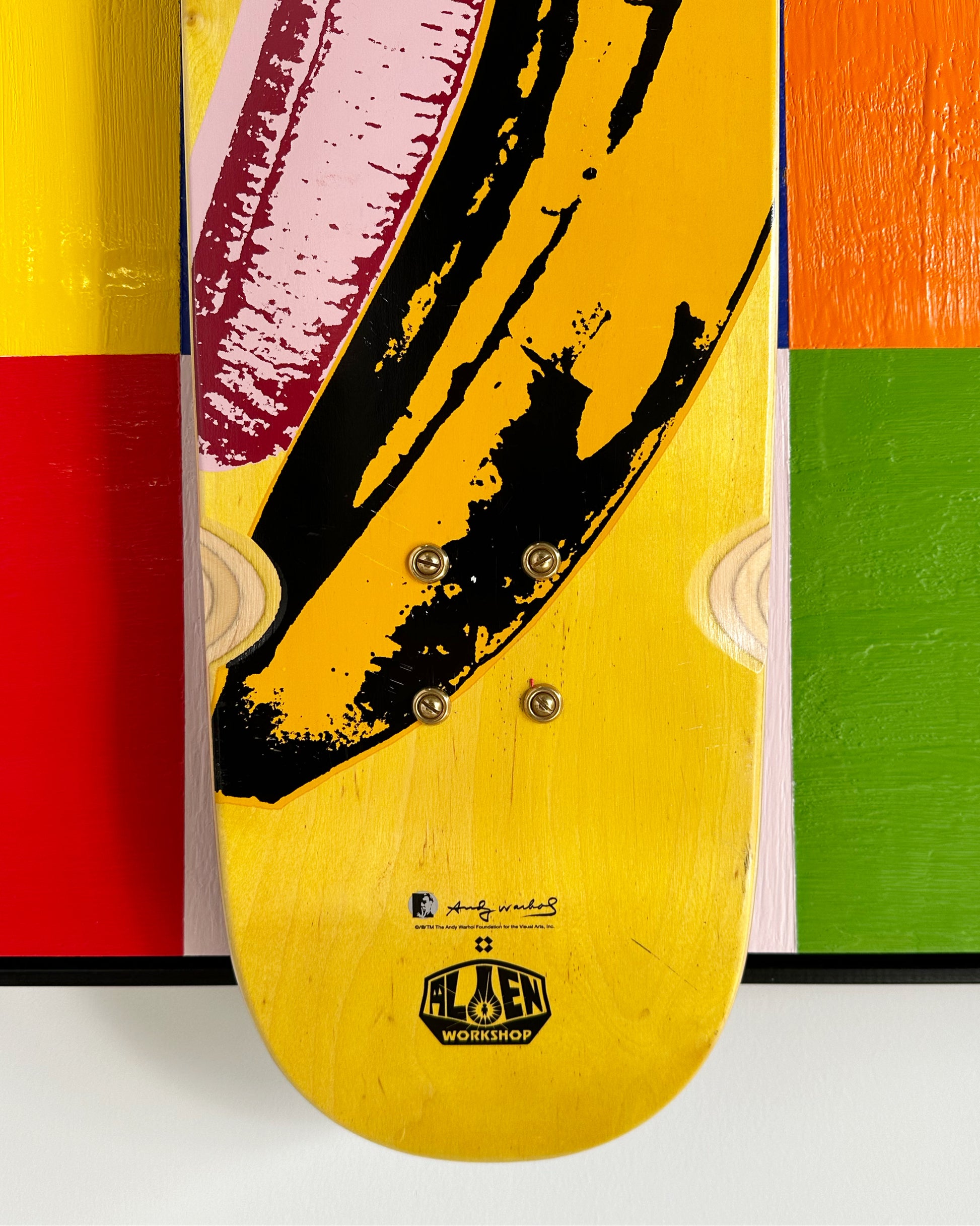 About the Deck | Rare, Out of Print Andy Warhol Banana Skate Deck. This work originated circa 2012 as a result of the collaboration between Alien Workshop and the Andy Warhol Foundation. Trademark by the estate found on front lower section of deck. Silkscreen on maple wood skate deck. Dimensions: 8.5 x 36.5 inches.