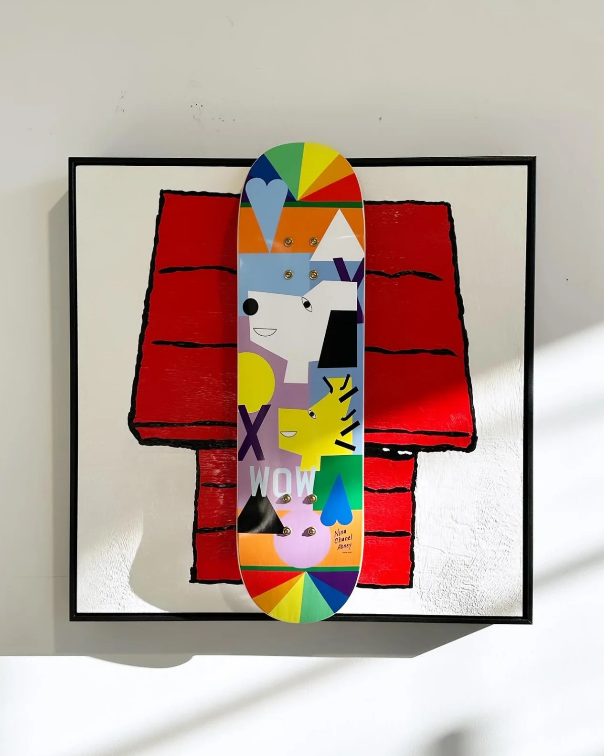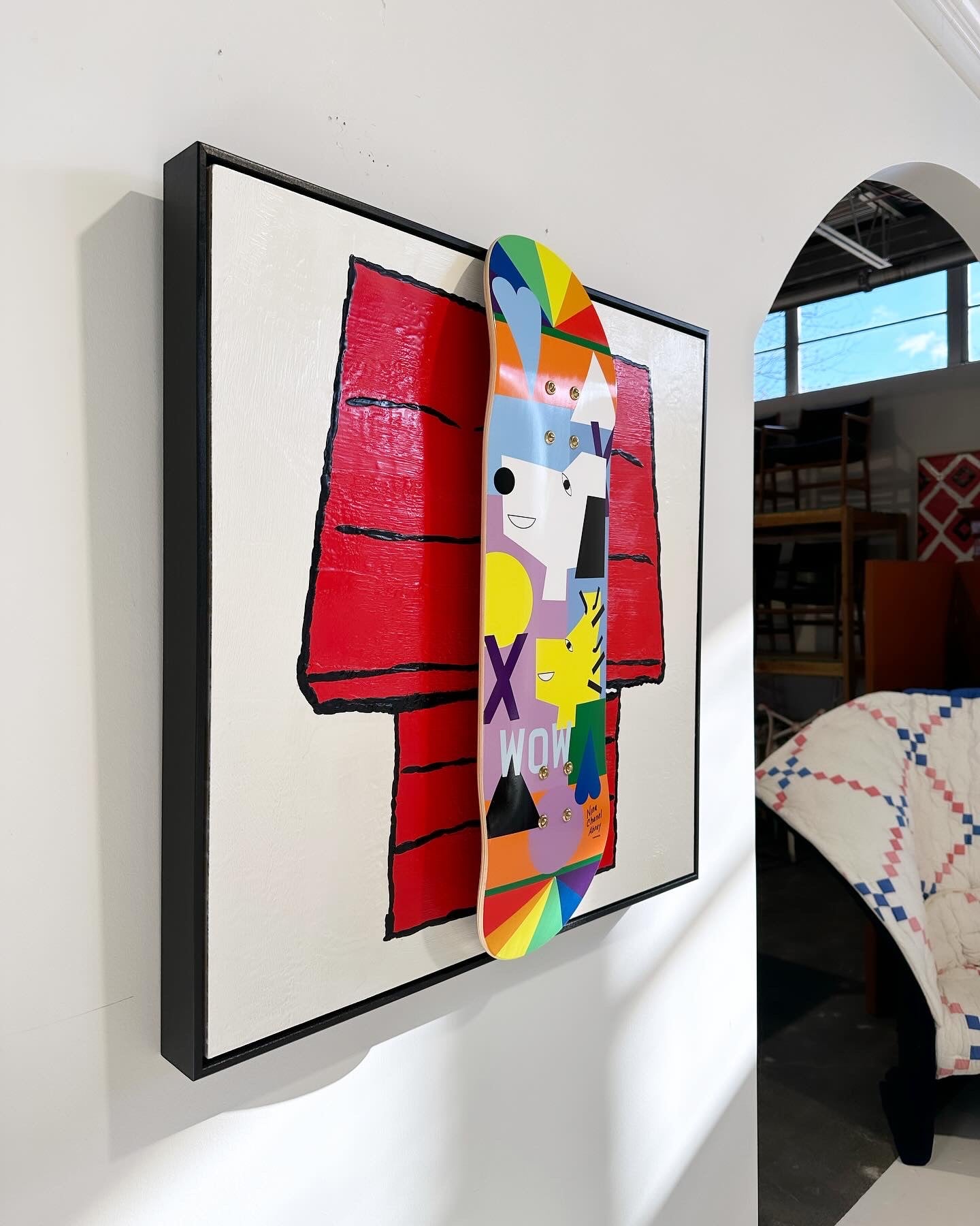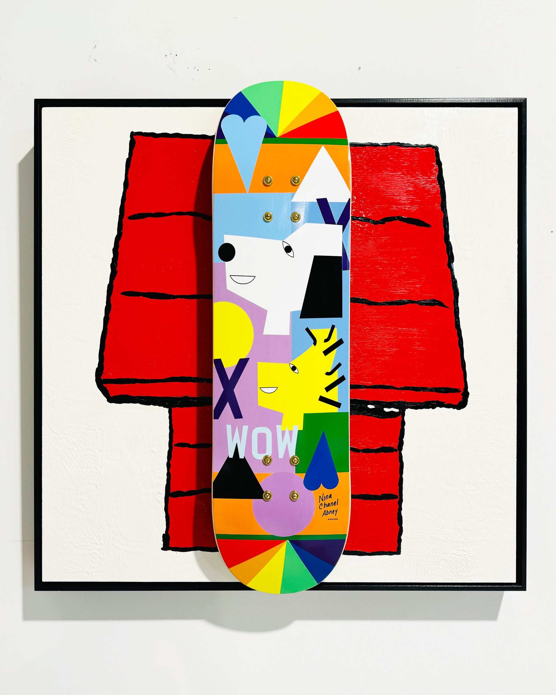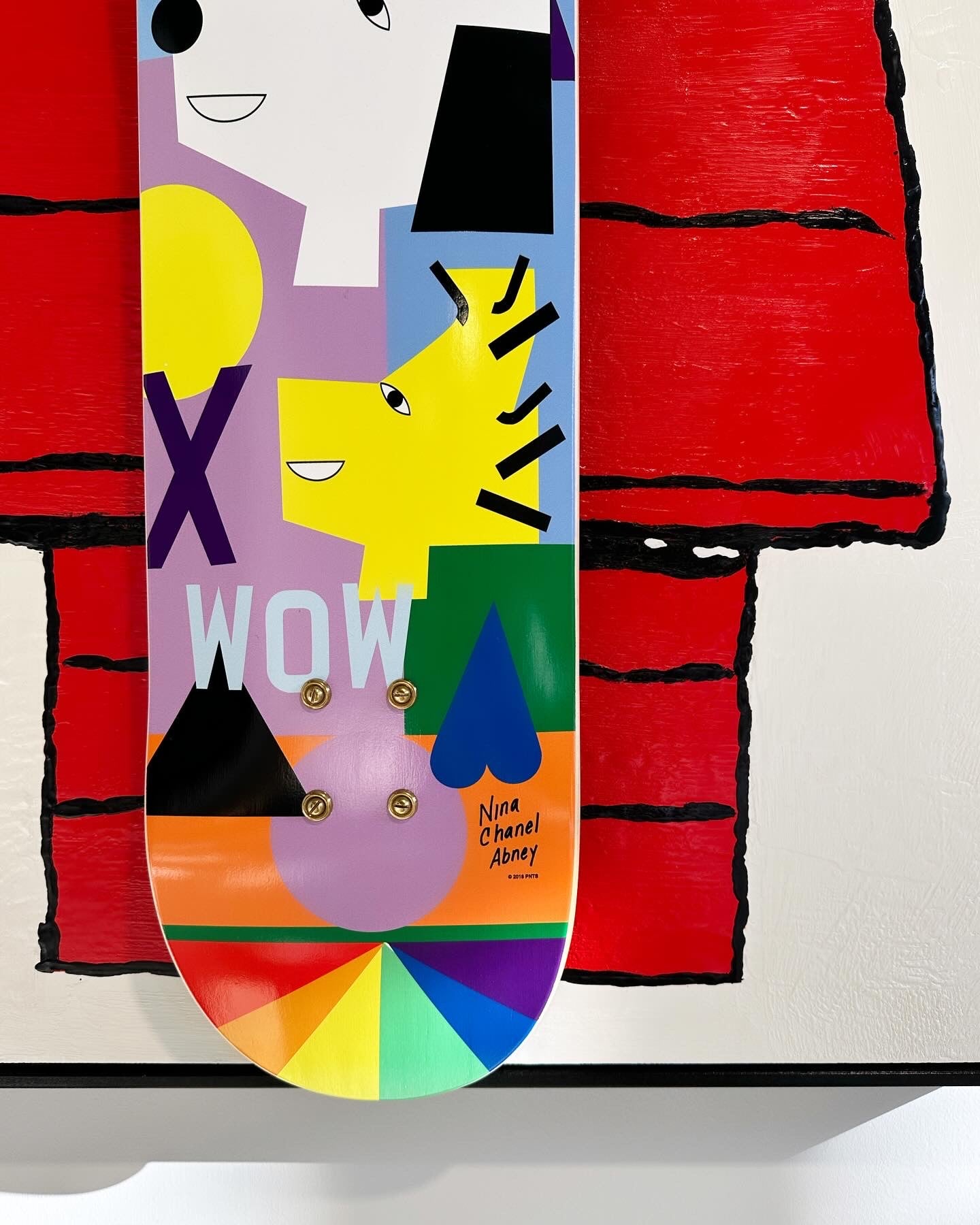 In Deck series. Encaustic and Nina Chanel Abney Peanuts Skate Deck float-mounted on board.