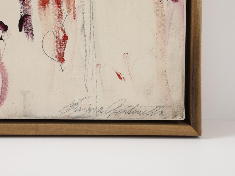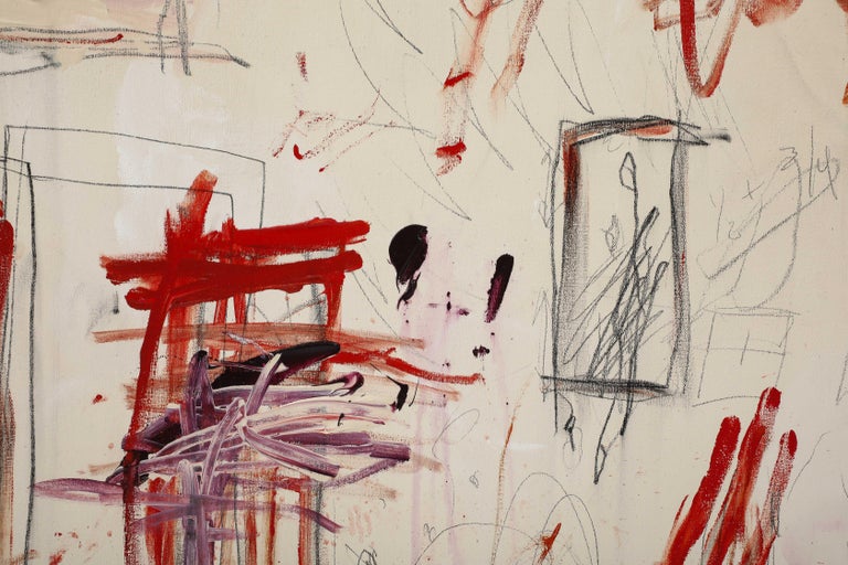 This work is full of energy, color, and childlike innocence. It is bold and spirited and celebrates the beauty of human nature. Each stroke is a spontaneous mark on canvas that come together as a balanced composition. A vibrant movement in acrylics, house paint, and pencils in hues of burnt orange, vermillion, golden raw sienna, white, purple, and aubergine and deep reds or plums with carbon pencils against a neutral background. Framed in natural pine wood floater frame.
