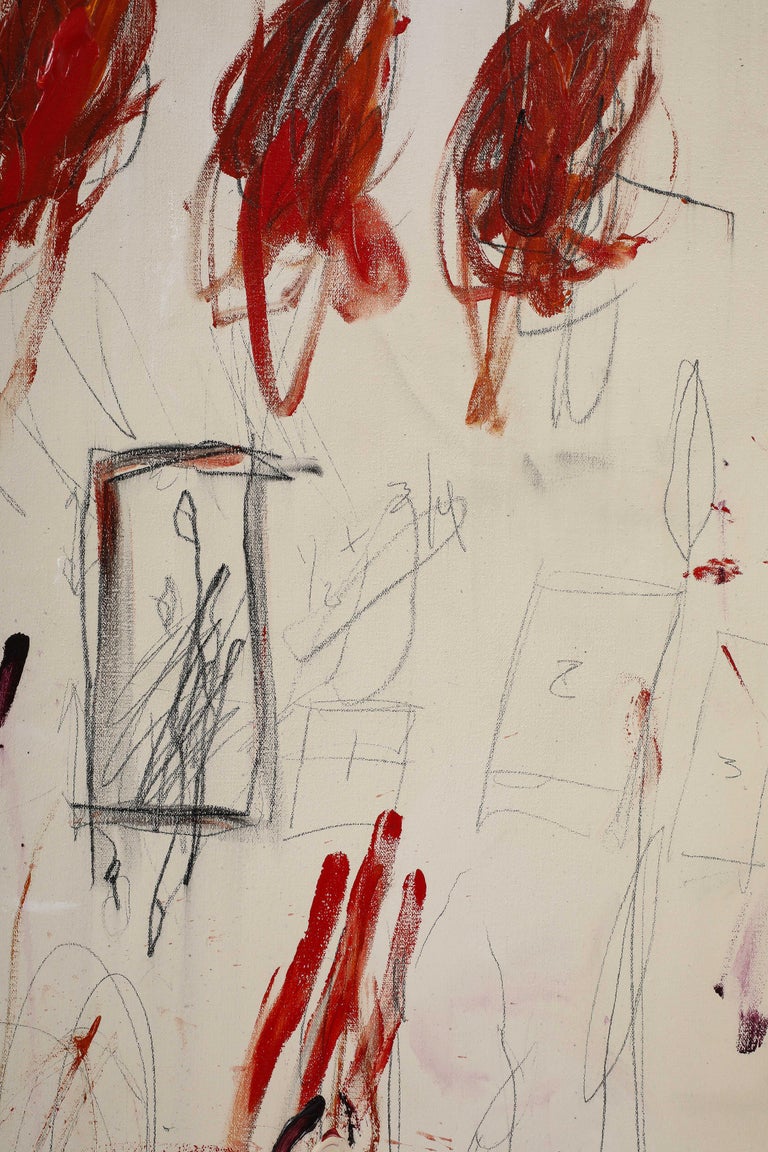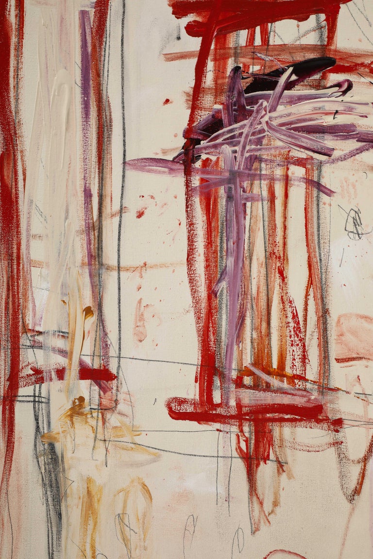 Vertical abstract painting consisting of acrylics, house paint, oil pastels, color pencils, and carbon pencils on canvas.