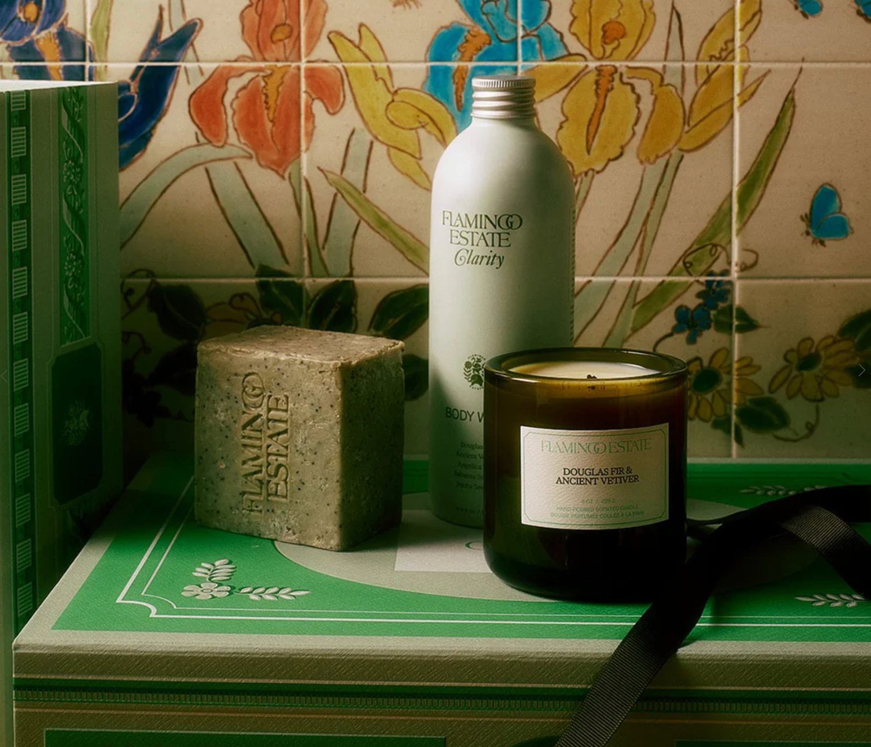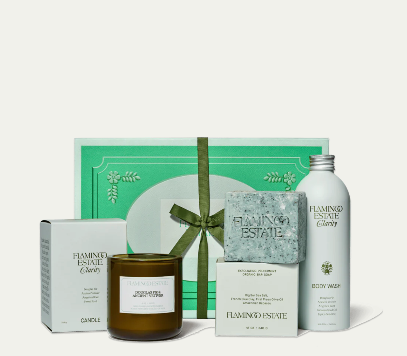 Right now — more than ever — we need to find peace. To have tools to quieten our nervous, anxious, wandering minds. This set was based on the idea of forest bathing. Products that freshen the mind and silence the outside noise. Each is made with precious ingredients from remarkable growers to feel like a deep breath and an exhale for the skin. So here they are, three tools for daily Clarity: A Candle, Body Wash, and oversized Bar Soap. This Gift Set comes in an embossed Gift Box, finished with a grosgrain Bow.
