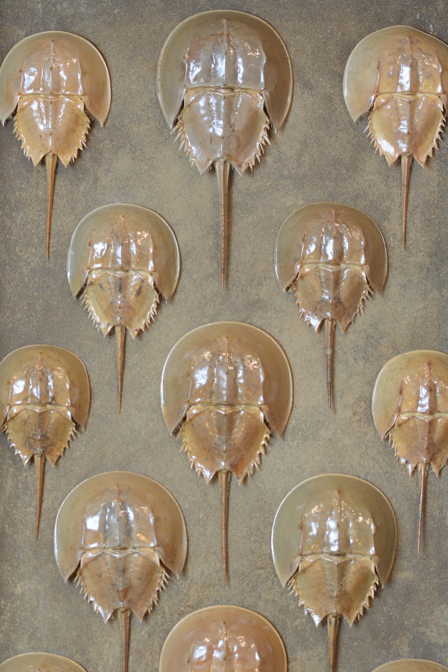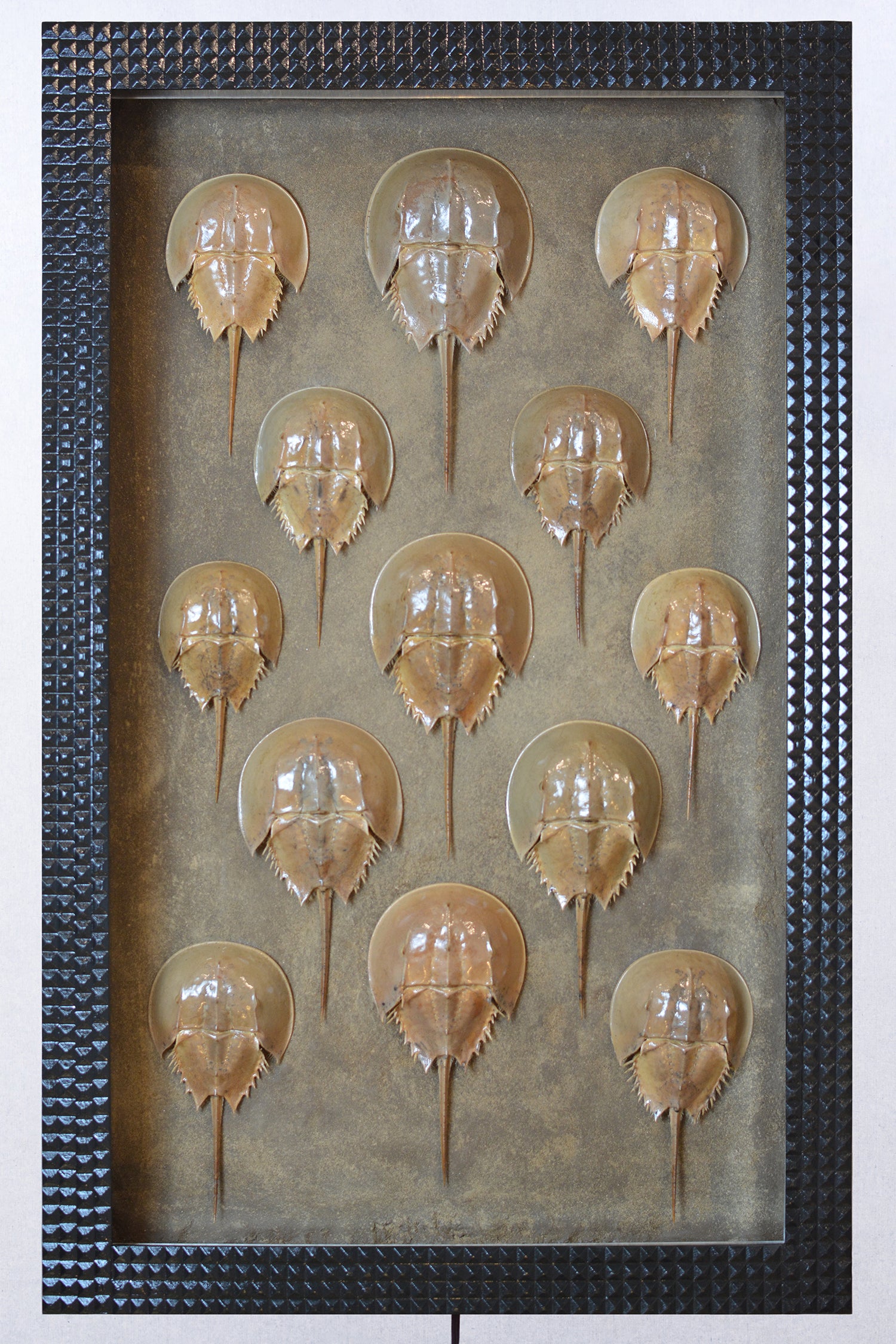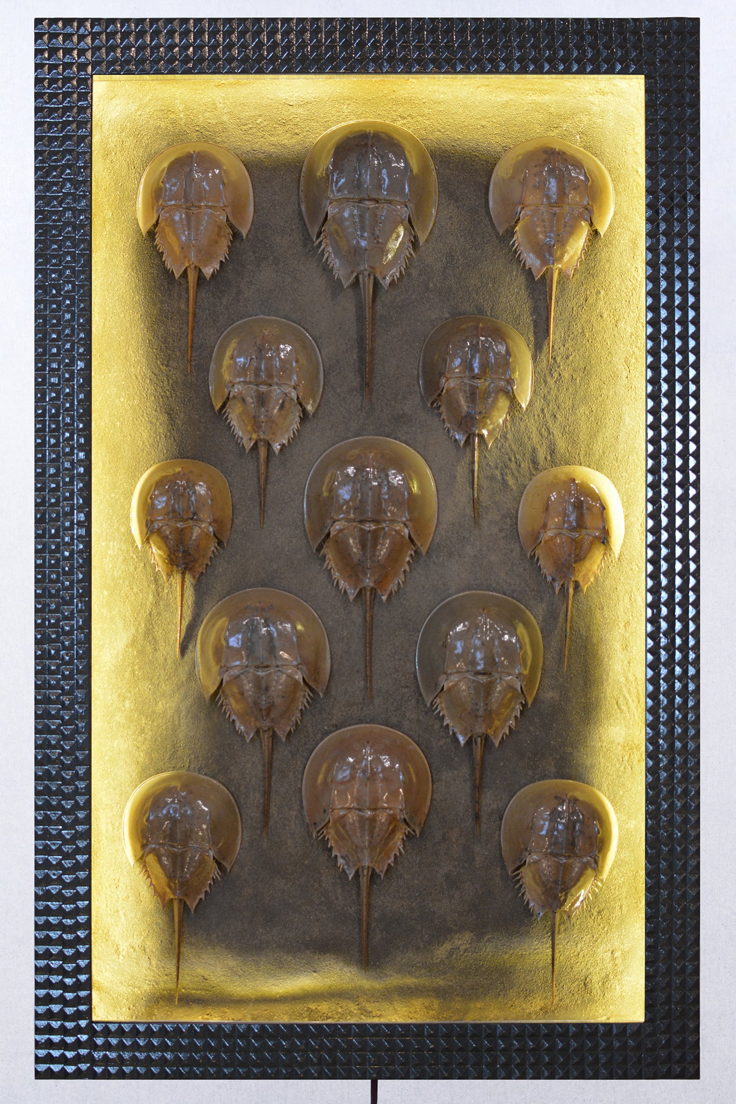 A techno-futuristic riff on the traditional Victorian shadowbox containing horseshoe crab carapaces collected by hand on a family visit to Cape Cod.