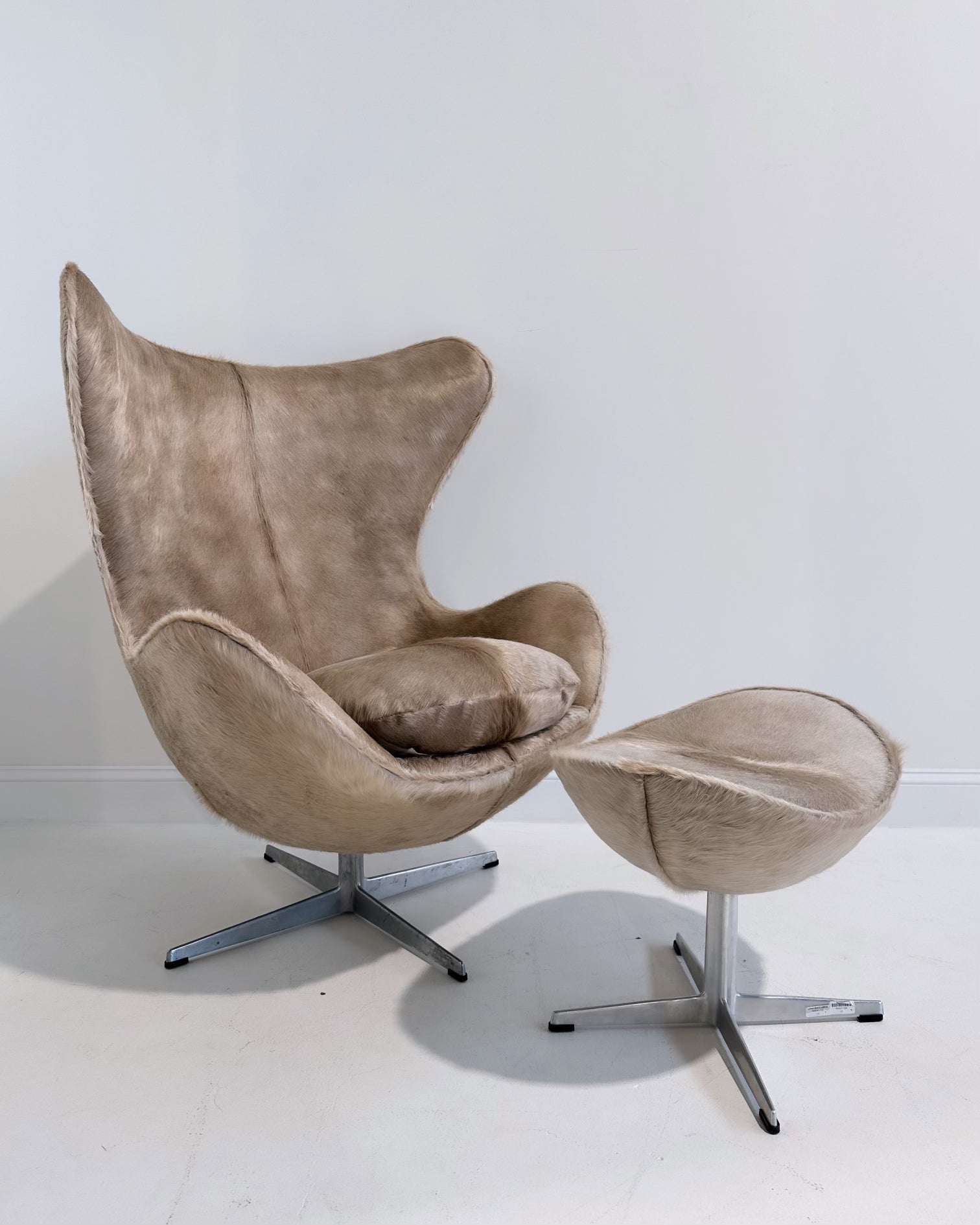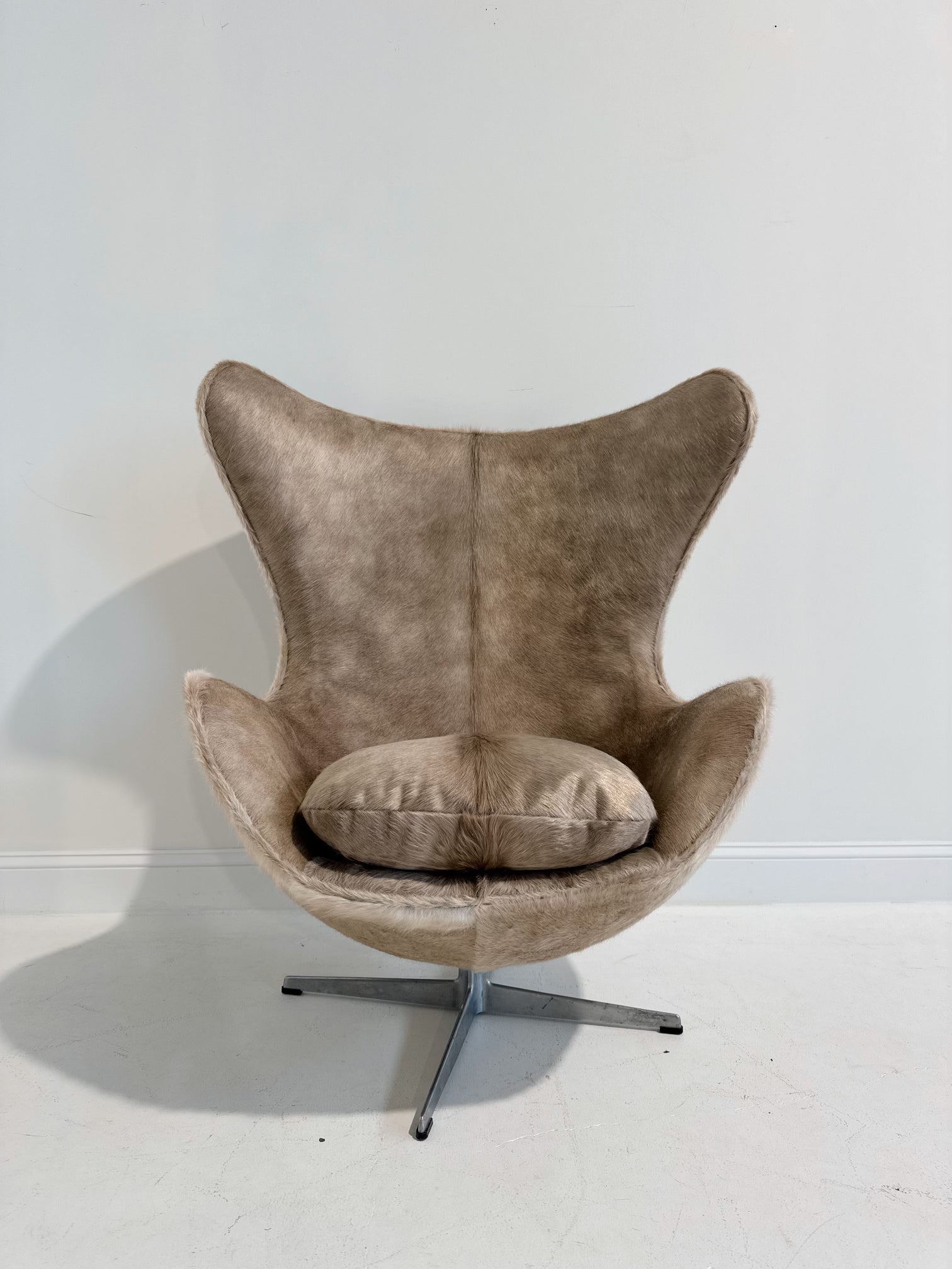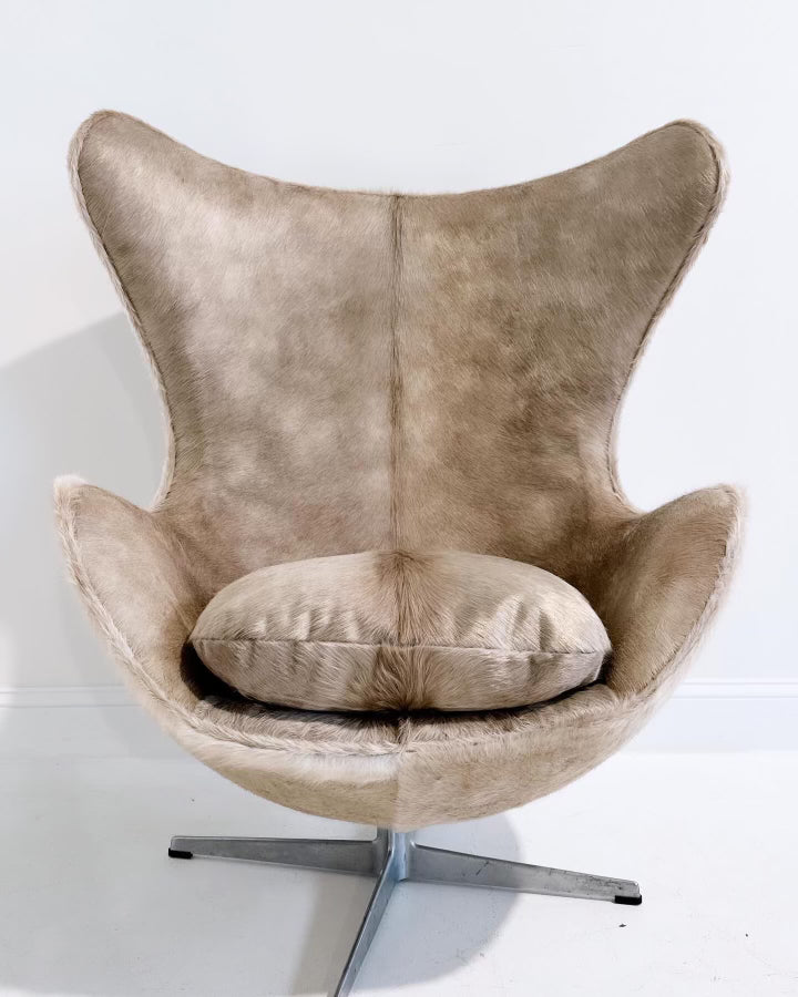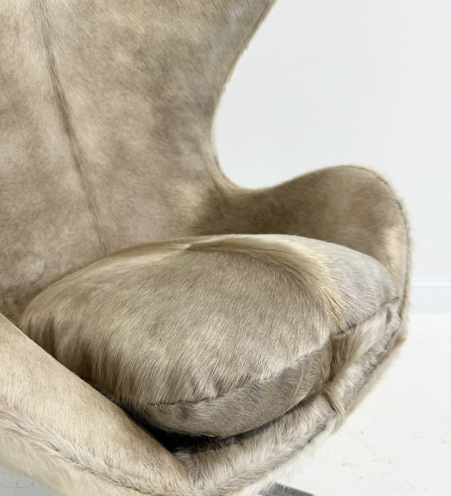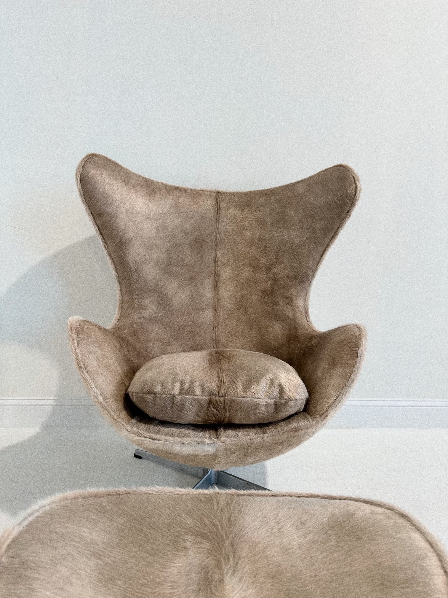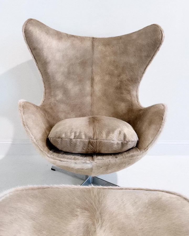 This Egg Chair and Ottoman has been expertly upholstered in Brazilian in cowhides. The natural color is called Champagne, a beautiful tan with a hint of grey.