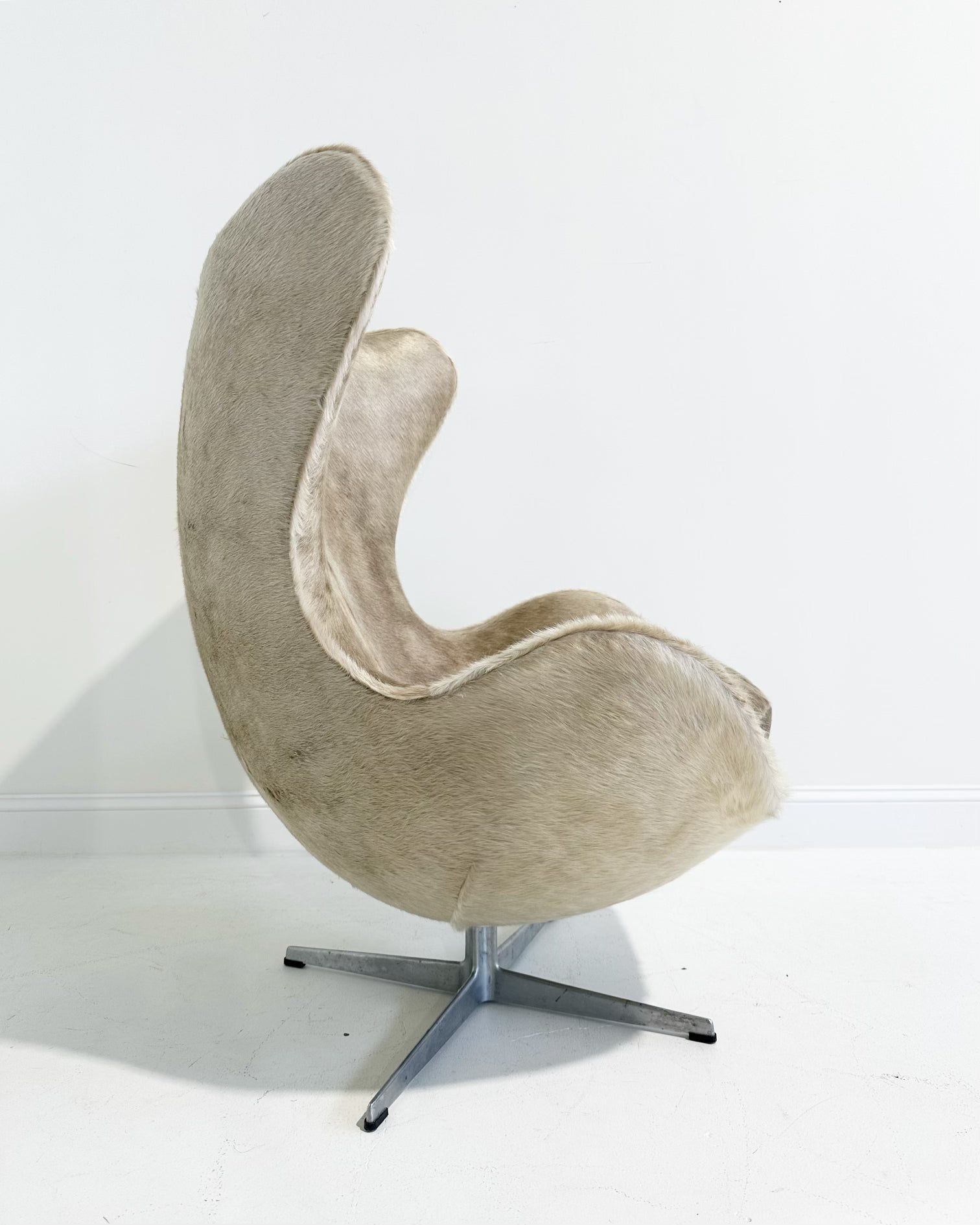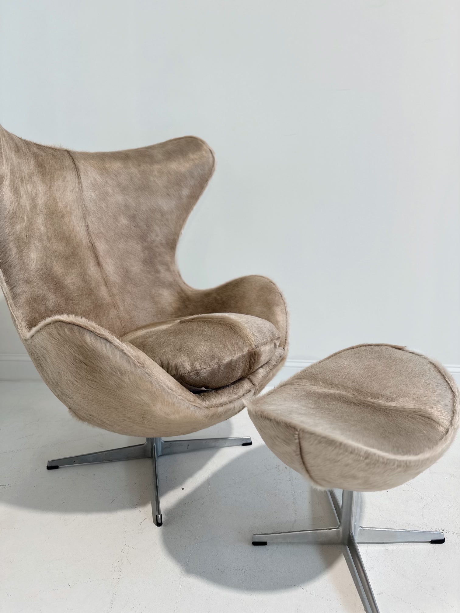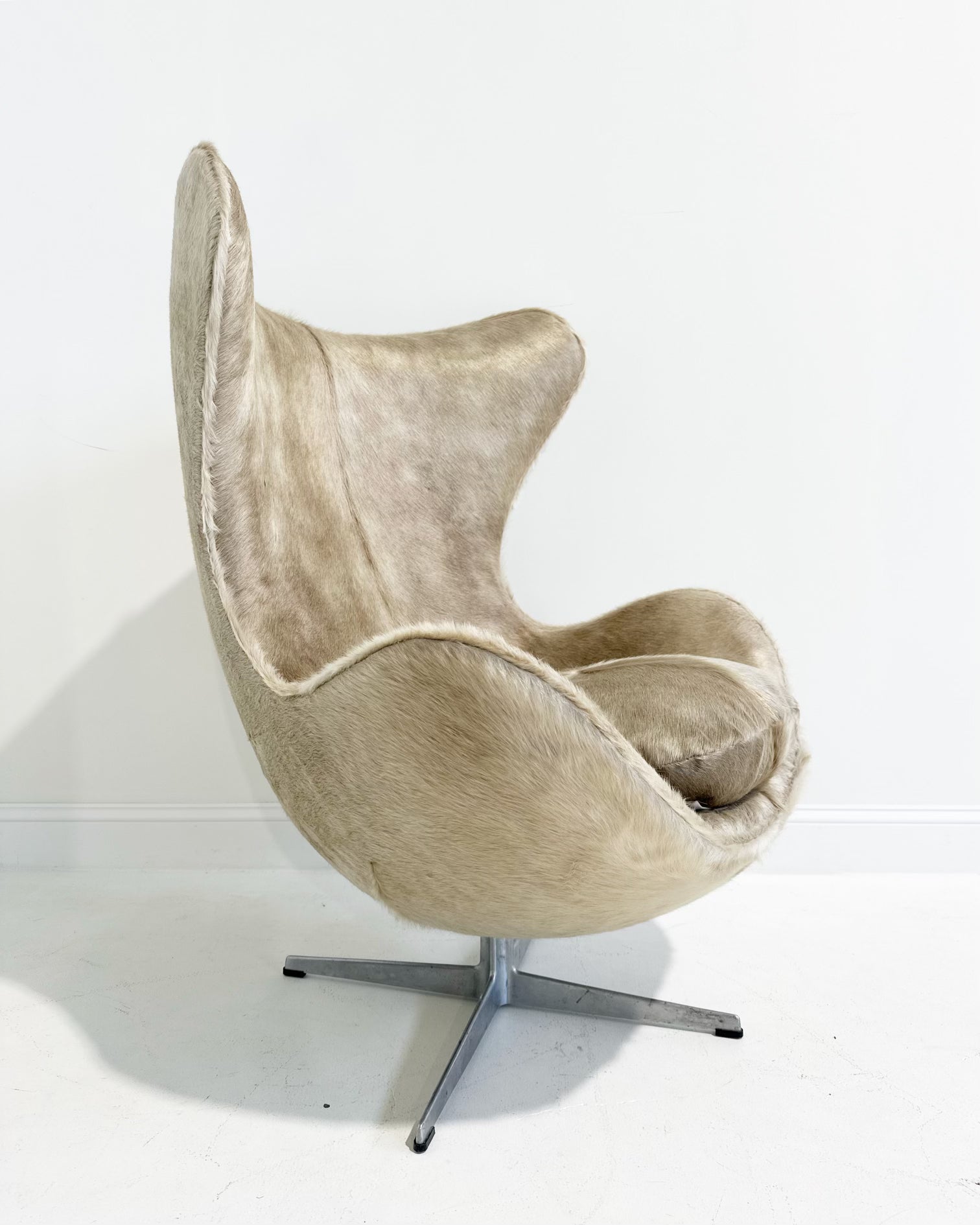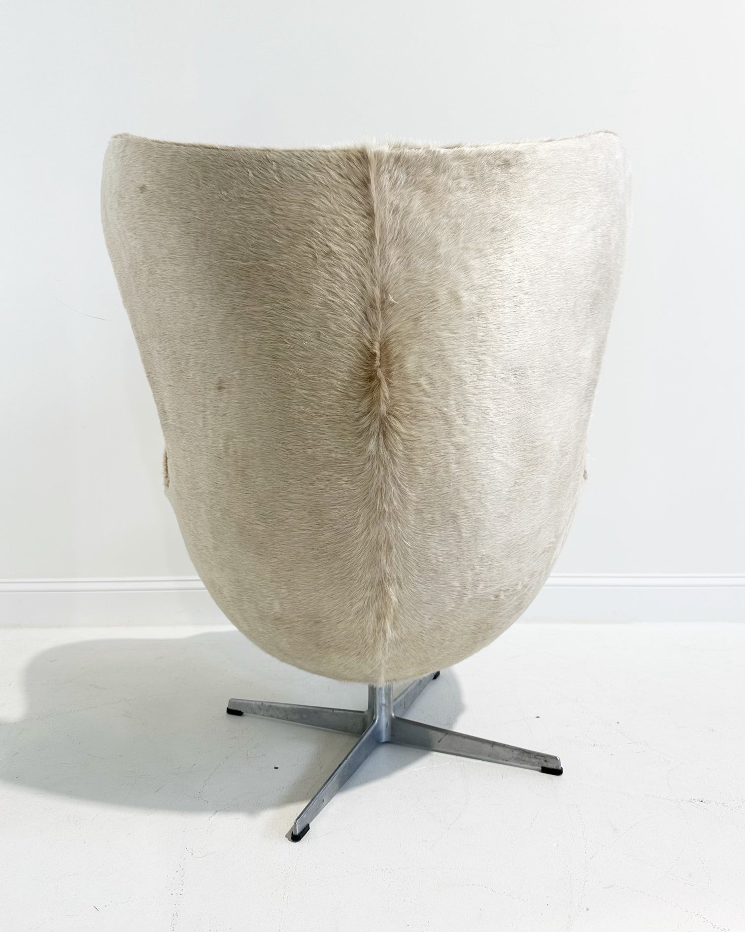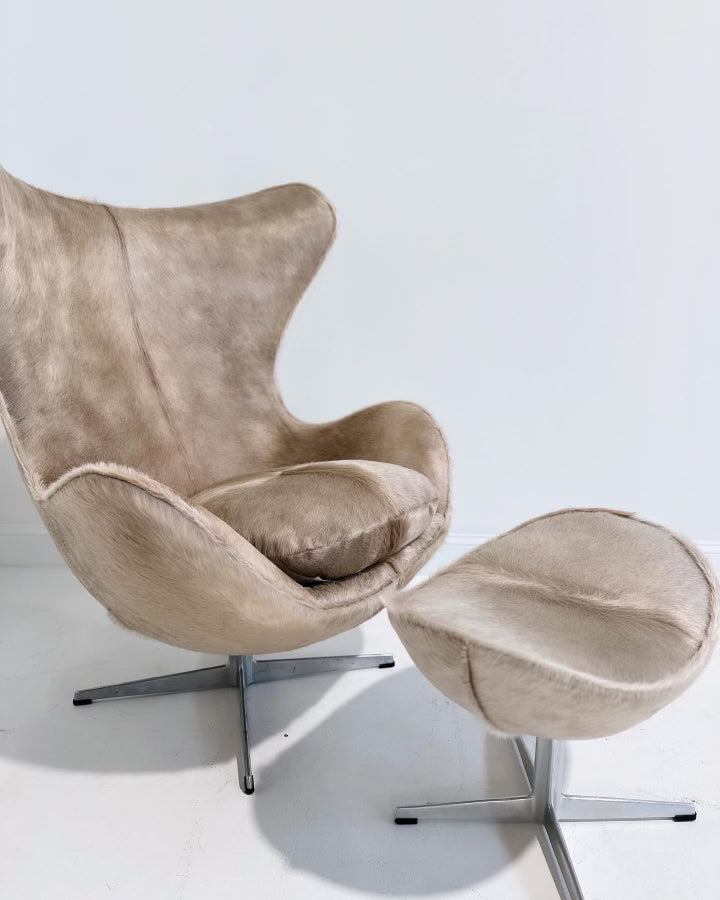 This Egg Chair and Ottoman has been expertly upholstered in Brazilian in cowhides. The natural color is called Champagne, a beautiful tan with a hint of grey.
