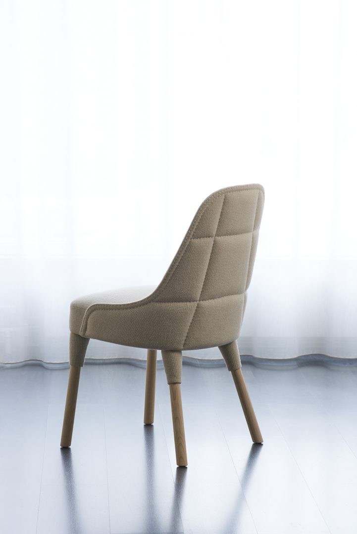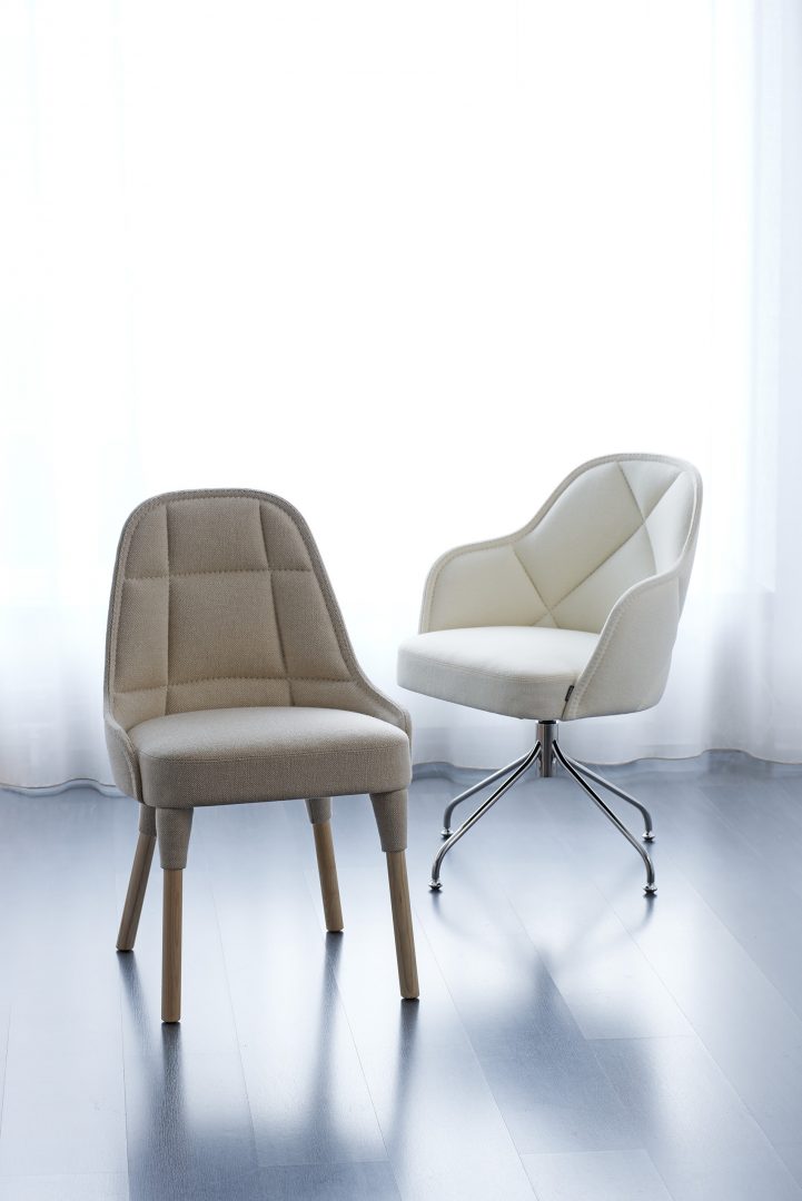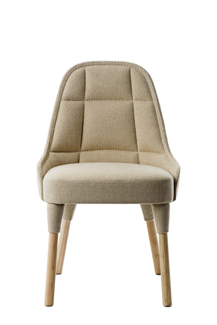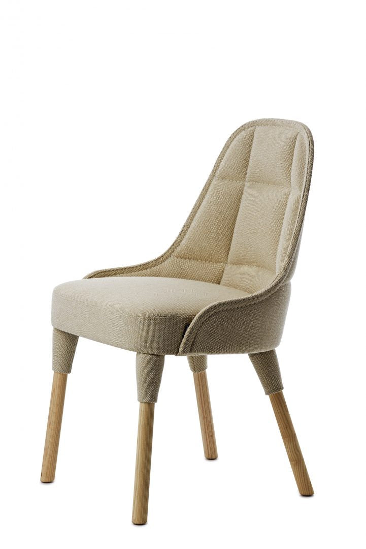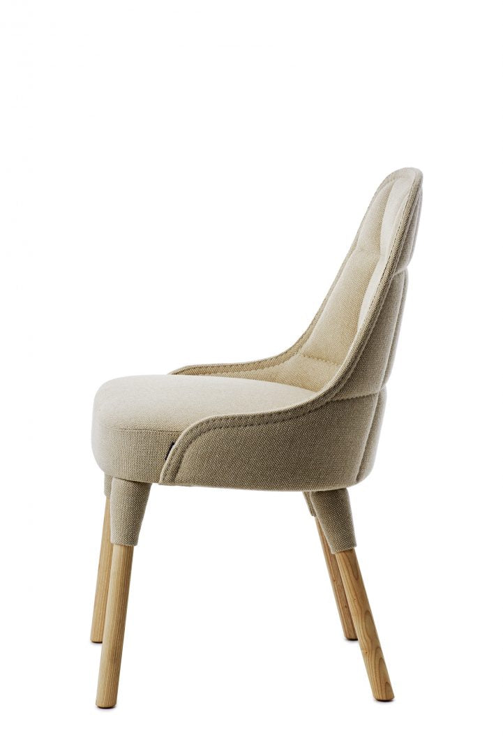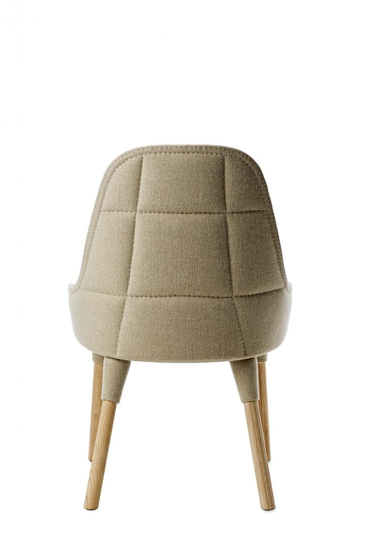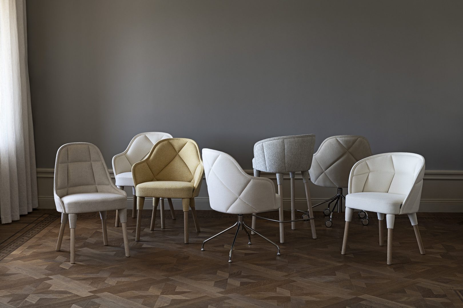 Armchair with upholstered back and seat in fabric or leather. Back frame in partly recycled felt. With decorative stitched pattern on backrest, choice of color. When choosing fabrics, we recommend stretch and wool fibers. Wood frame with 4 legs in ash or oak, plastic glides. Foot ring in blasted steel.