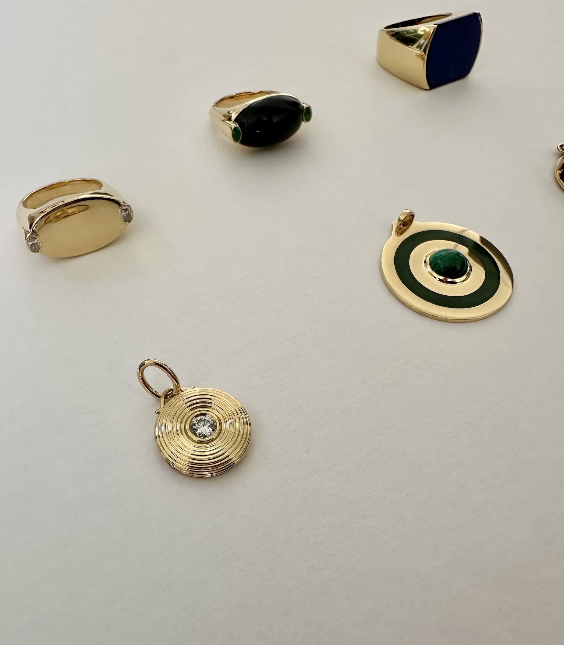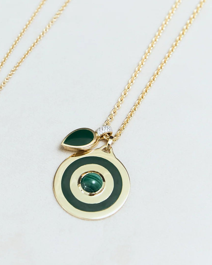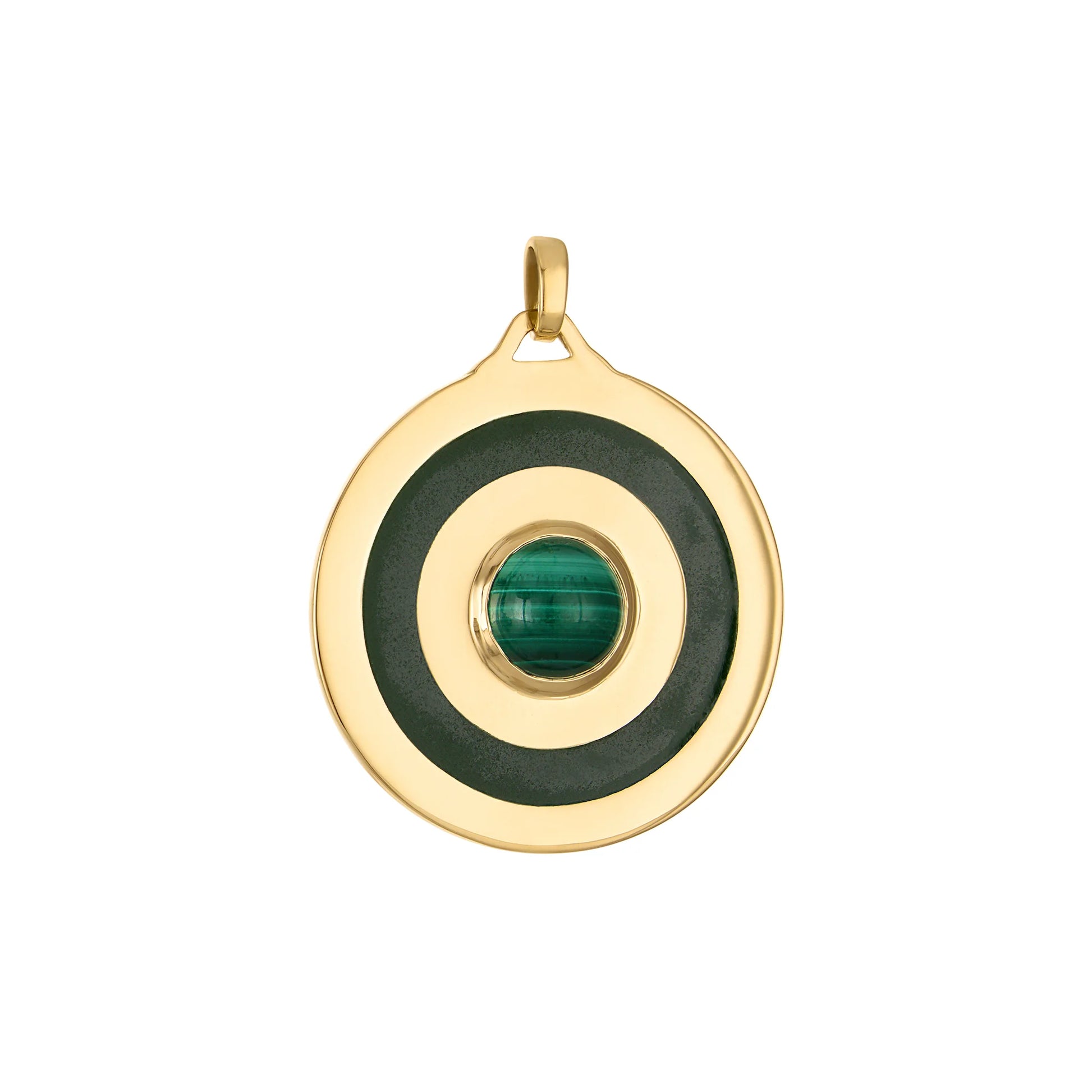 The Enamel Bullseye Pendant is 28mm in diameter (approx 1 ¼”) with 8mm cabochon center stone. Shown here Malachite with green enamel. Also available in any custom enamel and stone combination (prices for custom pieces vary according to stone choice). Made-to-order. Please allow 3 to 5 weeks for delivery.