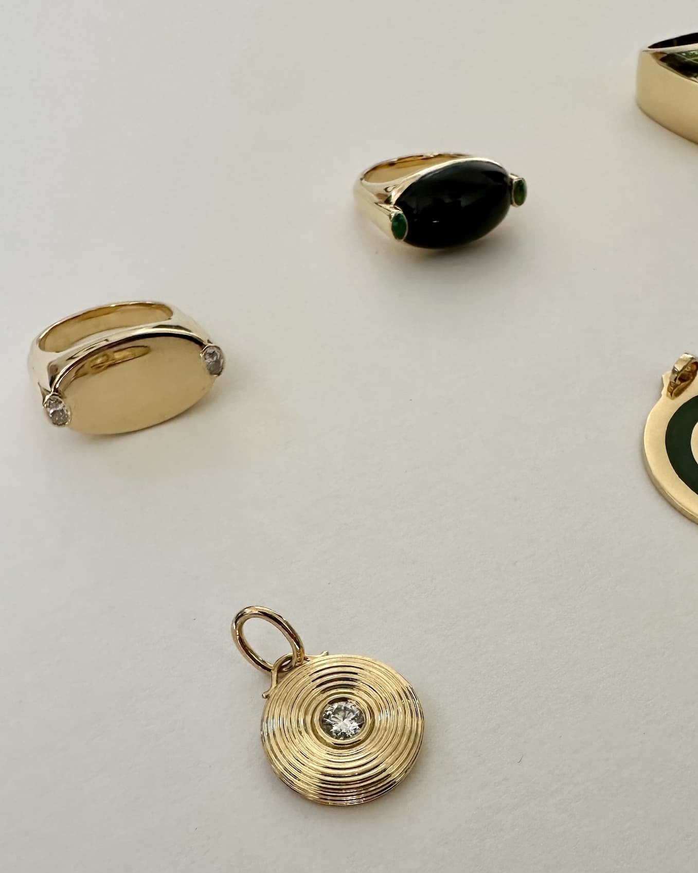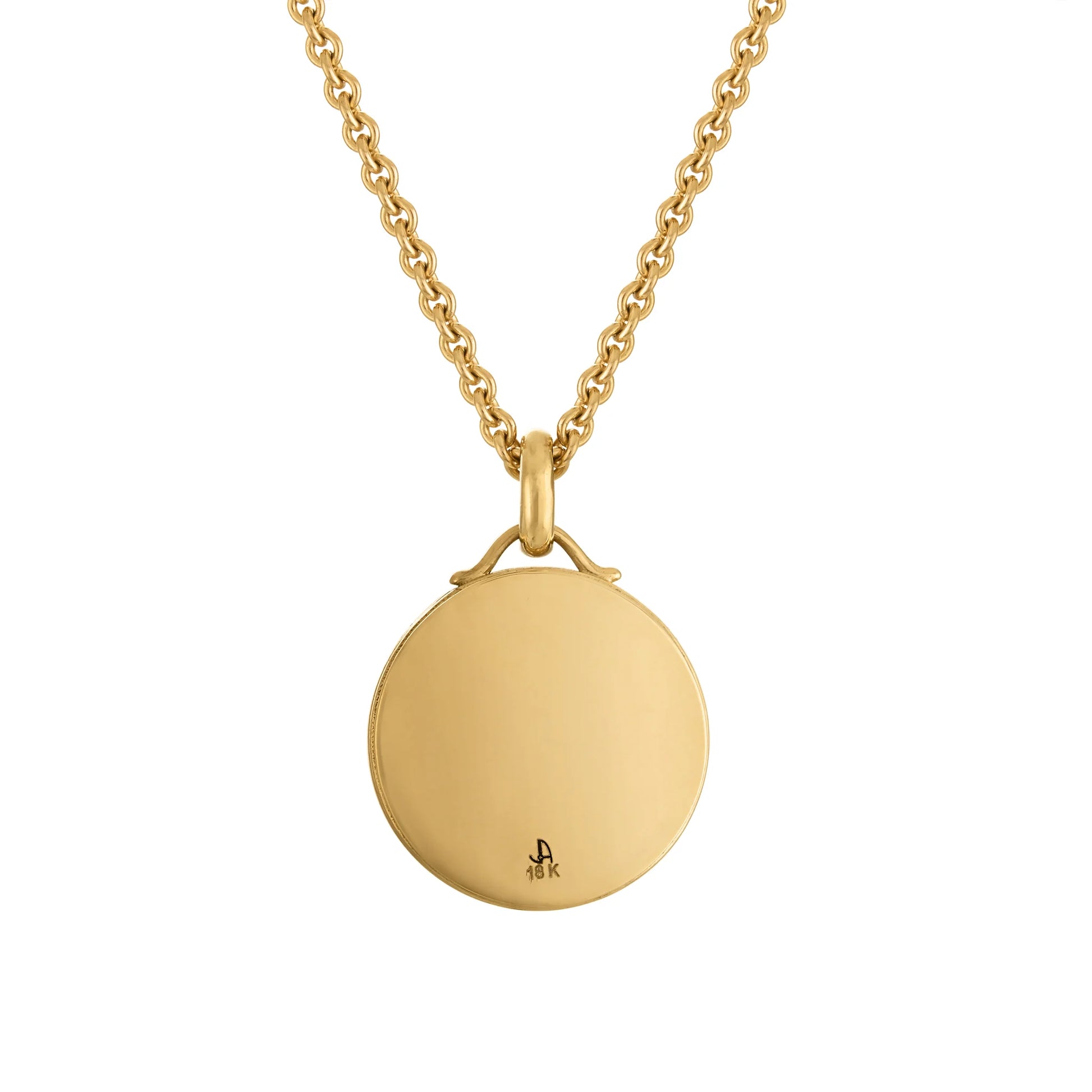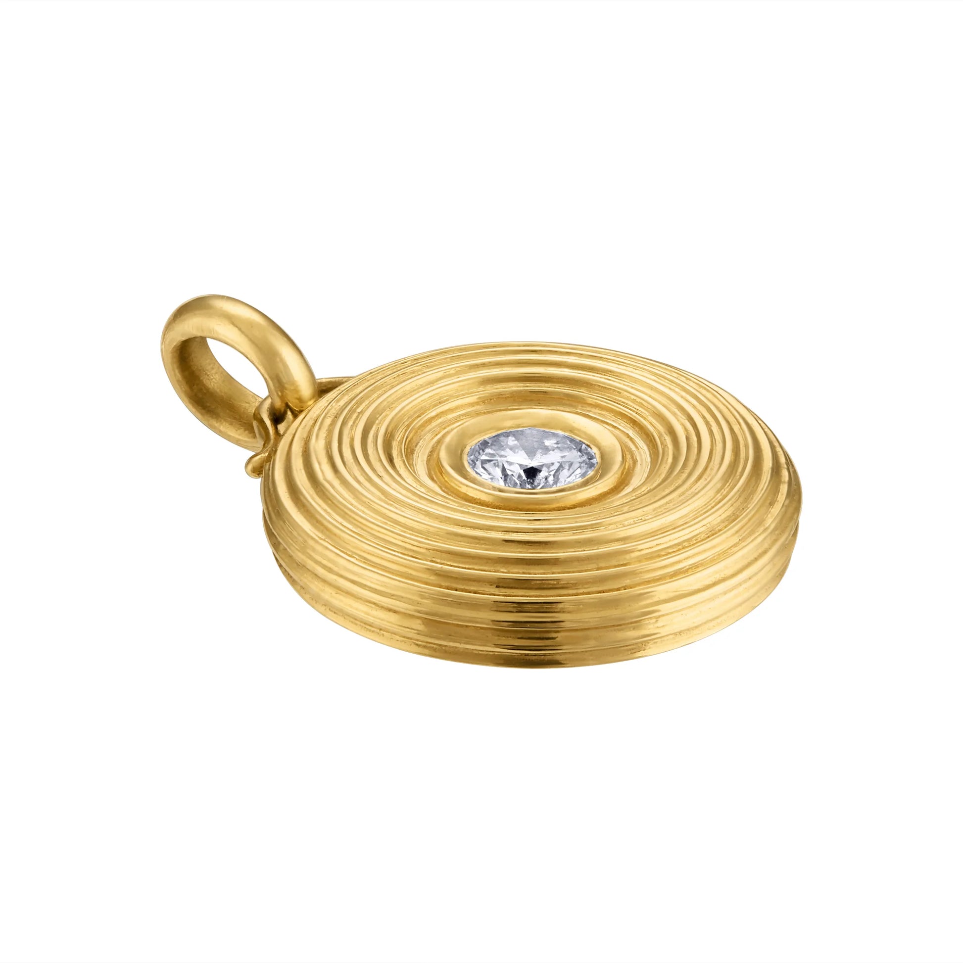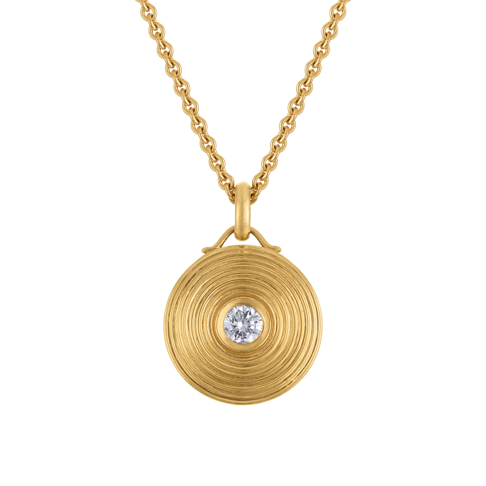 This 18k gold pendant measures 16mm in diameter (approx 6/8th inch) and 4mm in depth with a 4mm diamond (approx. .25 ct) center stone. Engraving is available on the back. Chains are sold separately.