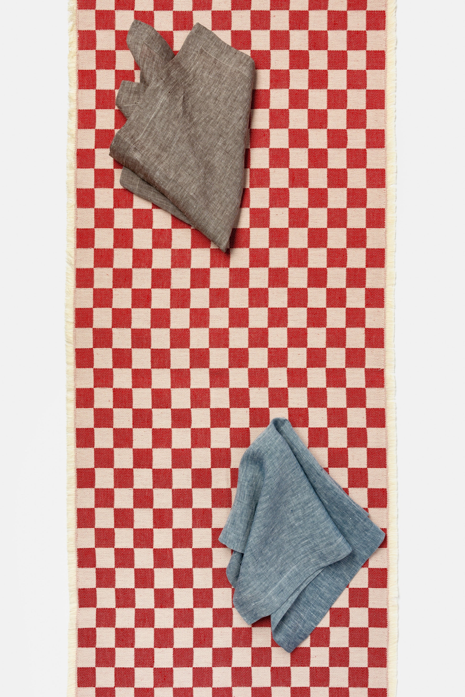 The F74 jacquard table runner in a checkered design; an icon in aesthetic history, a pattern that balances simplicity with a bold visual impact.