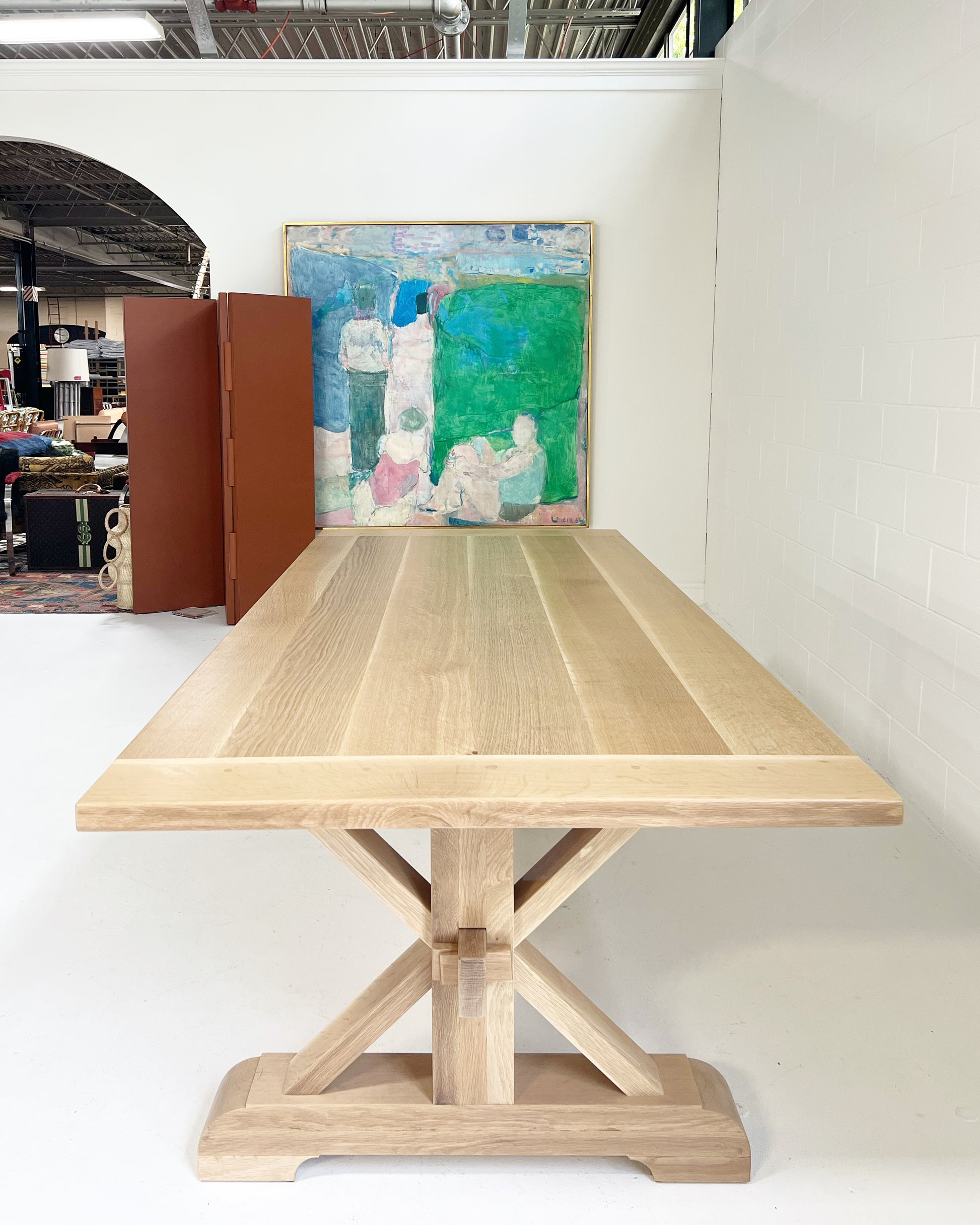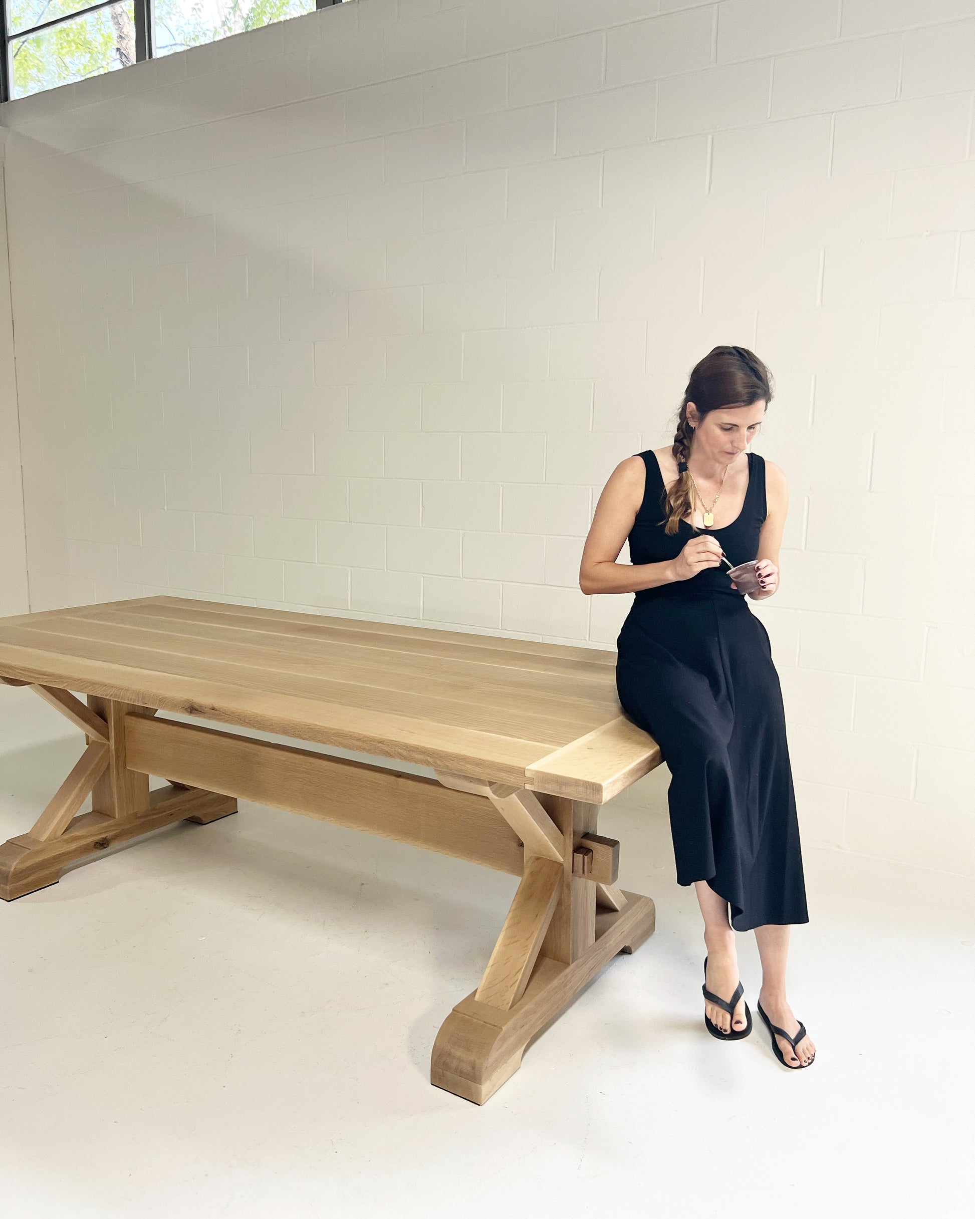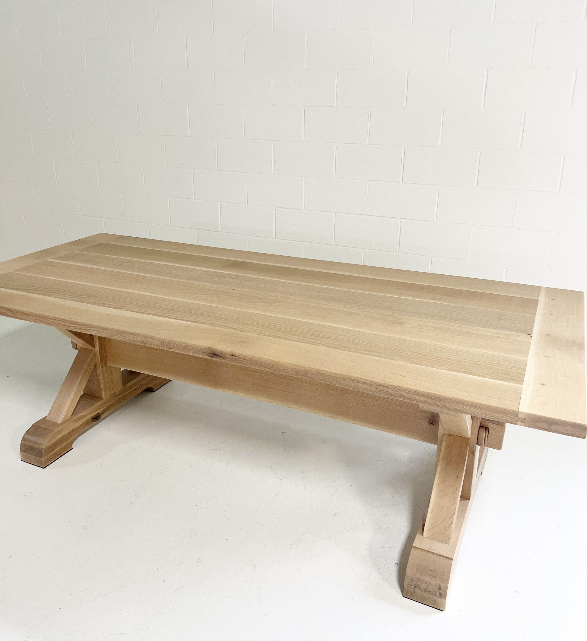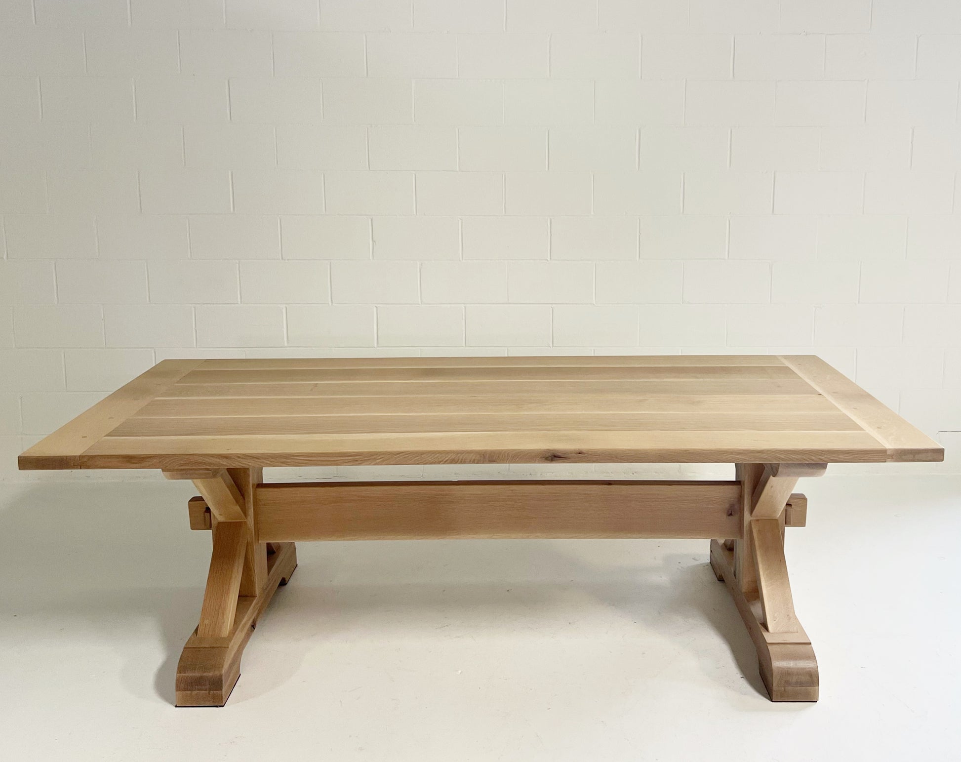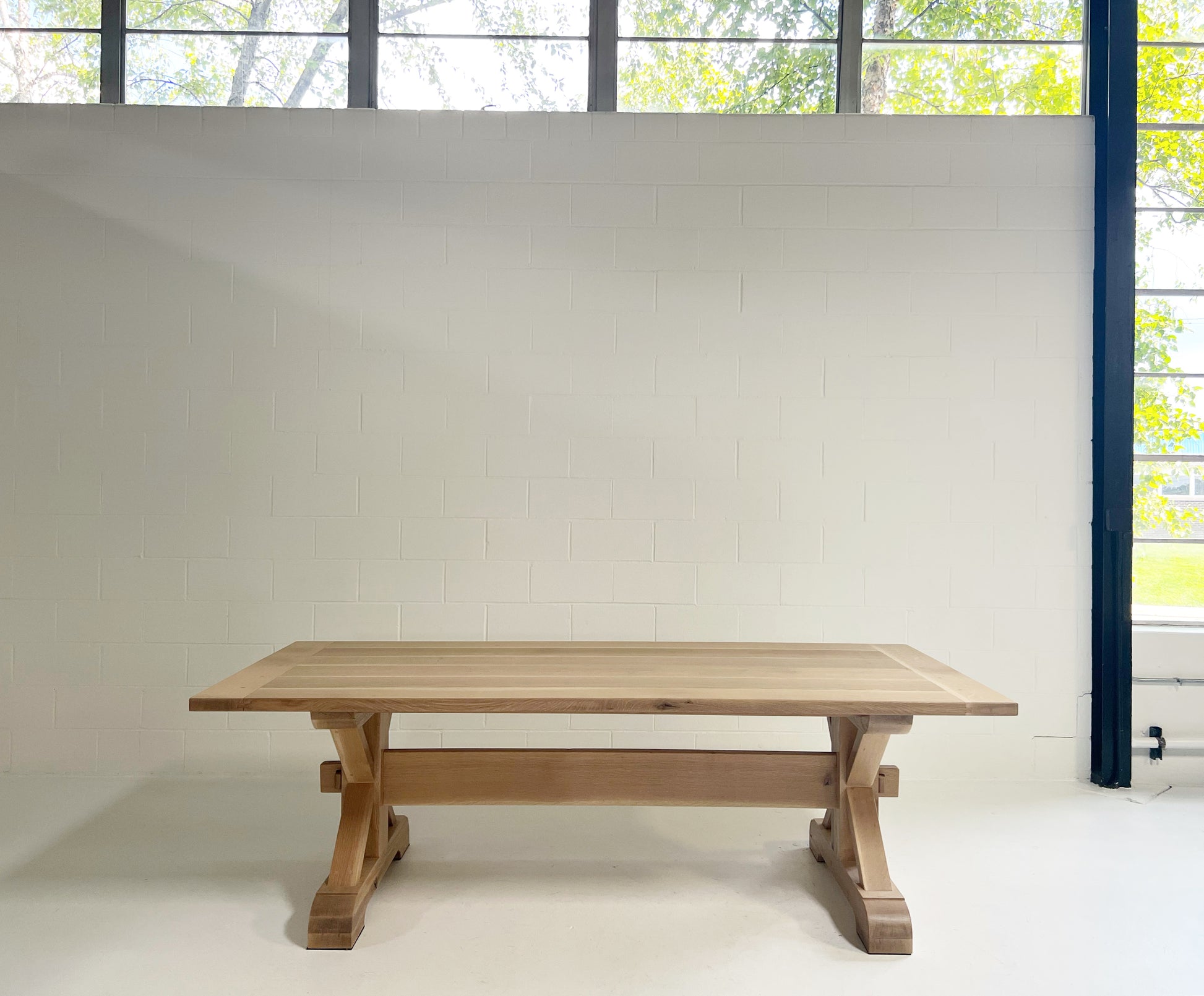 A classic trestle table designed and handcrafted by Forsyth master craftsmen. Our craftsmen use a beautiful, milled-down quarter sawn white oak for the 8 foot long Farmhouse Table. The table is made using traditional wood joinery, therefore no metal fasteners are used in construction. The stringer board is made with "through mortise and tenon" joinery with wedges to hold in place. From the classic bread board ends to the dovetailed support beams to the subtle grain of the white oak, the Farmhouse Table is made to last and made to be handed down to the next generation.
