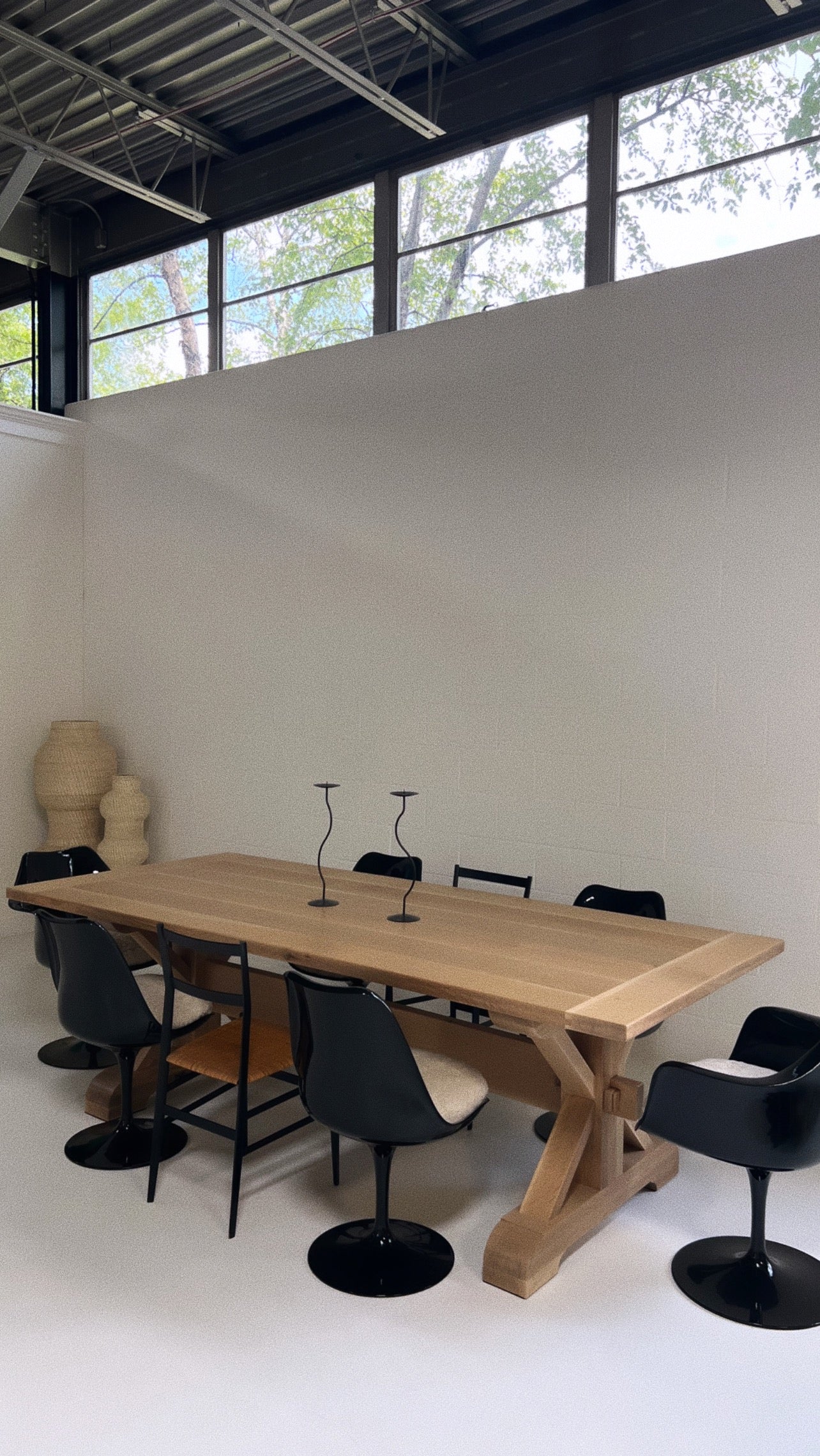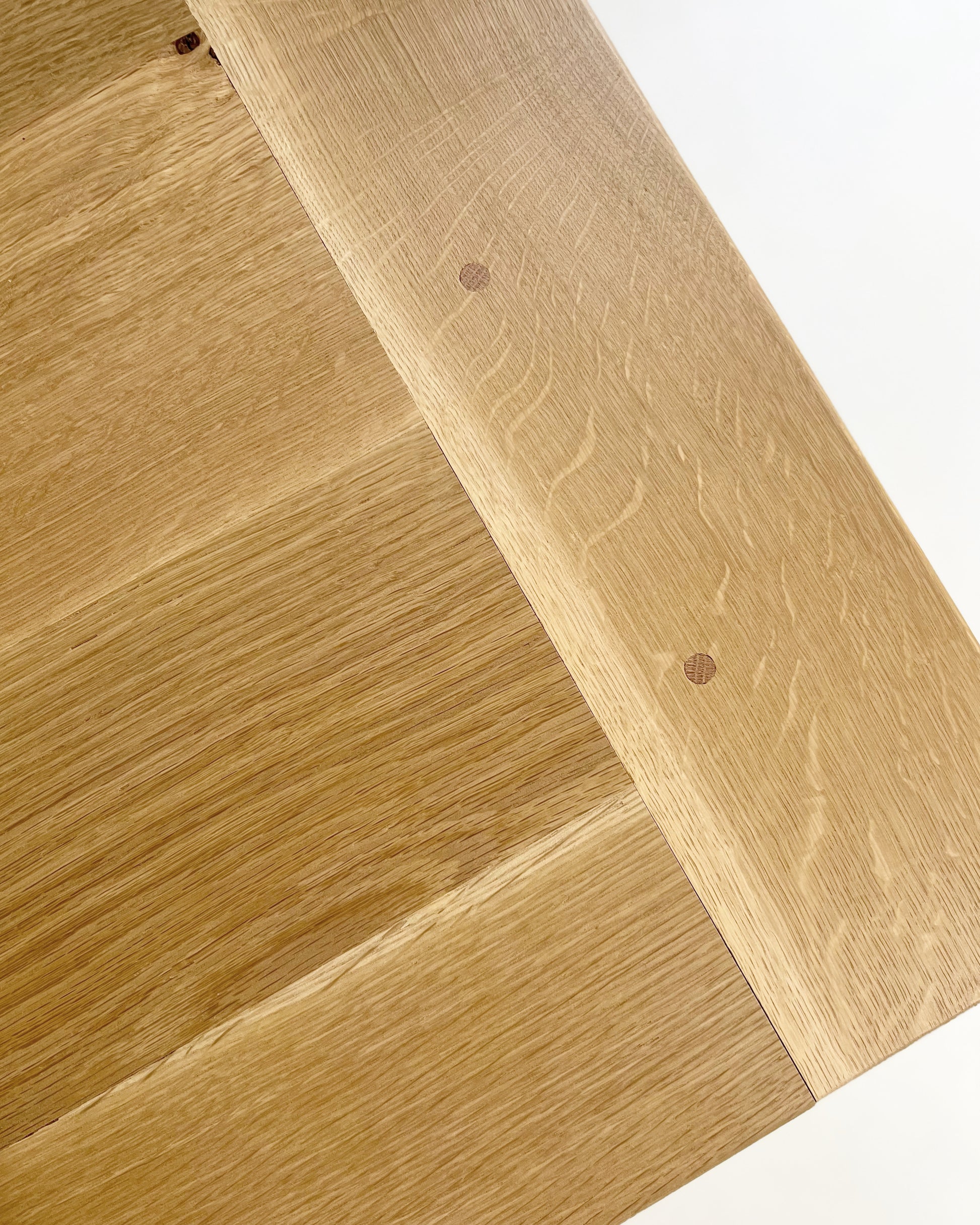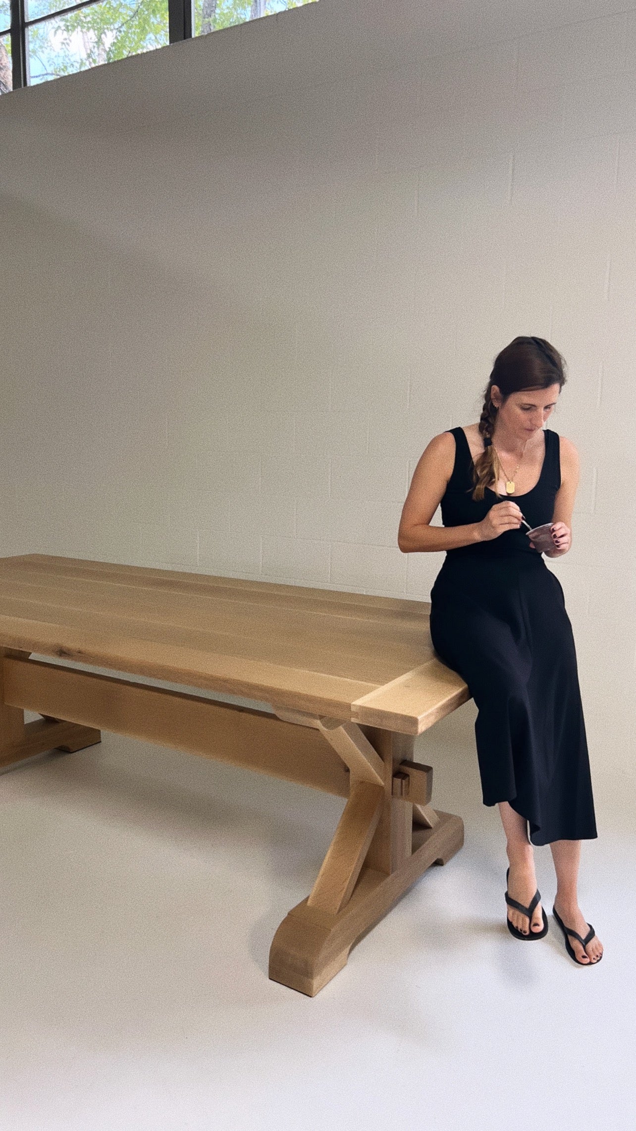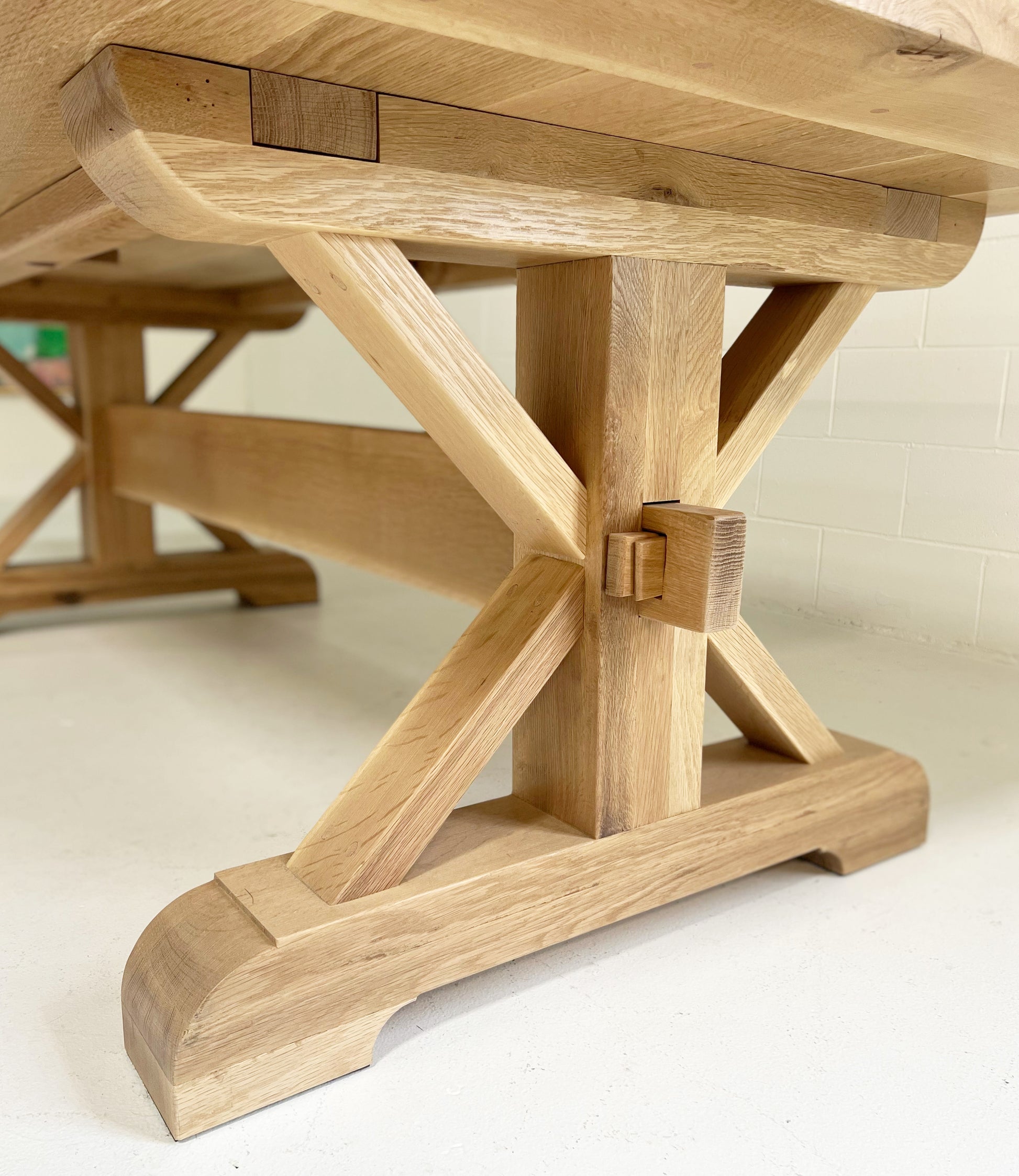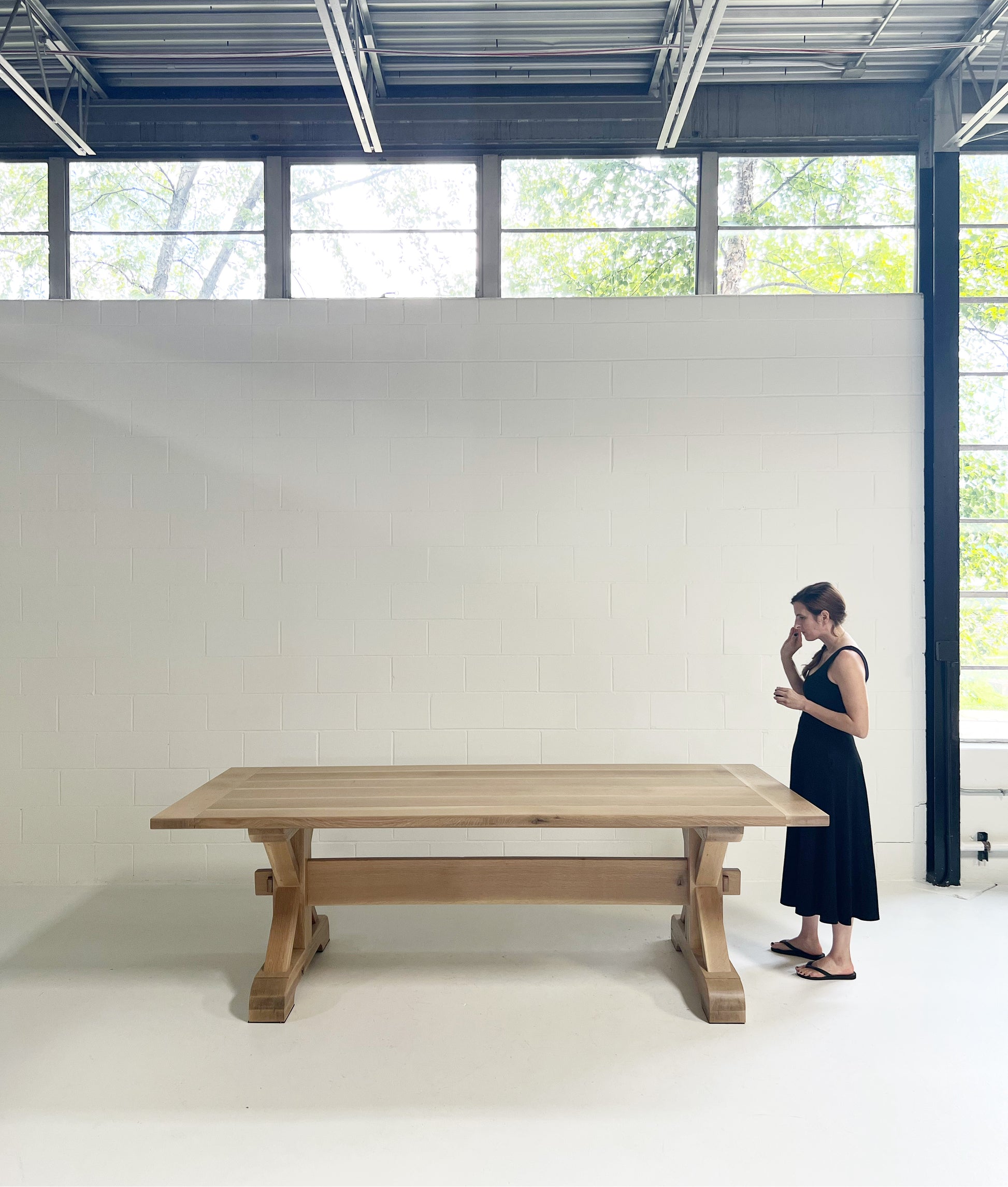 A classic trestle table designed and handcrafted by Forsyth master craftsmen. Our craftsmen use a beautiful, milled-down quarter sawn white oak for the 8 foot long Farmhouse Table. The table is made using traditional wood joinery, therefore no metal fasteners are used in construction. The stringer board is made with "through mortise and tenon" joinery with wedges to hold in place. From the classic bread board ends to the dovetailed support beams to the subtle grain of the white oak, the Farmhouse Table is made to last and made to be handed down to the next generation.