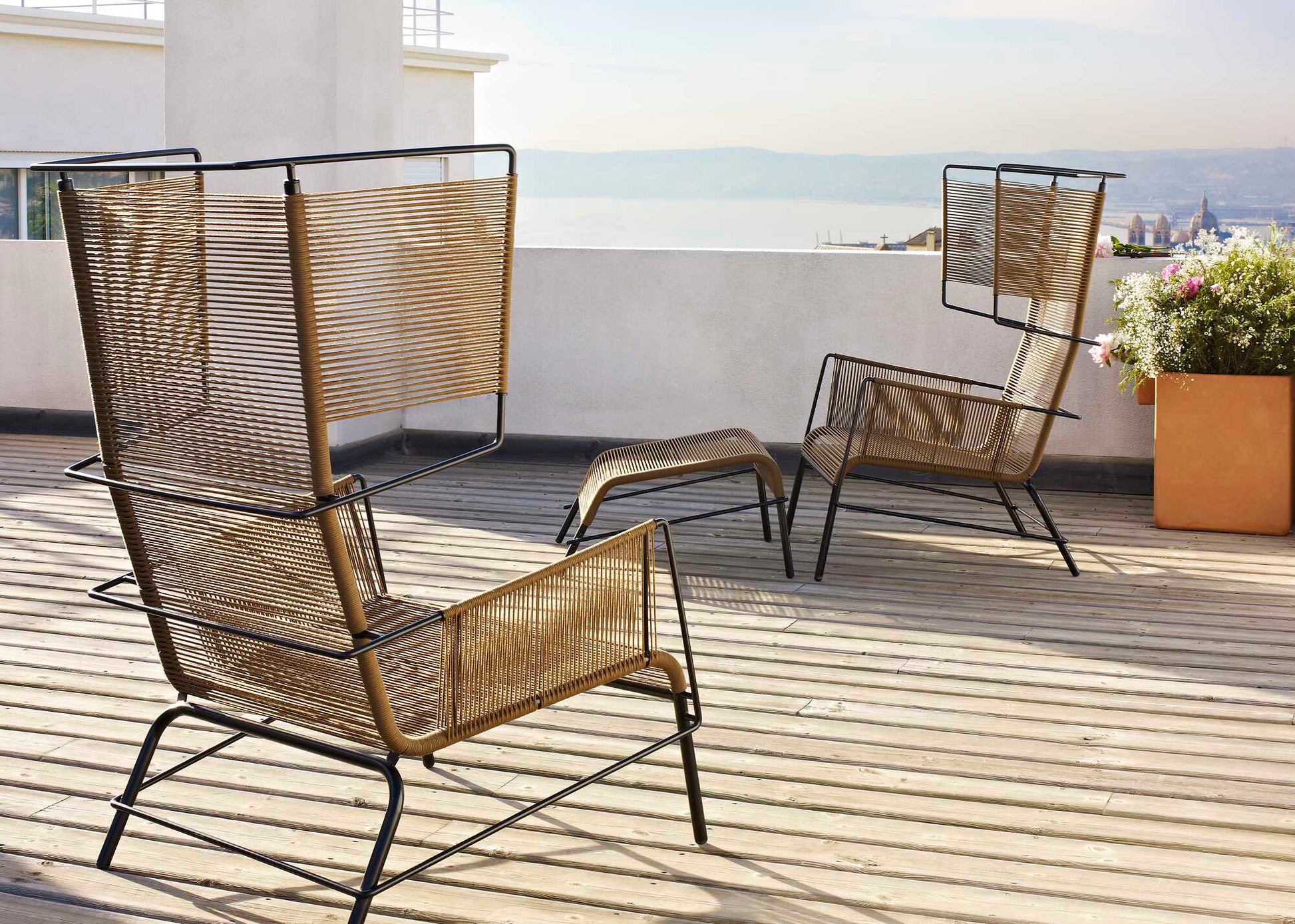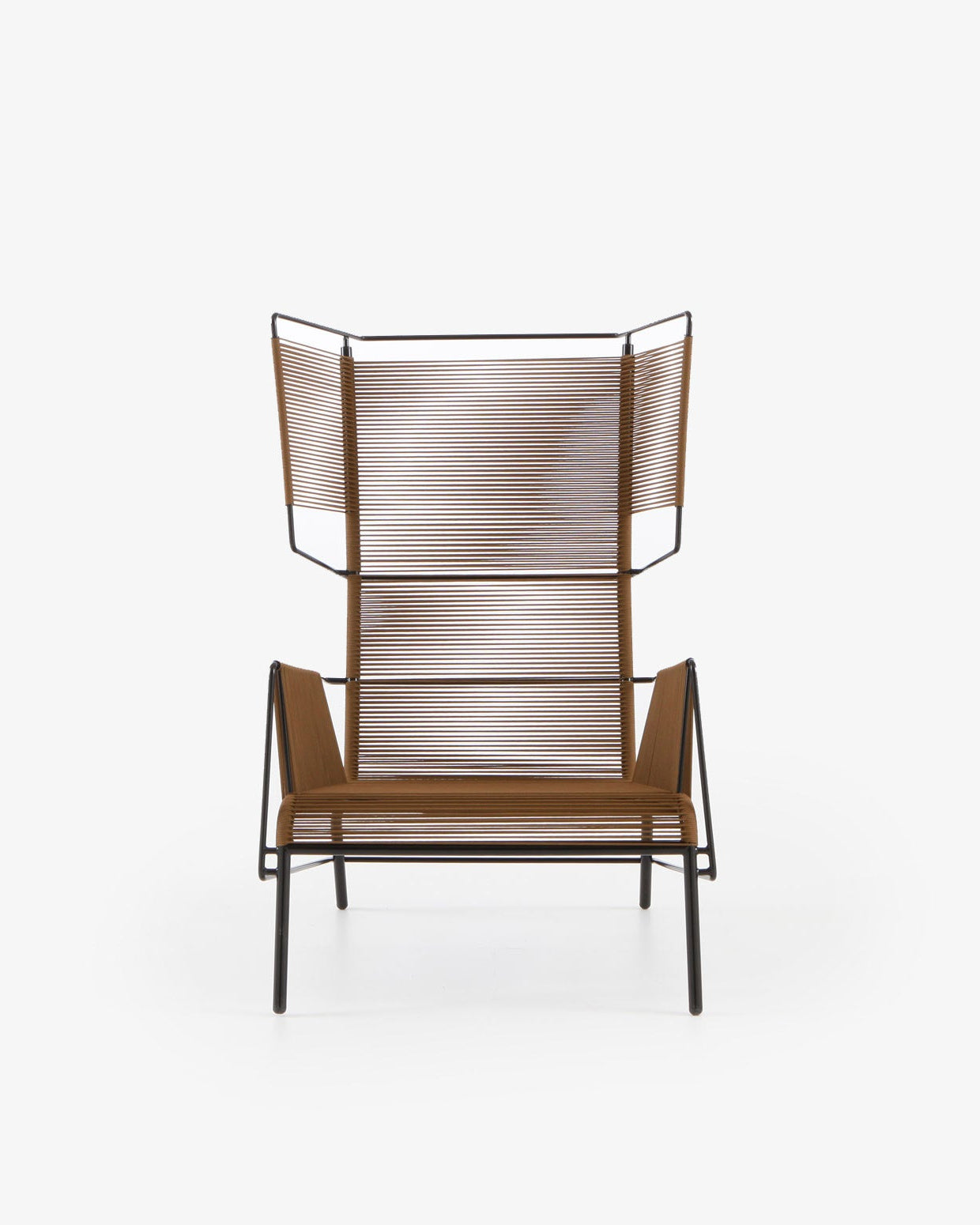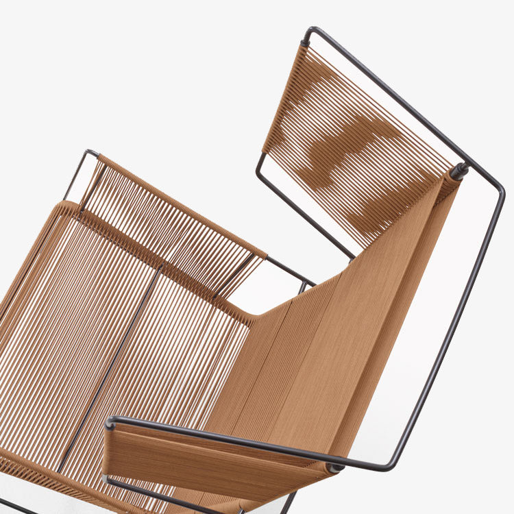 The inspiration for Fifty is taken from the Flag Halyard chair, the easy chair made from metal and rope that was created in 1950 in Denmark by Hans Wegner. The duo Dögg & Arnved designed a straight back not only to provide relaxation but also for reading (or watching TV). Side panels woven into each side of the headrest promote the feeling of privacy. The 350 meters of rope used are woven in black or brown onto a black steel frame. The Fifty chair has a sculptural presence in the room and will attract attention because of its unexpected juxtaposition of the minimalism of the design of its steel frame and the artistic warmth of the hand-woven rope. Fifty is also designed for outdoor use.